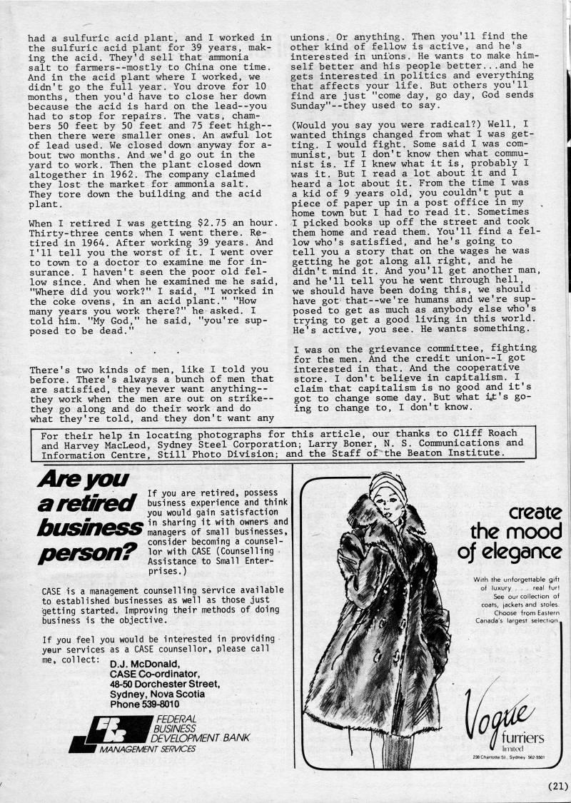 Published by Ronald Caplan on 1980/12/1 (434 reads)had a sulfuric acid plant, and I worked in the sulfuric acid plant for 39 years, mak? ing the acid. They'd sell that ammonia salt to farmers--mostly to China one time. And in the acid plant where I worked, we didn't go the full year. You drove for 10 months, then you'd have to close her down because the acid is hard on the lead--you had to stop for repairs. The vats, cham? bers 50 feet by 50 feet and 75 feet high-- then there were smaller ones. An awful lot of lead used. We closed down anyway for a- bout two months. And we'd go out in the yard to work. Then the plant closed down altogether in 1962. The company claimed they lost the market for ammonia salt. They tore down the building and the acid plant. When I retired I was getting $2.75 an hour. Thirty-three cents when I went there. Re? tired in 1964. After working 39 years. And I'll tell you the worst of it. I went over to town to a doctor to examine me for in? surance. I haven't seen the poor old fel? low since. And when he examined me he said, "Where did you work?" I said, "I worked in the coke ovens, in an acid plant." "How many years you work th're?" he asked. I told him. "My God," he said, "you're sup? posed to be dead." There's two kinds of men, like I told you before. There's always a bunch of men that are satisfied, they never want anything-- they work when the men are out on strike-- they go along and do their work and do what they're told, and they don't want any unions. Or anything. Then you'll find the other kind of fellow is active, and he's interested in unions. He wants to make him? self better and his people better...and he gets interested in politics and everything that affects your life. But others you'll find are just "come day, go day, God sends Sunday"--they used to say. (Would you say you were radical?) Well, I wanted things changed from what I was get? ting. I would fight. Some said I was com? munist, but I don't know then what commu? nist is. If I knew what it is, probably I was it. But I read a lot about it and I heard a lot about it. From the time I was a kid of 9 years old, you couldn't put a piece of paper up in a post office in my home town but I had to read it. Sometimes I picked books up off the street and took them home and read them. You'll find a fel? low who's satisfied, and he's going to tell you a story that on the wages he was getting he got along all right, and he didn't mind it. And you'll get another man, and he'll tell you he went through hell, we should have been doing this, we should have got that--we're humans and we're sup? posed to get as much as anybody else who's trying to get a good living in this world. He's active, you see. He wants something. I was on the grievance committee, fighting for the men. And the credit union--I got interested in that. And the cooperative store. I don't believe in capitalism. I claim that capitalism is no good and it's got to change some day. But what i,t's go? ing to change to, I don't know. For their help in locating photographs for this article, our thanks to Cliff Roach and Harvey MacLeod, Sydney Steel Corporation; Larry Boner, N. S. Communications and Information Centre, Still Photo Division; and the Staff of the Beaton Institute. Aneyou aretired Bmmm'mmmm'''m'm in sharing it with owners and M'U9MJrM • '9' managers of small businesses person' If you are retired, possess business experience and think you would gain satisfaction 9 lor with CASE (Counselling Assistance to Small Enter? prises.) CASE is a management counselling service available to established businesses as well as those just getting started. Improving their methods of doing business is the objective. If you feel you would be interested in providing yeur services as a CASE counsellor, please call me, collect: pj ',cDonald, CASE Co-ordinator, 48-50 Dorchester Street, Sydney, Nova Scotia Phone 539-8010 f FEDERAL J BUSINESS 1 DEVELOPMENT BANK r MANAGEMENT SERVICES create the mood of elegance With the unforgettable gift of luxury . . . real fur! i ourcollectr jackets and stoles Choose from Eastern largest selection (21)