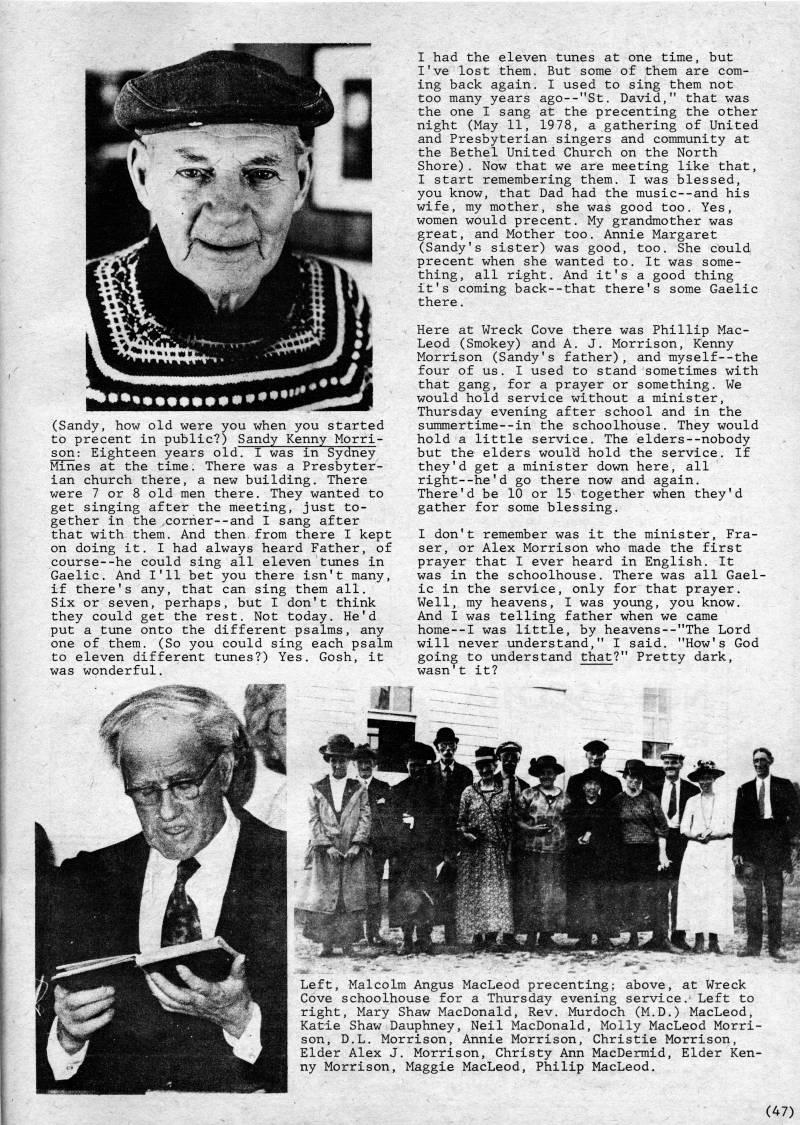 Published by Ronald Caplan on 1980/12/1 (598 reads)(Sandy, how old were you when you started to precent in public?) Sandy Kenny Morri? son: Eighteen years old. I was in Sydney Mines at the time. There was a Presbyter? ian church there, a new building. There were 7 or 8 old men there. They wanted to get singing after the meeting, just to? gether in the corner--and I sang after that with them. And then from there I kept on doing it. I had always heard Father, of course--he could sing all eleven tunes in Gaelic. And I'll bet you there isn't many, if there's any, that can sing them all. Six or seven, perhaps, but I don't think they could get the rest. Not today. He'd put a tune onto the different psalms, any one of them. (So you could sing each psalm to eleven different tunes?) Yes. Gosh, it was wonderful. I had the eleven tunes at one time, but I've lost them. But some of them are com? ing back again. I used to sing them not too many years ago--"St. David," that was the one I sang at the precenting the other night (May 11, 1978, a gathering of United and Presbyterian singers and community at the Bethel United Church on the North Shore). Now that we are meeting like that, I start remembering them. I was blessed, you know, that Dad had the music--and his wife, my mother, she was good too. Yes, women would precent. My grandmother was great, and Mother too. Annie Margaret (Sandy's sister) was good, too. She could precent when she wanted to. It was some? thing, all right. And it's a good thing it's coming back--that there's some Gaelic there. Here at Wreck Cove there was Phillip Mac? Leod (Smokey) and A. J. Morrison, Kenny Morrison (Sandy's father), and myself--the four of us. I used to stand sometimes with that gang, for a prayer or something. We would hold service without a minister, Thursday evening after school and in the summertime--in the schoolhouse. They would hold a little service. The elders--nobody but the elders would hold the service. If they'd get a minister down here, all right--he'd go there now and again. There'd be 10 or 15 together when they'd gather for some blessing. I don't remember was it the minister, Fra? ser, or Alex Morrison who made the first prayer that I ever heard in English. It was in the schoolhouse. There was all Gael? ic in the service, only for that prayer. Well, my heavens, I was young, you know. And I was telling father when we came home--I was little, by heavens--"The Lord will never understand," I said. "How's God going to understand that?" Pretty dark, wasn't it? Left, Malcolm Angus MacLeod precenting; above, at Wreck Cove schoolhouse for a Thursday evening service. Left to right, Mary Shaw MacDonald, Rev. Murdoch (M.D.) MacLeod, Katie Shaw Dauphney, Neil MacDonald, Molly MacLeod Morri? son, D.L. Morrison, Annie Morrison, Christie Morrison, Elder Alex J. Morrison, Christy Ann MacDermid, Elder Ken? ny Morrison, Maggie MacLeod, Philip MacLeod. (47)
