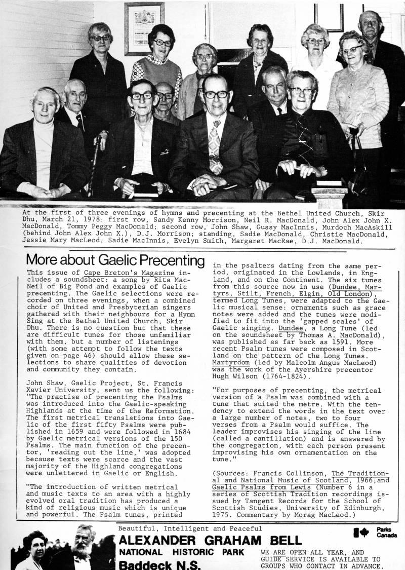 Published by Ronald Caplan on 1980/12/1 (312 reads)'' i = "./: -i'.jB ??p 1 "''l/ ' <''lH 4P (-'f*' At the first of three evenings of hymns and precenting at the Bethel United Church, Skir Dhu, March 21, 1978: first row, Sandy Kenny Morrison, Neil R. MacDonald, John Alex John X. MacDonald, Tommy Peggy MacDonald; second row,' John Shaw, Gussy Maclnnis, Murdoch MacAskill (behind John Alex John X.), D.J. Morrison; standing, Sadie MacDonald, Christie MacDonald, Jessie Mary MacLeod, Sadie Maclnnis, Evelyn Smith, Margaret MacRae, D.J. MacDonald, More about Gaelic Precenting This issue of Cape Breton's Magazine in? cludes a soundsheet: a song by Rita Mac? Neil of Big Pond and examples of Gaelic precenting. The Gaelic selections were re? corded on three evenings, when a combined choir of United and Presbyterian singers gathered with their neighbours for a H3niin Sing at the Bethel United Church, Skir Dhu, There is no question but that these are difficult tunes for those unfamiliar with them, but a number of listenings (with some attempt to follow the texts given on page 46) should allow these se? lections to share qualities of devotion and community they contain. John Shaw, Gaelic Project, St. Francis Xavier University, sent us the following: "The practise of precenting the Psalms was introduced into the Gaelic-speaking Highlands at the time of the Reformation. The first metrical translations into Gae? lic of the first fifty Psalms were pub? lished in 1659 and were followed in 1684 by Gaelic metrical versions of the 150 Psalms. The main function of the precen? tor, 'reading out the line,' was adopted because texts were scarce and the vast majority of the Highland congregations were unlettered in Gaelic or English. "The introduction of written metrical and music texts to an area with a highly evolved oral tradition has produced a kind of religious music which is unique and powerful, The Psalm tunes, printed in the psalters dating from the same per? iod, originated in the Lowlands, in Eng? land, and on the Continent, The six tunes from this source now in use (Dundee, Mar? tyrs, Stilt, French, Elgin, Old London)"";~ termed Long Tunes, were adapted to the Gae? lic musical sense: ornaments such as grace notes were added and the tunes were modi? fied to fit into the 'gapped scales' of Gaelic singing, Dundee, a Long Tune (led on the soundsheet by Thomas A. MacDonald), was published as far back as 1591. More recent Psalm tunes were composed in Scot? land on the pattern of the Long Tunes. Martyrdom (led by Malcolm Angus MacLeod) was the work of the Ayershire precentor Hugh Wilson (1764-1824). "For purposes of precenting, the metrical version of "a Psalm was combined with a tune that suited the metre. With the ten? dency to extend the words in the text over a large number of notes, two to four verses from a Psalm would suffice. The leader improvises his singing of the line (called a cantillation) and is answered by the congregation, with each person present improvising his own ornamentation on the tune." (Sources: Francis Collinson, The Tradition? al and National Music of Scotland, 1966;and Gaelic Psalms from Lewis (Number 6 in a series of Scottish Tradition recordings is? sued by Tangent Records for the School of Scottish Studies, University of Edinburgh, 1975. Commentary by Morag MacLeod.) Beautiful, Intelligent and Peaceful ALEXANDER GRAHAM BELL NATIONAL HISTORIC PARK Baddeck N.S. ! WE ARE OPEN ALL YEAR, AND GUIDE SERVICE IS AVAILABLE TO GROUPS WHO CONTACT IN ADVANCE.