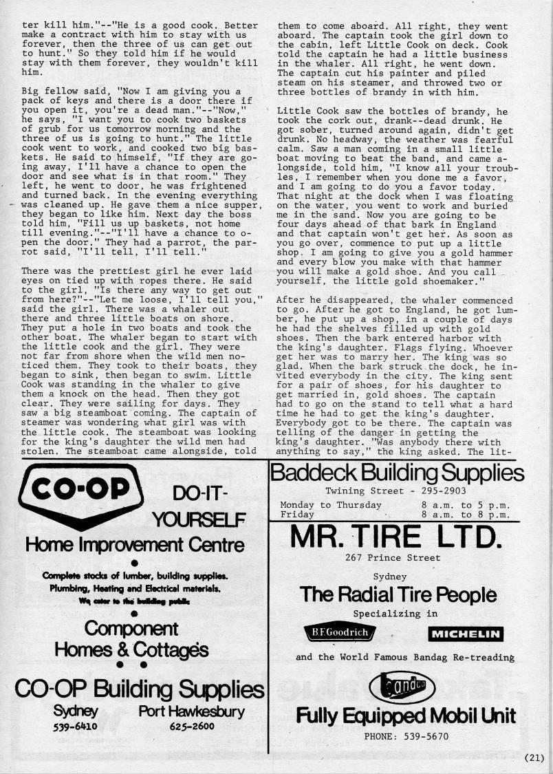 ter kill him."--"He is a good cook. Better make a contract with him to stay with us forever, then the three of us can get out to hunt." So they told him if he would stay with them forever, they wouldn't kill him. Big fellow said, "Now I am giving you a pack of keys and there is a door there if you open it, you're a dead man."--"Now," he says, "I want you to cook two baskets of grub for us tomorrow morning and the three of us is going to hunt." The little cook went to work, and cooked two big bas? kets. He said to himself, "If they are go? ing away, I'll have a chance to open the door and see what is in that room." They left, he went to door, he was frightened and turned back. In the evening everything was cleaned up. He gave them a nice supper, they began to like him. Next day the boss told him, "Fill us up baskets, not home till evening."--"I'11 have a chance to o- pen the door." They had a parrot, the par? rot said, "I'll tell, I'll tell." There was the prettiest girl he ever laid eyes on tied up with ropes there. He said to the girl, "Is there any way to get out from here?"--"Let me loose, I'll tell you," said the girl. There was a whaler out there and three little boats on shore. They put a hole in two boats and took the other boat. The whaler began to start with the little cook and the girl. They were not far from shore when the wild men no? ticed them. They took to their boats, they began to sink, then began to swim. Little Cook was standing in the whaler to give them a knock on the head. Then they got clear. They were sailing for days. They saw a big steamboat coming. The captain of steamer was wondering what girl was with the little cook. The steamboat was looking for the king's daughter the wild men had stolen. The steamboat came alongside, told them to come aboard. All right, they went aboard. The captain took the girl down to the cabin, left Little Cook on deck. Cook told the captain he had a little business in the whaler. All right, he went down. The captain cut his painter and piled steam on his steamer, and throwed two or three bottles of brandy in with him. Little Cook saw the bottles of brandy, he took the cork out, drank--dead drunk. He got sober, turned around again, didn't get drunk. No headway, the weather was fearful calm. Saw a man coming in a small little boat moving to beat the band, and came a- longside, told him, "I know all your troub? les, I remember when you done me a favor, and I am going to do you a favor today. That night at the dock when I was floating on the water, you went to work and buried me in the sand. Now you are going to be four days ahead of that bark in England and that captain won't get her. As soon as you go over, commence to put up a little shop • I am going to give you a gold hammer and every blow you make with that hammer you will make a gold shoe. And you call ,. yourself, the little gold shoemaker." After he disappeared, the whaler commenced to go. After he got to England, he got lum? ber, he put up a shop, in a couple of days he had the shelves filled up with gold shoes. Then the bark entered harbor with the king's daughter. Flags flying. Whoever get her was to marry her. The king was so glad. When the bark struck.the dock, he in? vited everybody in the city. The king sent for a pair of shoes, for his daughter to get married in, gold shoes. The captain had to go on the stand to tell what a hard time he had to get the king's daughter. Everybody got to be there. The captain was telling of the danger in getting the king's daughter. "Was anybody there with anything to say," the king asked. The lit- CO-OP DO-IT- YOURSELF Home Improvement Centre ComplaK