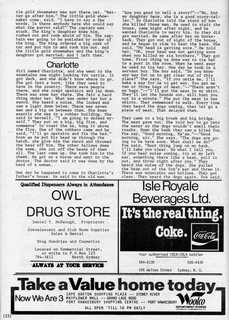 tie gold shoemaker was not there yet. "Bet? ter go after him." The little gold shoe? maker come, said, "I have to say a few words. Is there anybody here who could say what the parrot said?" The captain was stuck. The king's daughter knew him, rushed out and took ahold of him. The cap? tain was going to be punished by order of the king. The king ordered a big cask of tar and put him in and took him out o And the little gold shoemaker and the king's daughter got married. And I left then. Charlotte Girl named Charlotte', and she went to the mountains one night looking for cattle. It got dark, and she didn't know where to go. She got into a bam, like they used to have in the country. There were people there, and she crept upstairs and lay down. There was some hay there. She felt a hard thing under her. What was under her but a sword. She heard a noise. She looked and saw a light down below. There was seven men and a big ox between them. She knew exactly she was in a robber building. She said to herself, "I am going to defend my? self." They put on a big, big fire, and commence' to roast the ox, hung it above the fire. One of the robbers came and he said, "I'll go upstairs and fix the bed." Soon as he put his head up through the hatch, she give him the sword and throwed the head off him. The other fellows done the same, she cut off the heads of them all. The last came up. She took him in the cheek. He got on a horse and went to the doctor. The doctor said it was done by the hand of a woman. One day he happened to come to Charlotte's father's house. He said to the old man. "Are you good to tell a story?"--"No, but my daughter here, she is a good story-tel? ler." So Charlotte told the story of how she killed those men. He used to visit the house, came night after night, and he wanted Charlotte to marry him. So they did get married. He came after her on horse? back. They got out of sight of the house, and he began to ride to beat the band. She said, "My head is getting sore." He told her, "Oh, your head was not getting sore when you killed my six brothers." They got home. First thing he done was to tie her to a post in the room. When he went away he used to tie her. One day he took in a servant boy. The boy said, "Do you know any way for us to get clear out of this place?" She says, "If you untie me, I'll make a way for us to get way. You get me two or three bags of meat."--"There aren't no bags."--"I'11 put the meat in my skirt. They'll let the hounds out, will hunt you out in a minute." She put the meat in two skirts. They commenced to walk. Every time they heard the dogs coming, they let go a piece of meat. That delayed them. They came to a big brook and big bridge. The meat gave out. She told boy to go into the water so the dogs wouldn't smell their tracks. Down the bank they saw a blind fox. Fox say, "Good morning. Ma'am."--"Good morning, sir." She says, "The dogs are go? ing to be here soon. What shall we do?" Fox said, "Best thing jump on my back, I'll take you clear. Do what I tell you. If you hear noise coming, try at my left ear, something there like a bean, pull it out, and throw right after you." They heard the noise of the dogs. She pulled the bean out of the fox's ear and threw it. There was mountains and hollows. They got clear. They heard the dogs again. Fox saijd. Qoalified Du'pensers Always in Att'idaaoe OWL DRUG STORE Daniel T. McKeough, Proprietor Convalescent and Sick Room Supplies Sales & Rental Drug Sundries and Cosmetics Located on Commercial Street, or write to P.O.Box 125 794-3611 North Sydney ALWAn AT tODR 8BB?1CB Isle Royale Beverages Ltd. It's the realthu'. (kike. '''e& Your authorized COCA-COLA bottler 564-8130 526-4439 245 Welton Street Sydney, N. S. I .Take a Value home today- .... ' CAPE BRETON SHOPPING PLAZA -- SYDNEY RIVER ''A 0IKt I Now We Are 3 Mayflower mall -- grand lake road M%nnlrn I IMWVV VY'/'IV'W pQj'' HAWKESBURY SHOPPING CENTRE • PORT HAWKESBURY YJOOICO I ' ALL OPEN 'TILL 10 PM DAILY P'.!:!yoTy!5i'oTJ.TPc'',! J|
