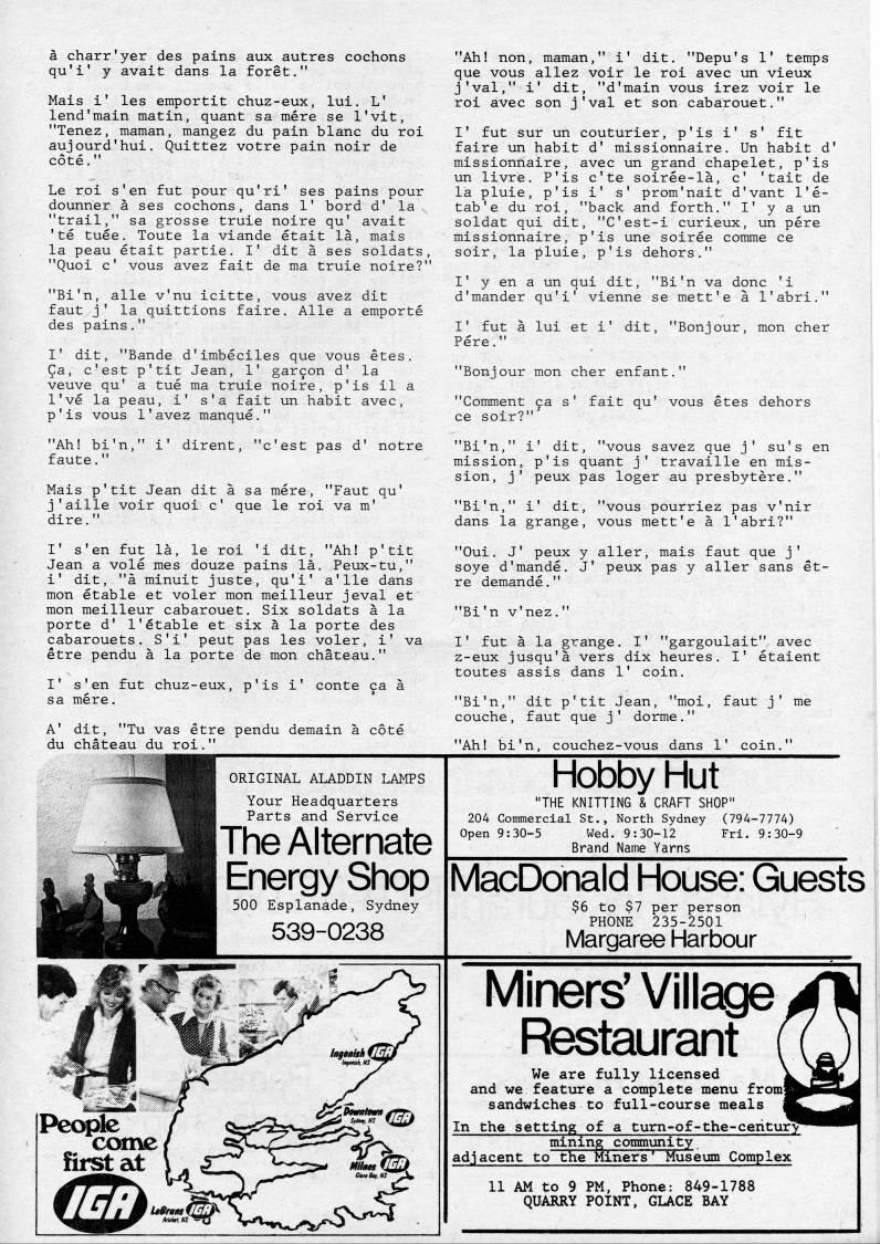 Published by Ronald Caplan on 1981/8/1 (307 reads)a charr'yer des pains aux autres cochons qu'i' y avait dans la foret." Mais i' les emportit chuz-eux, lui. L' lend'main matin, quant sa mere se I'vit, "Tenez, maman, mangez du pain blanc du roi aujourd'hui. Quittez votre pain noir de cote." Le roi s'en fut pour qu'ri' ses pains pour dounner a ses cochons, dans 1' bord d' la "trail," sa grosse truie noire qu' avait 'te tuee. Toute la viande etait la, mais la peau etait partie. I' dit a ses soldats, "Quoi c' vous avez fait de ma truie noire?" "Bi'n, alle v'nu icitte, vous avez dit faut j' la quittions faire. Alle a emporte des pains." I' dit, "Bande d'imbeciles que vous etes. Ca, c'est p'tit Jean, 1' garcon d' la veuve qu' a tue ma truie noire, p'is il a I've la peau, i' s'a fait un habit avec, p'is vous I'avez manque." "Ah! non, maman," i' dit. "Depu's 1' temps que vous allez voir le roi avec un vieux j'val," i' dit, "d'main vous irez voir le roi avec son j'val et son cabarouet." I' fut sur un couturier, p'is i' s' fit faire un habit d' missionnaire. Un habit d' missionnaire, avec un grand chapelet, p'is un livre. P'is c'te soiree-la, c' 'tait de la pluie, p'is i' s' prom'nait d'vant I'e- tab'e du roi, "back and forth." I' y a un soldat qui dit, "C'est-i curieux, un pere missionnaire, p'is une soiree comme ce soir, la pluie, p'is dehors." I' y en a un qui dit, "Bi'n va done 'i d'mander qu'i' vienne se mett'e a 1'abri." I' fut Pere." a lui et i' dit, "Bonjour, mon cher "Ah! bi'n," faute." i' dirent, "c'est pas d' notre Mais p'tit Jean dit a sa mere, "Faut qu' j'aille voir quoi c' que le roi va m' dire." I' s' en fut la, le roi 'i dit, "Ah! p'tit Jean a vole mes douze pains la. Peux-tu," i' dit, "a minuit juste, qu'i' a'lie dans mon etable et voler mon meilleur jeval et mon meilleur cabarouet. Six soldats a la porte d' 1'etable et six a la porte des cabarouets. S'i' peut pas les voler, i' va etre pendu a la porte de mon chateau." I' s'en fut chuz-eux, sa mere. p xs 1 conte ca a A' dit, "Tu vas etre pendu demain a cote du chateau du roi." ORIGINAL ALADDIN LAMPS Your Headquarters Parts and Service The Alternate Energy Shop "Bonjour mon cher enfant." "Comment ca s' fait qu' vous etes dehors ce soir?" "Bi'n," i' dit, "vous savez que j' su's en mission, p'is quant j' travaille en mis? sion, j' peux pas loger au presbytere." "Bi'n," i' dit, "vous pourriez pas v'nir dans la grange, vous mett'e a I'abri?" "Oui. J' peux y aller, mais faut que j' soye d'mande. J' peux pas y aller sans et? re demande." "Bi'n v'nez." I' fut a la grange. I' "gargoulait" avec z-eux jusqu'a vers dix heures. I' etaient toutes assis dans 1' coin. "Bi'n," dit p'tit Jean, "moi, faut j' me couche, faut que j' dorme." "Ah! bi'n, couchez-vous dans 1' coin." Hobby Hut "THE KNITTING & CRAFT SHOP" 204 Commercial St., North Sydney (794-7774) Open 9:30-5 Wed. 9:30-12 Fri. 9:30-9 Brand Name Yarns MacDonald House: Guests $6 to $7 per person PHONE 235-2501 Margaree Harbour Miners' Village Restaurant We are fully licensed and we feature a complete menu from' sandwiches to full-course meals | In the setting of a turn-of-the-cehtur' mining community, adjacent to the Miners' Museum Complex 11 AM to 9 PM, Phone: 849-1788 QUARRY POINT, GLACE BAY