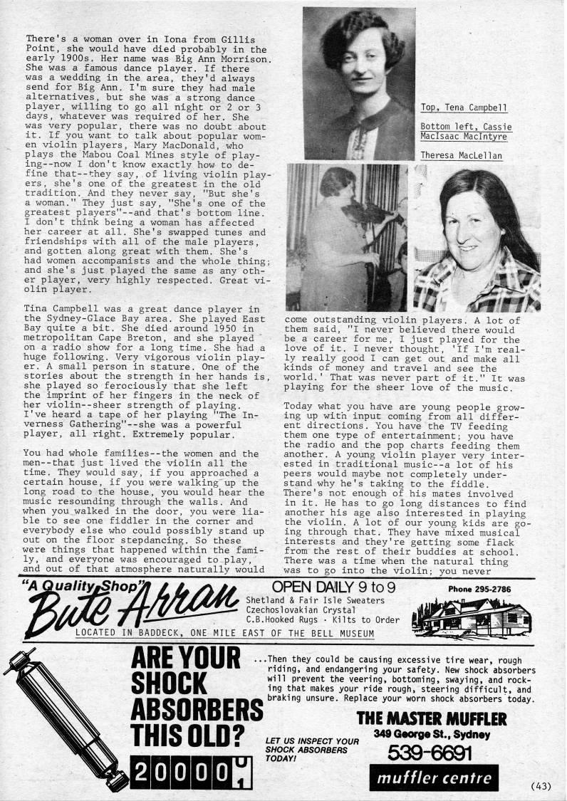 There's a woman over in lona from Gillis Point, she would have died probably in the early 1900s. Her name was Big Ann Morrison. She was a famous dance player. If there was a wedding in the area, they'd always send for Big Ann. I'm sure they had male alternatives, but she was a strong dance player, willing to go all night or 2 or 3 days, whatever was required of her. She was very popular, there was no doubt about it. If you want to talk about popular wom? en violin players, Mary MacDonald, who plays the Mabou Coal Mines style of play- ing--now I don't know exactly how to de? fine that--they say, of living violin play? ers, she's one of the greatest in the old tradition. And they never say, "But she's a woman." They just say, "She's one of the greatest players"--and that's bottom line. I don't thinic being a woman has affected her career at all. She's swapped tunes and friendships with all of the male players, and gotten along great with them. She's had women accompanists and the whole thing; and she's just played the same as any oth? er player, very highly respected. Great vi? olin player. Tina Campbell was a great dance player in the Sydney-Glace Bay area. She played East Bay quite a bit. She died around 1950 in metropolitan Cape Breton, and she played on a radio show for a long time. She had a huge following. Very vigorous violin play? er. A small person in stature. One of the stories about the strength in her hands is, she played so ferociously that she left the imprint of her fingers in the neck of her violin--sheer strength of playing. I've heard a tape of her playing "The In? verness Gathering"--she was a powerful player, all right. Extremely popular. You had whole families--the women and the men--that just lived the violin all the time. They would say, if you approached a certain house, if you were walking up the long road to the house, you would hear the music resounding through the walls. And when you walked in the door, you were lia? ble to see one fiddler in the corner and everybody else who could possibly stand up out on the floor stepdancing. So these were things that happened within the fami? ly, and everyone was encouraged to play, and out of that atmosphere naturally would come outstanding violin players. A lot of them said, "I never believed there would be a career for me, I just played for the love of it. I never thought, 'If I'm real? ly really good I can get out and make all kinds of money and travel and see the world.' That was never part of it." It was playing for the sheer love of the music. Today what you have are young people grow? ing up with input coming from all differ? ent directions. You have the TV feeding them one type of entertainment; you have the radio and the pop charts feeding them another. A young violin player very inter? ested in traditional music--a lot of his peers would maybe not completely under? stand why he's taking to the fiddle. There's not enough of his mates involved in it. He has to go long distances to find another his age also interested in playing the violin. A lot of our young kids are go? ing through that. They have mixed musical interests and they're getting some flack from the rest of their buddies at school. There was a time when the natural thing was to go into the violin; you never LOCATED BADDECK, OPEN DAILY 9 to 9 Shetland & Fair Isle Sweaters Czechoslovakian Crystal C.B.Hooked Rugs • Kilts to Order EAST OF THE BELL MUSEUM Phone 295-2786 AREYOUR SHOCK ABSORBERS THIS OLO? ...Then they could be causing excessive tire wear, rough riding, and endangering your safety. New shock absorbers will prevent the veering, bottoming, swaying, and rock? ing that makes your ride rough, steering difficult, and braking unsure. Replace your worn shock absorbers today. LET US INSPECT YOUR SHOCK ABSORBERS TODAY! THE MASTER MUFFLffi 349 George St., Sydney 539-6691 muffler centre (43)