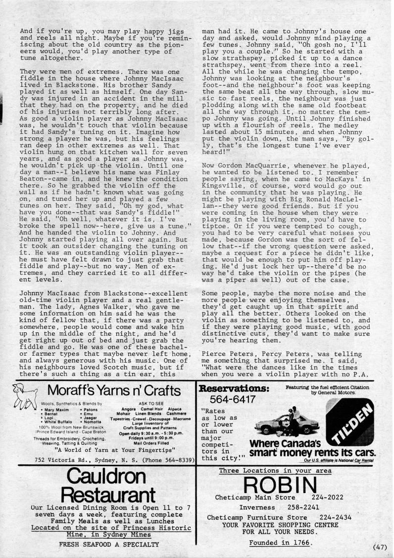 And if you're up, you may play happy jigs and reels all night. Maybe if you're remin? iscing about the old country as the pion? eers would, you'd play another type of tune altogether. They were men of extremes. There was one fiddle in the house where Johnny Maclsaac lived in Blackstone. His brother Sandy played it as well as himself. One day San? dy was injured in an accident in the mill that they had on the property, and he died of his injuries not terribly long after. As good a violin player as Johnny Maclsaac was, he wouldn't touch that violin because it had Sandy's tuning on it. Imagine how strong a player he was, but his feelings ran deep in other extremes as well. That violin hung on that kitchen wall for seven years, and as good a player as Johnny was, he wouldn't pick up the violin. Until one day a man--I believe his name was Finlay Beaton--came in, and he knew the condition there. So he grabbed the violin off the wall as if he hadn't known what was going on, and tuned her up and played a few tunes on her. They said, "Oh my god, what have you done--that was Sandy's fiddle!" He said, "Oh well, whatever it is, I've broke the spell now--here, give us a tune." And he handed the violin to Johnny. And Johnny started playing all over again. But it took .an outsider changing the tuning on it. He was an outstanding violin player-- he must have felt drawn to just grab that fiddle and play--but no way. Men of ex? tremes, and they carried it to all differ? ent levels. Johnny Maclsaac from Blackstone--excellent old-time violin player and a real gentle? man. The lady, Agnes Walker, who gave me some information on him said he was the kind of fellow that, if there was a party somewhere, people would come and wake him up in the middle of the night, and he'd get right up out of bed and just grab the fiddle and go. He was one of these bachel? or farmer types that maybe never left home, and always generous with his music. One of his neighbours loved Scotch music, but if there's such a thing as a tin ear, this man had it. He came to Johnny's house one day and asked, would Johnny mind playing a few tunes. Johnny said, "Oh gosh no, I'll play you a couple.-" So he started with a slow strathspey, picked it up to a dance strathspey, went from there into a reel. All the while he was changing the tempo, Johnny was looking at the neighbour's foot--and the neighbour's foot was keeping the same beat all the way through, slow mu? sic to fast reels, the neighbour was just plodding along with the same old footbeat all the way through it, no matter the tem? po Johnny was going. Until Johnny finished up with a flourish of reels. The medley lasted about 15 minutes, and when Johnny put the violin down, the man says, "By gol? ly, that's the longest tune I've ever heard!" Now Gordon MacQuarrie, whenever he played, he wanted to be listened to. I remember people saying, when he came to MacKays' in Kingsville, of course, word would go out in the community that he was playing. He might be playing with Big Ronald MacLel- lan--they were good friends. But if you were coming in the house when they were playing in the living room, you'd have to tiptoe. Or if you were tempted to cough, you had to be very careful what noises you made, because Gordon was the sort of fel? low that--if the wrong question were asked, maybe a request for a piece he didn't like, that would be enough to put him off play? ing. He'd just lock her up--there'd be no way he'd take the violin or the pipes (he was a piper as well) out of the case. Some people, maybe the more noise and the more people were enjoying themselves, they'd get caught up in that spirit and play all the better. Others looked on the violin as something to be listened to, and if they were playing good music, with good distinctive cuts, they'd want to make sure you're hearing them. Pierce Peters, Percy Peters, was telling me something that surprised me. I said, "What were the dances like in the times when you were a violin player with no P.A. Moraff's Yarns n' Crafts Wools, Synthetics & Blends by • Mary Maxim • Palons ASK TO SEE Angora Camel Hair Alpaca Mohair Linen Blends Cashmere • Lopl 'Jaeger Tapestries - Crewel-OecoupageMacrame • White Buffalo • Nomotta Large Inventory of 100% Wool from New Brunswick Craft Supplies and Patterns iPrmce Edward Island-Cape Breton Open daily 9:30a.m. - 5:30 p.m. Threads for Embroidery, Crocheting. Fridays until 9:00 p.m. Weaving, Tatting & Quilting Mail Orders Filled "A World of Yarn at Your Fingertips" 752 Victoria Rd., Sydney, N. S. (Phone 564-8339) Tt#>JSP n/ati-QflS " Featuring the fuel e??Qcient Citation A??0VA w A1M.WAMV • 'y General Motors. 564-6417 "Rates as low as or lower than our major competi? tors in this city Where Canada's . • smart money rents Its cars. Our U.S. affiliate is National Car Rental Cauldron Ftestaurant Our Licensed Dining Room is Open 11 to 7 seven days a week, featuring complete Family Meals as well as Lunches Located on the site of Princess Historic Mitie. in Sydney Mines" FRESH SEAFOOD A SPECIALTY Three Locations in your area ROBIN Cheticamp Main Store 224-2022 Inverness 258-2241 Cheticamp Furniture Store 224-2434 YOUR FAVORITE SHOPPING CENTRE FOR ALL YOUR NEEDS. Founded in 1766. (47)