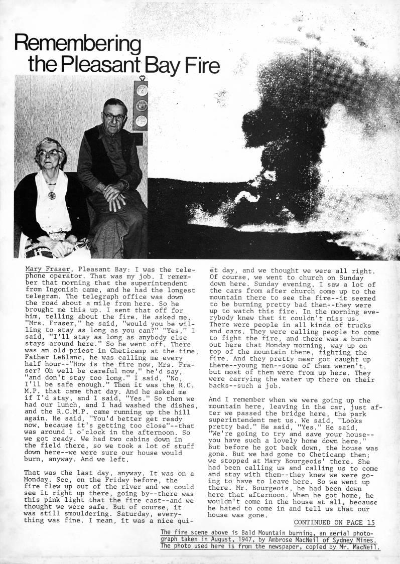Published by Ronald Caplan on 1981/8/1 (525 reads)Remembering the Pleasant Bay Fire Mary Fraser, Pleasant Bay: I was the tele- phone operator. That was my j ob. I remem? ber that morning that the superintendent from Ingonish came, and he had the longest telegram. The telegraph office was down the road about a mile from here. So he brought me this up. I sent that off for him, telling about the fire. He asked me, "Mrs. Fraser," he said, "would you be wil? ling to stay as long as you can?" "Yes," I said, "I'll stay as long as anybody else stays around here." So he went off. There was an old priest in Cheticamp at the time, Father LeBlanc, he was calling me every half hour--"How is the fire now, Mrs. Fra? ser? Oh well be careful now," he'd say, "and don't stay too long." I said, "No, I'll be safe enough." Then it was the R.C. M.P. that came that day. And he asked me if I'd stay, and I said, "Yes." So then we had our lunch, and I had washed the dishes, and the R.C.M.P. came running up the hill again. He said, "You'd better get ready now, because it's getting too close"--that was around 1 o'clock in the afternoon. So we got ready. We had two cabins down in the field there, so we took a lot of stuff down here--we were sure our house would bum, anyway. And we left. That was the last day, anyway. It was on a Monday. See, on the Friday before, the fire flew up out of the river and we could see it right up there, going by--there was this pink light that the fire cast--and we thought we were safe. But of course, it was still smouldering. Saturday, every? thing was fine. I mean, it was a nice qui? et day, and we thought we were all right. Of course, we went to church on Sunday down here. Sunday evening, I saw a lot of the cars from after church come up to the mountain there to see the fire--it seemed to be burning pretty bad then--they were up to watch this fire. In the morning eve? rybody knew that it couldn't miss us. There were people in all kinds of trucks and cars. They were calling people to come to fight the fire, and there was a bunch out here that Monday morning, way up on top of the mountain there, fighting the fire. And they pretty near got caught up there--young men--some of them weren't, but most of them were from up here. They were carrying the water up there on their backs--such a job. And I remember when we were going up the mountain here, leaving in the car, just af? ter we passed the bridge here, the park superintendent met us. We said, "Looks pretty bad," He said, "Yes." He said, "We're going to try and save your house-- you have such a lovely home down here." But before he got back down, the house was gone. But we had gone to Cheticamp then; we stopped at Mary Bourgeois' there. She had been calling us and calling us to come and stay with them--they knew we were go? ing to have to leave here. So we went up there. Mr. Bourgeois, he had been down here that afternoon. When he got home, he wouldn't come in the house at all, because he hated to come in and tell us that our house was gone,