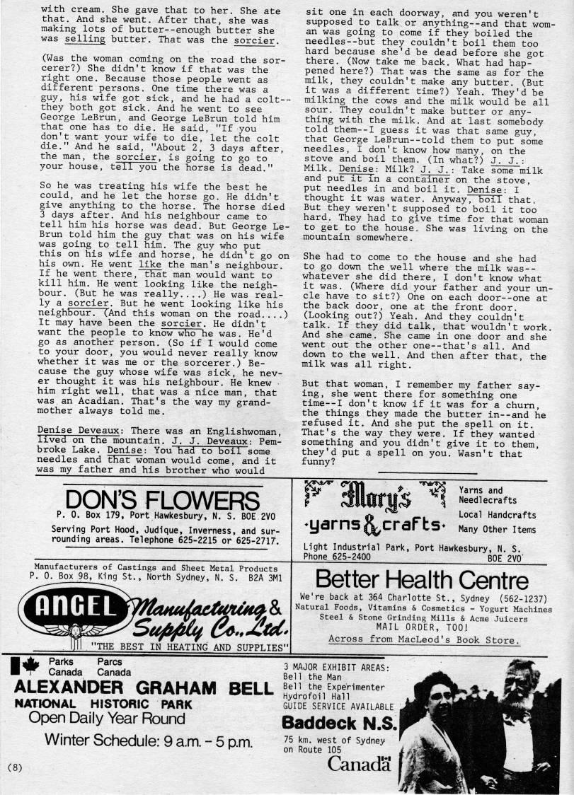 Published by Ronald Caplan on 1981/12/1 (283 reads)with cream. She gave that to her. She ate that. And she went. After that, she was making lots of butter--enough butter she was selling butter. That was the sorcier. (Was the woman coming on the road the sor? cerer?) She didn't know if that was the right one. Because those people went as different persons. One time there was a guy, his wife got sick, and he had a colt-~ they both got sick. And he went to see George LeBrun, and George LeBrun told him that one has to die. He said, "If you don't want your wife to die, let the colt die." And he said, "About 2, 3 days after, the man, the sorcier, is going to go to your house, tell you the horse is dead." So he was treating his wife the best he could, and he let the horse go. He didn't give anything to the horse. The horse died 3 days after. And his neighbour came to tell him his horse was dead. But George Le? Brun told him the guy that was on his wife was going to tell him. The guy who put this on his wife and horse, he didn't go on his own. He went like the man's neighbour. If he went there, that man would want to kill him. He went looking like the neigh? bour. (But he was really....) He was real? ly a sorcier. But he went looking like his neighbour. (And this woman on the road....) It may have been the sorcier. He didn't want the people to know who he was. He'd go as another person. (So if I would come to your door, you would never really know whether it was me or the sorcerer.) Be? cause the guy whose wife was sick, he nev? er thought it was his neighbour. He knew him right well, that was a nice man, that was an Acadian. That's the way my grand? mother always told me. Denise Deveaux: There was an Englishwoman, lived on the mountain. J. J. Deveaux: Pem? broke Lake. Denise: You had to boil some needles and that woman would come, and it was my father and his brother who would sit one in each doorway, and you weren't supposed to talk or anything--and that wom? an was going to come if they boiled the needles--but they couldn't boil them too hard because she'd be dead before she got there. (Now take me back. What had hap? pened here?) That was the same as for the milk, they couldn't make any butter. (But it was a different time?) Yeah. They'd be milking the cows and the milk would be all sour. They couldn't make butter or any? thing with the milk. And at last somebody told them--I guess it was that same guy, that George LeBrun--told them to put some needles, I don't know how many, on the stove and boil them. (In what?) J. J.: Milk. Denise: Milk? J. J.: Take some milk and put it in a container on the stove, put needles in and boil it. Denise: I thought it was water. Anyway, boil that. But they weren't supposed to boil it too hard. They had to give time for that woman to get to the house • She was living on the mountain somewhere. She had to come to the house and she had to go down the well where the milk was-- whatever she did there, I don't know what it was. (Where did your father and your un? cle have to sit?) One on each door--one at the back door, one at the front door. (Looking out?) Yeah. And they couldn't talk. If they did talk, that wouldn't work. And she came. She came in one door and she went out the other one--that's all. And down to the well. And then after that, the milk was all right. But that woman, I remember my father say? ing, she went there for something one time--I don't know if it was for a chum, the things they made the butter in--and he refused it. And she put the spell on it. That's the way they were. If they wanted something and you didn't give it to them, they'd put a spell on you. Wasn't that funny? DON'S FLOWERS p. 0. Box 179, Port Hawkesbury, N. S. BOE 2V0 Serving Port Hood, Judique, Inverness, and sur? rounding areas. Telephone 625-2215 or 625-2717. *yarns 'crafts* Light Industrial Park, Port Hawkesbury, N. S. Phone 625-2400 BOE 2V0' Yarns and Needlecrafts Local Handcrafts Many Other Items Manufacturers of Castings and Sheet Metal Products P. 0. Box 98, King St., North Sydney, N. S. B2A 3M1 nncEL 'Ste'lifiiti Better Health Centre We're back at 364 Charlotte St., Sydney (562-1237) Natural Foods, Vitamins & Cosmetics - Yogurt Machines Steel & Stone Grinding Mills & Acme Juicers MAIL ORDER, TOO,! Across from MacLeod's Book Store. "THE BEST IN HEATING AND SUPPLIES" Pares Canada ?? j|l Parks ?? 'r Canada ALEXANDER GRAHAM NATIONAL HISTORIC PARK Open Daily Year Round BELL Winter Schedule: 9 a.m. - 5 p.m. (8) 3 MAJOR EXHIBIT AREAS: Bell the Man Bell the Experimenter Hydrofoil Hall GUIDE SERVICE AVAILABLE Baddeck N.S. 75 km. west of Sydney on Route 105 Canada