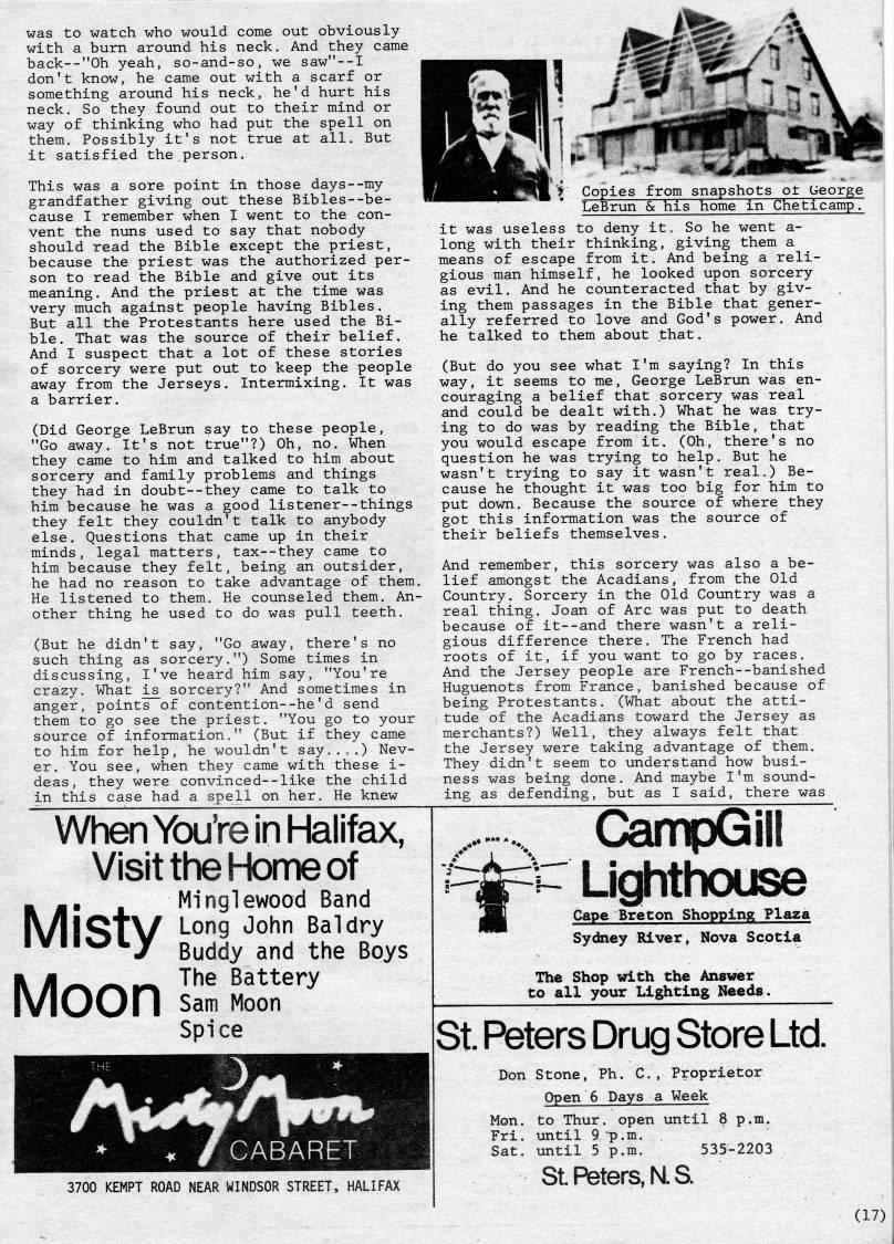 Published by Ronald Caplan on 1981/12/1 (432 reads)was to watch who would come out obviously with a burn around his neck. And they came back--"Oh yeah, so-and-so, we saw"--I don't know, he came out with a scarf or something around his neck, he'd hurt his neck. So they found out to their mind or way of thinking who had put the spell on them. Possibly it's not true at all. But it satisfied the.person. This was a sore point in those days--my grandfather giving out these Bibles--be? cause I remember when I went to the con? vent the nuns used to say that nobody should read the Bible except the priest, because the priest was the authorized per? son to read the Bible and give out its meaning. And the priest at the time was very much against people having Bibles. But all the Protestants here used the Bi? ble. That was the source of their belief. And I suspect that a lot of these stories of sorcery were put out to keep the people away from the Jerseys. Intermixing. It was a barrier. (Did George LeBrun say to these people, "Go away. It's not true"?) Oh, no. When they came to him and talked to him about sorcery and family problems and things they had in doubt--they came to talk to him because he was a good listener--things they felt they couldn't talk to anybody else. Questions that came up in their minds, legal matters, tax--they came to him because they felt, being an outsider, he had no reason to take advantage of them. He listened to them. He counseled them. An? other thing he used to do was pull teeth. (But he didn't say, "Go away, there's no such thing as sorcery.") Some times in discussing, I've heard him say, "You're crazy. What is' sorcery?" And sometimes in anger, points of contention--he'd send them to go see the priest. "You go to your source of information." (But if they came to him for help, he wouldn't say.. • .) Nev? er. You see, when they came with these i- deas, they were convinced--like the child in this case had a spell on her. He knew Afe Copies from snapshots ot George LeBrun 6e his home in Cheticamp. it was useless to deny it. So he went a- long with their thinking, giving them a means of escape from it. And being a reli? gious man himself, he looked upon sorcery as evil. And he counteracted that by giv? ing them passages in the Bible that gener? ally referred to love and God's power. And he talked to them about that. (But do you see what I'm saying? In this way, it seems to me, George LeBrun was en? couraging a belief that sorcery was real and could be dealt with.) What he was try? ing to do was by reading the Bible, that you would escape from it. (Oh, there's no question he was trying to help. But he wasn't trying to say it wasn't real • ) Be? cause he thought it was too big for him to put down. Because the source of where they got this information was the source of their beliefs themselves. And remember, this sorcery was also a be? lief amongst the Acadians, from the Old Country. Sorcery in the Old Country was a real thing. Joan of Arc was put to death because of it--and there wasn't a reli? gious difference there. The French had roots of it, if you want to go by races. And the Jersey people are French--banished Huguenots from France, banished because of being Protestants. (What about the atti? tude of the Acadians toward the Jersey as merchants?) Well, they always felt that the Jersey were taking advantage of them. They didn't seem to understand how busi? ness was being done. And maybe I'm sound? ing as defending, but as I said, there was When You're in Halifax, Visit the Home of ft • ? A Minglewood Band MiStV Long John Bal dry Moon Sam Moon Spice - THE % <'_, * * /cabaret 3700 KEMPT ROAD NEAR WINDSOR STREET, HALIFAX -f, CampGill LighthoiBe Cape Breton Shopping Plaza Sydney River, Nova Scotia The Shop with the Answer to all your Lighting Needs. St. Peters Drug Store Ltd. Don Stone, Ph. C., Proprietor Open 6 Days a Week Mon. to Thur. open until 8 p.m. Fri. until 9 p.m. Sat. until 5 p.m. 535-2203 St. Peters, NS.