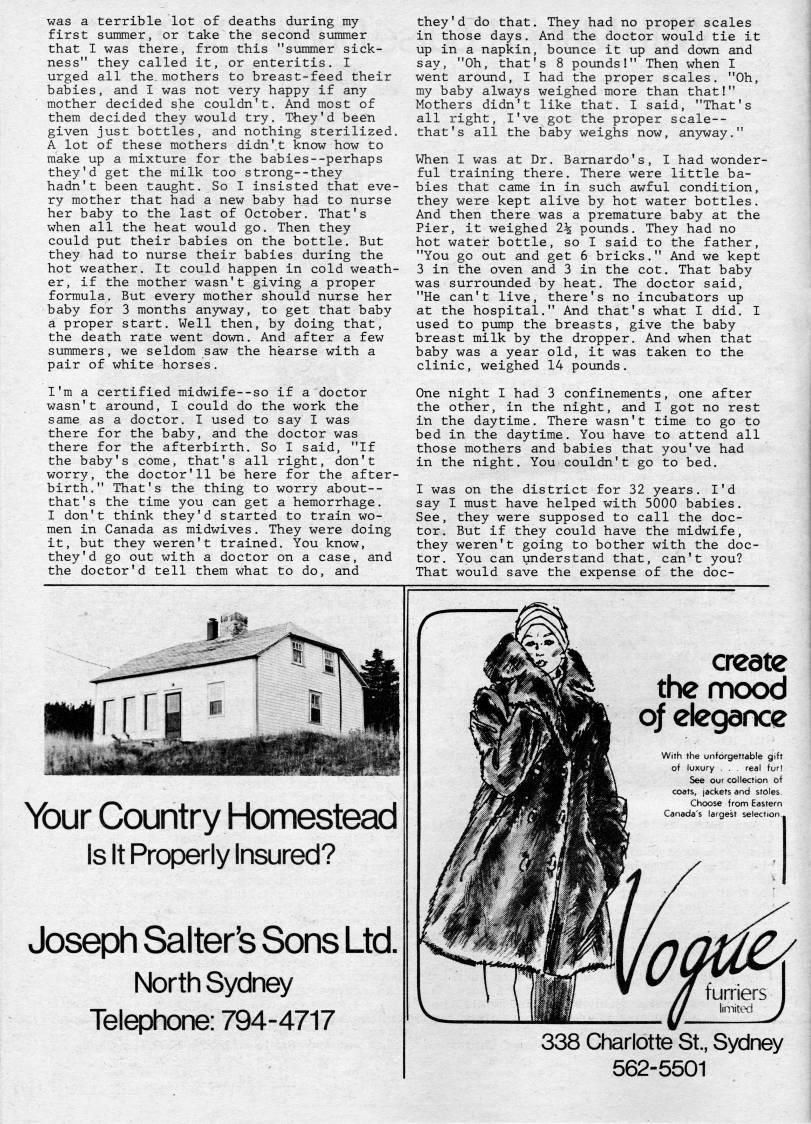 Published by Ronald Caplan on 1981/12/1 (271 reads)was a terrible lot of deaths during my first summer, or take the second summer that I was there, from this "summer sick? ness" they called it, or enteritis. I urged all the mothers to breast-feed their babies, and I was not very happy if any mother decided she couldn't. And most of them decided they would try. They'd been given just bottles, and nothing sterilized. A lot of these mothers didn't know how to make up a mixture for the babies--perhaps they'd get the milk too strong--they hadn't been taught. So I insisted that eve? ry mother that had a new baby had to nurse her baby to the last of October. That's when all the heat would go. Then they could put their babies on the bottle. But they had to nurse their babies during the hot weather. It could happen in cold weath? er, if the mother wasn't giving a proper formula. But every mother should nurse her baby for 3 months an57way, to get that baby a proper start. Well then, by doing that, the death rate went down. And after a few summers, we seldom saw the hearse with a pair of white horses, I'm a certified midwife--so if a doctor wasn't around, I could do the work the same as a doctor. I used to say I was there for the baby, and the doctor was there for the afterbirth. So I said, "If the baby's come, that's all right, don't worry, the doctor'11 be here for the after? birth." That's the thing to worry about-- that's the time you can get a hemorrhage. I don't think they'd started to train wo? men in Canada as midwives. They were doing it, but they weren't trained. You know, they'd go out with a doctor on a case, and the doctor'd tell them what to do, and they'd do that. They had no proper scales in those days. And the doctor would tie it up in a napkin, bounce it up and down and say, "Oh, that's 8 pounds!" Then when I went around, I had the proper scales. "Oh, my baby always weighed more than that!" Mothers didn't like that. I said, "That's all right, I've got the proper scale-- that's all the baby weighs now, an37way." When I was at Dr. Bamardo's, I had wonder? ful training there. There were little ba? bies that came in in such awful condition, they were kept alive by hot water bottles. And then there was a premature baby at the Pier, it weighed 2% pounds. They had no hot water bottle, so I said to the father, "You go out and get 6 bricks." And we kept 3 in the oven and 3 in the cot. That baby was surrounded by heat. The doctor said, "He can't live, there's no incubators up at the hospital." And that's what I did. I used to pump the breasts, give the baby breast milk by the dropper. And when that baby was a year old, it was taken to the clinic, weighed 14 pounds. One night I had 3 confinements, one after the other, in the night, and I got no rest in the daytime. There wasn't time to go to bed in the daytime. You have to attend all those mothers and babies that you've had in the night. You couldn't go to bed. I was on the district for 32 years. I'd say I must have helped with 5000 babies. See, they were supposed to call the doc? tor. But if they could have the midwife, they weren't going to bother with the doc? tor. You can understand that, can't you? That would save the expense of the doc- Your Country Homestead Is It Properly Insured? Joseph Salter's Sons Ltd. North Sydney Telephone: 794-4717 create the mood of elegance With the unforgettable gift of luxury . . , real fur! See our collection of coats, jackets and stoles. Choose from Eastern Canada's largest selection. 338 Charlotte St., Sydney 562-5501