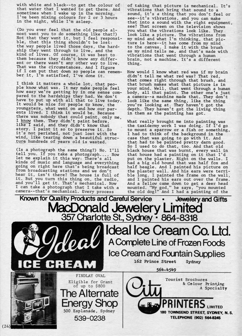 Published by Ronald Caplan on 1981/12/1 (317 reads)with white and black--to get the colour of that water that I wanted to get there. And sometimes when I wake up in the morning, I've been mixing colours for 2 or 3 hours in the night, while I'm asleep. (Do you ever feel that the old people al? most want you to do something like that?) Not that they want it, but I feel responsi? ble, that this thing shouldn't be lost: the way people lived those days, the hard? ship they went through to live, and the kind of lives. Of course, it was best to them because they didn't know any differ? ent or there wasn't any other way to live. That was the circumstances. And I figure if I can put that down so people can remem? ber it, I'm satisfied, I've done it. I think it matters a whole lot, that peo? ple know what was. It may make people feel how easy we're getting by in one sense com? pared to the hardships they had. We don't have to put up with all that to live today. It would be nice for people to know, the youngsters, what went on and how our par? ents lived. I think it would be. Because there was nobody that could paint, only me, I know them. They didn't paint before, like I said, and they didn't know that story. I paint it so to preserve it. So it's not perished, not just lost with the wind, like tearing down a beautiful struc? ture hundreds of years old is wasted. (Is a photograph the same thing?) No. I'll tell you. If you take a photograph.... Now let me explain it this way: There's all kinds of music and language and everything going on right here that's being broadcast from broadcasting stations and we don't hear it, isn't there? The house is full of it. But; you turn this thing on, the radio, and you'll get it. That's mechanical. Now I can take a photograph that I take with a camera--that's mechanical. Every process of taking that picture is mechanical. It's vibrations that bring that sound to a sound, it's a thing that you don't feel or see--it's vibrations, and you can make that into a sound with the right equipment, see? That screen on the television shows you what the vibrations look like. They look like a picture. The vibrations from my mind and what I'm thinking, that pic? ture is here--it has come from my mind to the canvas. I make it with the brush as my mind tells me, and that's made with vibrations that went through a human brain, not a machine. It's a different thing. How would I know what red was if my brain didn't tell me what red was? That red, that comes right through that brush, and that brush makes what that picture is in your mind. Well, that went through a human body, all that paint. The other one's just a camera--a machine made that. They don't look like the same thing, like the thing you're looking at. They haven't got the depth. They haven't got the living thing in them as the painting has got. What really brought me into painting was the taxidermy work I was doing. If I'd go to mount a sparrow or a fish or something, I had to think of the background in the case that was going to go with it. And that had to be painted pretty darn good. So I used to do that, too. And that old black house that was burnt, every wall in that house had a painting on it that I'd put on the plaster. Right on the walls. I had a big old hound that was half fox and half beagle. And I painted his picture on the plaster wall. And his ears were terri? ble long. I painted the frame on the wall, and I painted his ears out over the frame. And a fellow came down to get a deer head mounted. "My god," he says, "you mounted the old dog!" And I had a painting of the Known for CXrality Products and Careful Service ?? Jewelery and Gifts MadDonald Jewelery Limited 357 Oiarlotte St., Sydney • 864-8318 Ideal Ice Cream Co. Ltd. A Complete Line of Frozen Foods Ice Cream and Fountain Supplies 162 Prince Street Sydney 56??-45??9 . FINDLAY OVAL Eligible for Grant of up to $800 The Alternate Energy Shop 500 Esplanade, Sydney 539-0238 (24) Tourist Brochures & Colour Printing A Specialty PRINTERS 180 TOWNSENO STREET, SYDNEY, H.: TELEPHONE (902) 564-8245