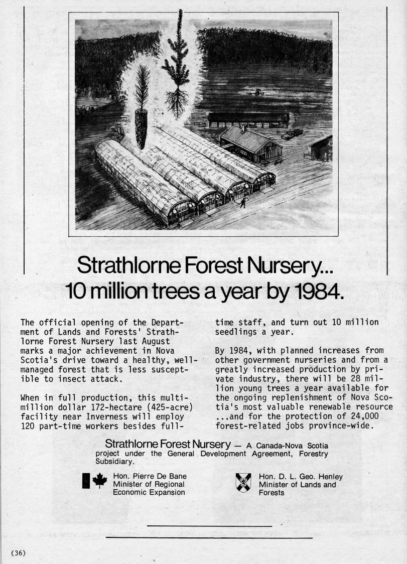 Strathlome Forest Nursery... 10 million trees a year by 1984. The official opening of the Depart? ment of Lands and Forests' Strath? lome Forest Nursery last August marks a major achievement in Nova Scotia's drive toward a healthy, well- managed forest that is less suscept? ible to insect attack. When in full production, this multi- million dollar 172-hectare (425-acre) facility near Inverness will employ 120 part-time workers besides full- time staff, and turn out 10 million seedlings a year. By 1984, with planned increases from other government nurseries and from a greatly increased production by pri? vate industry, there will be 28 mil? lion young trees a year available for the ongoing replenishment of Nova Sco? tia's most valuable renewable resource ...and for the protection of 24,000 forest-related jobs province-wide. Strathlorne Forest Nursery - a canada-Nova scotia project under the General Development Agreement, Forestry Subsidiary. t* Hon. Pierre De Bane Minister of Regional Economic Expansion '' Hon. D. L. Geo. Henley l'kj Minister of Lands and '' Forests (36)