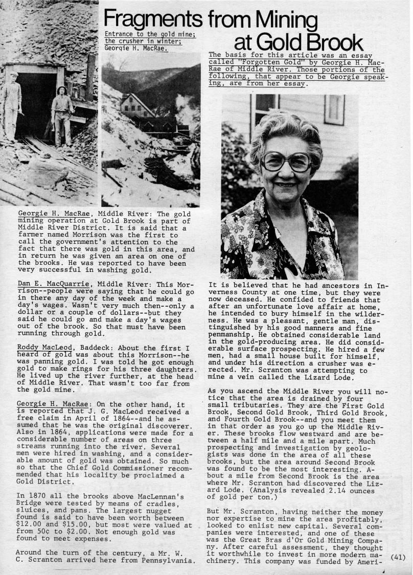 Published by Ronald Caplan on 1981/12/1 (3202 reads)':j'#-*.-'v*?n'-' Entrance to the gold mine; the crusher in winter; Georqie H. MacRae. Fragments from Mining atGoldBrool< Georgie H. MacRae, Middle River: The gold mining operation at Gold Brook is part of Middle River District. It is said that a farmer named Morrison was the first to call the government's attention to the fact that there was gold in this area, and in return he was given an area on one of the brooks. He was reported to have been very successful in washing gold. Dan E. MacQuarrie, Middle River: This Mor- rison--people were saying that he could go in there any day of the week and make a day's wages. Wasn't very much then--only a dollar or a couple of dollars--but they said he could go and make a day's wages out of the brook. So that must have been running through gold. Roddy MacLeod, Baddeck: About the first I heard of gold was about this Morrison--he was panning gold. I was told he got enough gold to make rings for his three daughters. He lived up the river further, at the head of Middle River. That wasn't too far from the gold mine. Georgie H. MacRae: On the other hand, it is reported that J. G. MacLeod received a free claim in April of 1864--and he as? sumed that he was the original discoverer. Also in 1864, applications were made for a considerable number of areas on three streams running into the river. Several men were hired in washing, and a consider? able amount of gold was obtained. So much so that the Chief Gold Commissioner recom? mended that his locality be proclaimed a Gold District. In 1870 all the brooks above MacLennan's Bridge were tested by means of cradles, sluices, and pans. The largest nugget found is said to have been worth between $12.00 and $15.00, but most were valued at from 50c to $2.00. Not enough gold was found to meet expenses. Around the turn of the century, a Mr. W. C. Scranton arrived here from Pennsylvania. The basis for this article was an essay called "Forgotten Gold" by Georgie H. Mac? Rae of Middle River. Those portions of the following, that appear to be Georgie speak? ing, are from her essay. It is believed that he had ancestors in In? verness County at one time, but they were now deceased. He confided to friends that after an unfortunate love affair at home, he intended to bury himself in the wilder? ness. He was a pleasant, gentle man, dis? tinguished by his good manners and fine penmanship. He obtained considerable land in the gold-producing area. He did consid? erable surface prospecting. He hired a few men, had a small house built for himself, and under his direction a crusher was e- rected. Mr. Scranton was attempting to mine a vein called the Lizard Lode. As you ascend the Middle River you will no? tice that the area is drained by four small tributaries. They are the First Gold Brook, Second Gold Brook, Third Gold Brook, and Fourth Gold Brook--and you meet them in that order as you go up the Middle Riv? er. These brooks flow westward and are be? tween a half mile and a mile apart. Much prospecting and investigation by geolo? gists was done in the area of all these brooks, but the area around Second Brook was found to be the most interesting. A- bout a mile from Second Brook is the area where Mr. Scranton had discovered the Liz? ard Lode. (Analysis revealed 2.14 ounces of gold per ton.) But Mr. Scranton, having neither the money nor expertise to mine the area profitably, looked to enlist new capital. Several com? panies were interested, and one of these was the Great Bras d'Or Gold Mining Compa? ny. After careful assessment, they thought it worthwhile to invest in more modern ma? chinery. This company was funded by Ameri-