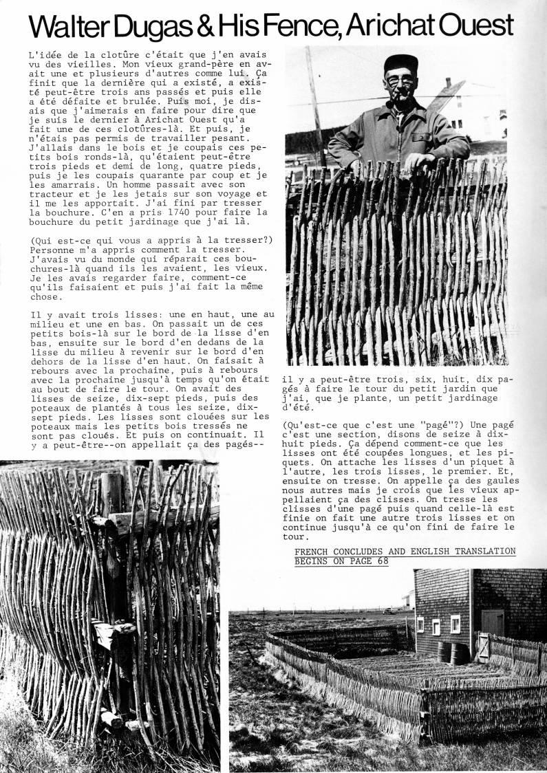 Published by Ronald Caplan on 1982/6/1 (349 reads)Walter Dugas & His Fence, Arichat Ouest L'idee de la cloture c'etait que j'en avals vu des vieilles. Mon vieux grand-pere en av? ait une et plusieurs d'autres comme lui. Ca finit que la derniere qui a existe, a exis? ts peut-etre trois ans passes et puis eile a ete defaite et brulee. Puis moi, je dis- ais que j'aimerais en faire pour dire que je suis le dernier a Arichat Ouest qu'a fait une de ces clotures-la. Et puis, je n'etais pas permis de travailler pesant. J'allais dans le bois et je coupais ces pe- tits bois ronds-la, qu'etaient peut-etre trois pieds et demi de long, quatre pieds, puis je les coupais quarante par coup et je les amarrais. Un homme passait avec son tracteur et je les jetais sur son voyage et il me les apportait. J'ai fini par tresser la bouchure. C'en a pris 1740 pour faire la bouchure du petit jardinage que j'ai la. (Qui est-ce qui vous a appris a la tresser?) Personne m'a appris comment la tresser. J'avals vu du monde qui reparait ces bou- chures-la quand ils les avaient, les vieux. Je les avals regarder faire, comment-ce qu'ils faisaient et puis j'ai fait la meme chose. II y avait trois lisses: une en haut, une au milieu et une en bas. On passait un de ces petits bois-la sur le bord de la lisse d'en bas, ensuite sur le bord d'en dedans de la lisse du milieu a revenir sur le bord d'en dehors de la lisse d'en haut. On faisait a rebours avec la prochaine, puis a rebours avec la prochaine jusqu'a temps qu'on etait au bout de faire le tour. On avait des lisses de seize, dix-sept pieds, puis des poteaux de plantes a tous les seize, dix- sept pieds. Les lisses sont clouees sur les poteaux mais les petits bois tresses ne sont pas clouds. Et puis on continuait. II y a peut-etre--on appellait ca des pages-- il y a peut-etre trois, six, huit, dix pa? ges a faire le tour du petit jardin que j'ai, que je plante, un petit jardinage d'ete. (Qu'est-ce que c'est une "page"?) Une page c'est une section, disons de seize a dix- huit pieds. Ca depend comment-ce que les lisses ont ete coupees longues, et les pi? quets. On attache les lisses d'un piquet a 1'autre, les trois lisses, le premier. Et, ensuite on tresse. On appelle ca des gaules nous autres mais je crois que les vieux ap- pellaient ca des clisses. On tresse les clisses d'une page puis quand celle-la est finie on fait une autre trois lisses et on continue jusqu'a ce qu'on fini de faire le tour. FRENCH CONCLUDES AND ENGLISH TRANSLATION BEGINS ON PAGE 68