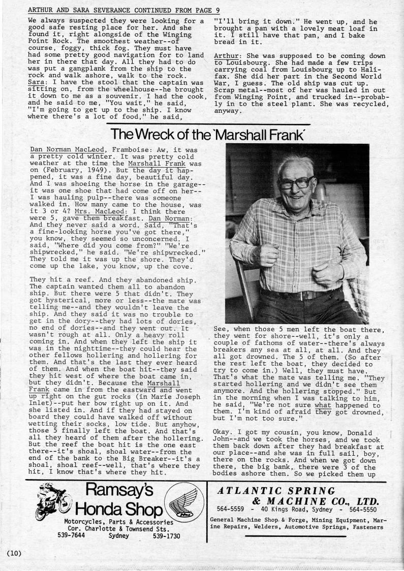 Published by Ronald Caplan on 1982/6/1 (616 reads)ARTHUR AND SARA SEVERANCE CONTINUED FROM PAGE 9 We always suspected they were looking for a good safe resting place for her. And she found it, right alongside of the Winging Point Rock. The smoothest weather--of course, foggy, thick fog. They must have had some pretty good navigation for to land her in there that day. All they had to do was put a gangplank from the ship to the rock and walk ashore, walk to the rock. Sara: I have the stool that the captain was sitting on, from the wheelhouse--he brought it down to me as a souvenir. I had the cook, and he said to me, "You wait," he said, "I'm going to get up to the ship. I know where there's a lot of food," he said. "I'll bring it down." He went up, and he brought a pan with a lovely meat loaf in it. I still have that pan, and I bake bread in it. Arthur: She was supposed to be coming down to Louisbourg. She had made a few trips carrying coal from Louisbourg up to Hali? fax. She did her part in the Second World War, I guess. The old ship was cut up. Scrap metal--most of her was hauled in out from Winging Point, and trucked in--probab- ly in to the steel plant. She was recycled, anyway. The Wreck of the Marshall Frank' Dan Norman MacLeod, Framboise: Aw, it was a pretty cold winter. It was pretty cold weather at the time the Marshall Frank was on (February, 1949). But the day it hap- pened, it was a fine day, beautiful day. And I was shoeing the horse in the garage-- it was one shoe that had come off on her-- I was hauling pulp--there was someone walked in. How many came to the house, was it 3 or 4? Mrs. MacLeod: I think there were 5, gave them breakfast. Dan Norman: And they never said a word. Said, "That's a fine-looking horse you've got there," you know, they seemed so unconcerned. I said, "Where did you come from?" "We're shipwrecked," he said. "We're shipwrecked." They told me it was up the shore. They'd come up the lake, you know, up the cove. They hit a reef. And they abandoned ship. The captain wanted them all to abandon ship. But there were 5 that didn't. They got hysterical, more or less--the mate was telling me--and they wouldn't leave the ship. And they said it was no trouble to get in the dory--they had lots of dories, no end of dories--and they went out. It wasn't rough at all. Only a heavy roll coming in. And when they left the ship it was in the nighttime--they could hear the other fellows hollering and hollering for them. And that's the last they ever heard of them. And when the boat hit--they said they hit west of where the boat came in, but they didn't. Because the Marshall Frank came in from the eastward and went up right on the gut rocks (in Marie Joseph Inlet)--put her bow right up on it. And she listed in. And if they had stayed on board they could have walked off without wetting their socks, low tide. But anyhow, those 5 finally left the boat. And that's all they heard of them after the hollering. But the reef the boat hit is the one east there--it's shoal, shoal water--from the end of the bank to the Big Breaker--it's a shoal, shoal reef--well, that's where they hit, I know that's where they hit. '''nf'' ??HH'''''i> ' I 3''*V-'L • '',1 'p-'.>'/|| 1 >'?*- . ' 1 ??' '& ''??- * ''''''1 ??:. 1 '"S' See, when those 5 men left the boat there, they went for shore--well, it's only a couple of fathoms of water--there's always breakers any sea at all, at all. And they all got drowned. The 5 of them. (So after the rest left the boat, they decided to try to come in.) Well, they must have. That's what the mate was telling me. "They started hollering and we didn't see them an3niiore. And the hollering stopped." But in the morning when I was talking to him, he said, "We're not sure what happened to them. I'm kind of afraid they got drowned, but I'm not too sure." Okay. I got my cousin, you know, Donald John--and we took the horses, and we took them back down after they had breakfast at our place--and she was in full sail, boy, there on the rocks. And when we got down there, the big bank, there were 3 of the bodies ashore then. So we picked them up Ramsay's Honda Shop Motorcycles, Parts & Accessories" Cor. Charlotte & Townsend Sts. 539-7644 Sydney 539-1730 ATLANTIC SPRING & MACHINE CO.. LTD. 564-5559 - 40 Kings Road, Sydney - 564-5550 General Machine Shop & Forge, Mining Equipment, Mar? ine Repairs, Welders, Automotive Springs, Fasteners