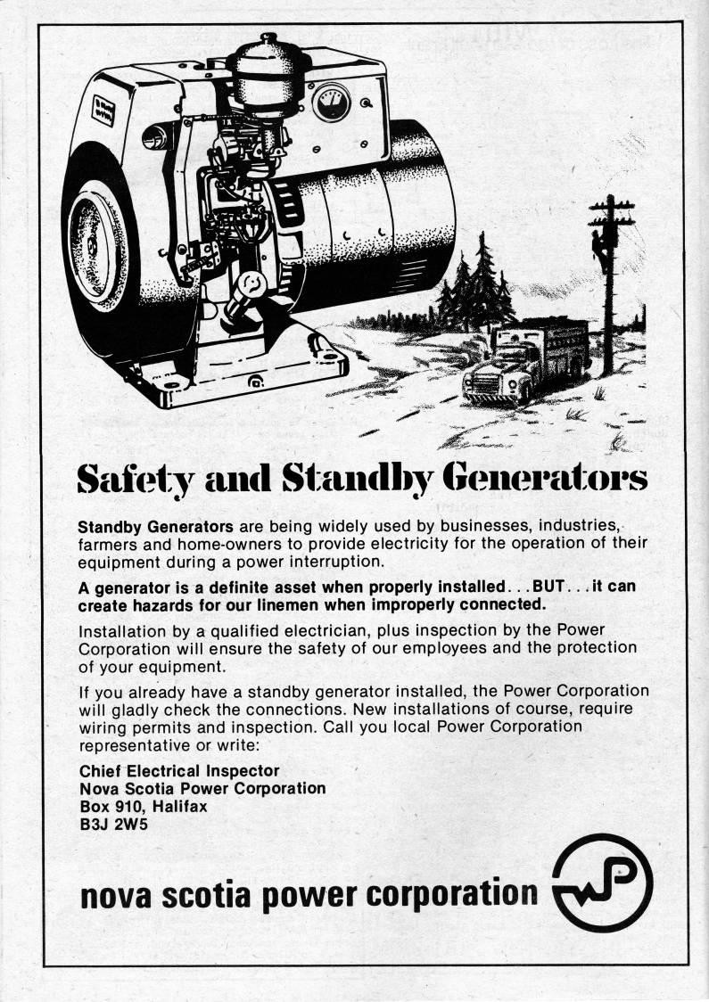 Published by Ronald Caplan on 1982/6/1 (296 reads)Safely and Siaiidby (leiierators Standby Generators are being widely used by businesses, industries, farmers and home-owners to provide electricity for the operation of their equipment during a power interruption. A generator is a definite asset when properly installed.. .BUT.. .it can create hazards for our linemen when improperly connected. Installation by a qualified electrician, plus inspection by the Power Corporation will ensure the safety of our employees and the protection of your equipment. If you already have a standby generator installed, the Power Corporation will gladly check the connections. New installations of course, require wiring permits and inspection. Call you local Power Corporation representative or write: Chief Electrical Inspector Nova Scotia Power Corporation Box 910, Halifax B3J 2W5 nova scotia power corporation