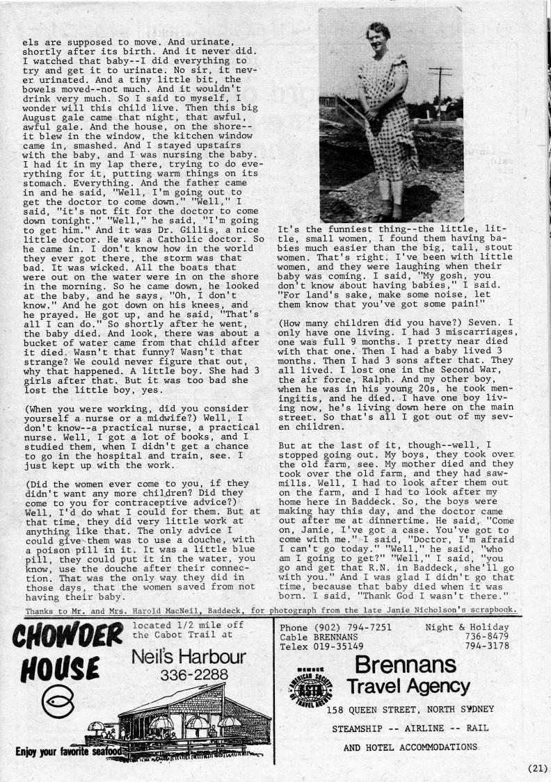 Published by Ronald Caplan on 1982/6/1 (293 reads)els are supposed to move. And urinate, shortly after its birth. And it never did. I watched that baby--I did everything to try and get it to urinate. No sir, it nev? er urinated. And a tiny little bit, the bowels moved--not much. And it wouldn't drink very much. So I said to myself, I wonder will this child live. Then this big August gale came that night, that awful, awful gale. And the house, on the shore-- it blew in the window, the kitchen window came in, smashed. And I stayed upstairs with the baby, and I was nursing the baby. I had it in my lap there, trying to do eve? rything for it, putting warm things on its stomach. Everything. And the father came in and he said, "Well, I'm going out to get the doctor to come down." "Well," I said, "it's not fit for the doctor to come down tonight." "Well," he said, "I'm going to get him." And it was Dr. Gillis, a nice little doctor. He was a Catholic doctor. So he came in. I don't know how in the world they ever got there, the storm was that bad. It was wicked. All the boats that were out on the water were in on the shore in the morning. So he came down, he looked at the baby, and he says, "Oh, I don't know." And he got down on his knees, and he prayed. He got up, and he said, "That's all I can do." So shortly after he went, the baby died. And look, there was about a bucket of water came from that child after it died • Wasn't that funny? Wasn't that strange? We could never figure that out, why that happened. A little boy. She had 3 girls after that. But it was too bad she lost the little boy, yes. (When you were working, did you consider yourself a nurse or a midwife?) Well, I don't know--a practical nurse, a practical nurse. Well, I got a lot of books, and I studied them, when I didn't get a chance to go in the hospital and train, see. I just kept up with the work. (Did the women ever come to you, if they didn't want any more children? Did they come to you for contraceptive advice?) Well, I'd do what I could for them. But at that time, they did very little work at anything like that. The only advice I could give them was to use a douche, with a poison pill in it. It was a little blue pill, they could put it in the water, you know, use the douche after their connec? tion. That was the only way they did in those days, that the women saved from not having their baby. It's the funniest thing--the little, lit? tle, small women, I found them having ba? bies much easier than the big, tall, stout women. That's right. I've been with little women, and they were laughing when their baby was coming. I said, "My gosh, you don't know about having babies," I said. "For land's sake, make some noise, let them know that you've got some pain!" (How many children did you have?) Seven. I only have one living. I had 3 miscarriages, one was full 9 months. I pretty near died with that one. Then I had a baby lived 3 months. Then I had 3 sons after that. They all lived. I lost one in the Second War, the air force, Ralph. And my other boy, when he was in his young 20s, he took men? ingitis, and he died. I have one boy liv? ing now, he's living down here on the main street. So that's all I got out of my sev? en children. But at the last of it, though--well, I stopped going out. My boys, they took over the old farm, see. My mother died and they took over the old farm, and they had saw? mills. Well, I had to look after them out on the farm, and I had to look after my home here in Baddeck. So, the boys were making hay this day, and the doctor came out after me at dinnertime. He said, "Come on, Janie, I've got a case. You've got to come with me." I said, "Doctor, I'm afraid I can't go today." "Well," he said, "who am I going to get?" "Well," I said, "you go and get that R.N. in Baddeck, she'll go with you." And I was glad I didn't go that time, because that baby died when it was born. I said, "Thank God I wasn't there." Thanks to Mr. and Mrs. Harold MacNeil, Baddeck, for photograph from the late Janie Nicholson's scrapboqk. cmfoEft located 1/2 mile off the Cabot Trail at Neifs Harbour 336-2288 Enjoy jfour favorite Phone (902) 794-7251 Cable BRENNANS Telex 019-35149 Night & Holiday 736-8479 794-3178 Brennans Travel Agency 158 QUEEN STREET, NORTH SVDNEY STEAMSHIP AIRLINE -- RAIL AND HOTEL ACCOMMODATIONS.