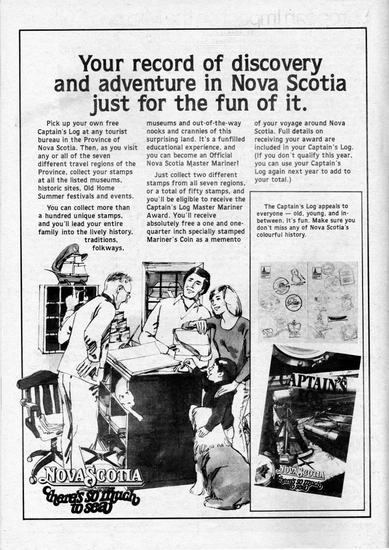 Published by Ronald Caplan on 1982/6/1 (368 reads)Your record of discovery and adventure in Nova Scotia just for the fun of it. Pick up your own free Captain's Log at any tourist bureau in the Province of Nova Scotia. Then, as you visit any or all of the seven different travel regions of the Province, collect your stamps at all the listed museums, historic sites, Old Home Summer festivals and events. You can collect more than a hundred unique stamps, and you'll lead your entire family into the lively history, traditions, folkways, museums and out-of-the-way nooks and crannies of this surprising land. It's a funfilled educational experience, and you can become an Official Nova Scotia Master Mariner! Just collect two different stamps from all seven regions, or a total of fifty stamps, and you'll be eligible to receive the Captain's Log Master Mariner Award. You'll receive absolutely free a one and one- quarter inch specially stamped Mariner's Coin as a memento of your voyage around Nova Scotia. Full details on receiving your award are included in your Captain's Log. (If you don't qualify this year, you can use your Captain's Log again next year to add to your total.) The Captain*s Log appeals to everyone • old. young, and In- between. It's fun. Make sure you don't miss any of Nova Scotia's colourful history.