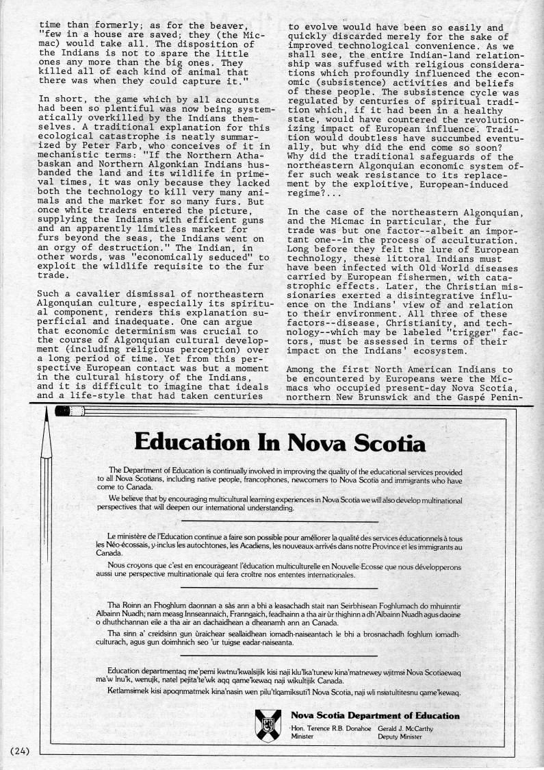 Published by Ronald Caplan on 1982/6/1 (437 reads)time than formerly; as for the beaver, "few in a house are saved; they (the Mic? mac) would take all. The disposition of the Indians is not to spare the little ones any more than the big ones. They killed all of each kind of animal that there was when they could capture it." In short, the game which by all accounts had been so plentiful was now being system? atically overkilled by the Indians them? selves. A traditional explanation for this ecological catastrophe is neatly summar? ized by Peter Farb, who conceives of it in mechanistic terms: "If the Northern Atha- baskan and Northern Algonkian Indians hus? banded the land and its wildlife in prime? val times, it was only because they lacked both the technology to kill very many ani? mals and the market for so many furs. But once white traders entered the picture, supplying the Indians with efficient guns and an apparently limitless market for furs beyond the seas, the Indians went on an orgy of destruction." The Indian, in other words, was "economically seduced" to exploit the wildlife requisite to the fur trade. Such a cavalier dismissal of northeastern Algonquian culture, especially its spiritu? al component, renders this explanation su? perficial and inadequate. One can argue that economic determinism was crucial to the course of Algonquian cultural develop? ment (including religious perception) over a long period of time. Yet from this per? spective European contact was but a moment in the cultural history of the Indians, and it is difficult to imagine that ideals and a life-style that had taken centuries to evolve would have been so easily and quickly discarded merely for the sake of improved technological convenience. As we shall see, the entire Indian-land relation? ship was suffused with religious considera? tions which profoundly influenced the econ? omic (subsistence) activities and beliefs of these people. The subsistence cycle was regulated by centuries of spiritual tradi? tion which, if it had been in a healthy state, would have countered the revolution? izing impact of European influence. Tradi? tion would doubtless have succumbed eventu? ally, but why did the end come so soon? Why did the traditional safeguards of the northeastern Algonquian economic system of? fer such weak resistance to its replace? ment by the exploitive, European-induced regime?... In the case of the northeastern Algonquian, and the Micmac in particular, the fur trade was but one factor--albeit an impor? tant one--in the process of acculturation. Long before they felt the lure of European technology, these littoral Indians must have been infected with Old World diseases carried by European fishermen, with cata? strophic effects. Later, the Christian mis? sionaries exerted a disintegrative influ? ence on the Indians' view of and relation to their environment. All three of these factors--disease, Christianity, and tech- nology--which may be labeled "trigger" fac? tors, must be assessed in terms of their impact on the Indians' ecosystem. Among the first North American Indians to be encountered by Europeans were the Mic? macs who occupied present-day Nova Scotia, northern New Brunswick and the Gaspe Penin- Education In Nova Scotia The Department of Education is continually involved in improving the quality of the educational services provided to all Nova Scotians, including native people, francophones, newcomers to Nova Scotia and immigrants who have come to Canada. We believe that by encouraging multicultural learning experiences in Nova Scotia we will also develop multinational perspectives that will deepen our international understanding. Le ministere de I'Education continue a faire son possible pour ameliorer la qualite des services educationnels a tous les Neo-ecossais, y-inclus les autochtones, les Acadiens, les nouveaux-arrives dans notre Province et les immigrants au Canada. Nous croyons que c'est en encourageant I'education multiculturelle en Nouvelle-Ecosse que nous developperons aussi une perspective multinationale qui fera croitre nos ententes internationales. Tha Roinn an Fhoghlum daonnan a sas ann a bhi a leasachadh stait nan Seirbhisean Foghlumach do mhuinntir Albainn Nuadh; nam measg Innseannaich, Franngaich, feadhainn a tha air ur thighinn a dh'Aibainn Nuadh agus daoine o dhuthchannan eile a tha air an dachaidhean a dheanamh ann an Canada. Tha sinn a' creidsinn gun uraichear seallaidhean iomadh-naiseantach le bhi a brosnachadh foghlum iomadh- culturach, agus gun doimhnich seo 'ur tuigse eadar-naiseanta. Education departmentaq me'pemi kwtnu'kwalsijik kisi naji klu'lka'tunew kina'matnewey wjitmstNova Scotiaewaq ma'w Inu'k, wenujk, natel pejita'te'wk aqq qame'kewaq naji wikultijik Canada. Ketlamsimek kisi apoqnmatmek kina'nasin wen pilu'tlqamiksuti'l Nova Scotia, naji wli nsiatultitesnu qame'kewaq. Nova Scotia Departinent of Education Hon. Terence R.B. Donahoe Gerald J. McCarthy Minister Deputy Minister