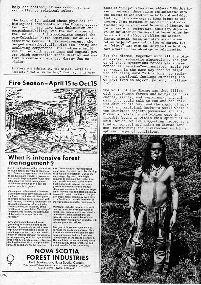 Published by Ronald Caplan on 1982/6/1 (297 reads)holy occupation"; it was conducted and controlled by spiritual rules. The bond which united these physical and biological components of the Micmac ecosys? tem, and indeed gave them definition and comprehensibility, was the world view of the Indian.... Anthropologists regard the pre-Columbian North American Indian as a sensitive member of his environment, who merged sympathetically with its living and nonliving components. The Indian's world was filled with superhuman and magical pow? ers which controlled man's destiny and na? ture's course of events. Murray Wax ex? plains : To those who inhabit it, the magical world is a "society," not a "mechanism," that is, it is com- Fire Season-April 15toOct.15 What is intensive forest management? Left to itself, a forest will produce wood through natural growth and regenera? tion. Forest management assists nature to produce more wood in a given area than would be produced through natu? ral means. The forest management activities to achieve such a goal are divided into three groups: Planning and administration involves planning the long-term management of the forest. It includes calculating the allowable annual cut or sustained yield and planning harvesting operations. To obtain the necessary information for these activities, an inventory of the forest must be completed. Mapping of forested areas to show the distribution of the various tree species is also necessary. Silviculture could be called forest gardening. A first step might be the selection of genetically superior trees to provide the best possible seeds for seedling production. Improved seed? lings can then be grown in nurseries to provide planting stock for regeneration programs. Site preparation involves cul? tivating the forest floor to improve the growing conditions for the new tree crop. Where natural regeneration is insufficient, foresters prescribe planting to speed up reforestation. During the early stage of growth, thinning is required to eliminate the weaker trees and provide adequate space for the healthier ones to achieve maximum growth. In other instances, manual clearing of undesirable species or vege? tation may be required. Herbicides may be used in certain conditions, Like gar? den crops, forest crops may even have to be fertilized to provide trees with all the nutrijents required for rapid growth, Protection includes programs to facili? tate the detection and suppression of forest fires, disease, and insect attacks on "the forest crop. Educational pro? grams to reduce the number of man- caused forest fires play an important role in forest protection efforts. The goal of forest management is to enhance the production of wood fibre. As more and more management activi? ties are implemented in a forest area, management of the area is intensified. The result is an increase in the quantity and the quality of the forest crop and social benefits for the community. NOVA SCOTIA FOREST INDUSTRIES Port Hawkesbury, Nova Scotia, Canada Telephone 625-2460. Area Code S02. Cable Address STORADOCK Telex 014-27531, TWX 610-272-4440 posed of "beings" rather than "objects." Whether hu? man or nonhuman, these beings are associated with and related to one another socially and sociably, that is, in the same ways as human beings to one another. These patterns of association and rela? tionship may be structured in terms of kinship, em? pathy, sympathy, reciprocity, sexuality, dependen? cy, or any other of the ways that human beings in? teract with and affect or afflict one another. Plants, animals, rocks, and stars are thus seen not as "objects" governed by laws of nature, but as "fellows" with whom the individual or band may have a more or less advantageous relationship. For the Micmac, together with all the oth? er eastern subarctic Algonquians, the pow? er of these mysterious forces was appre? hended as "manitou"--translated "magic pow? er" --much in the same way that we might use the slang word "vibrations" to regis? ter the emotional feelings emanating (so we say) from an object, person, or situa? tion. The world of the Micmac was thus filled with superhuman forces and beings (such as dwarfs, giants, and magicians), and ani? mals that could talk to man and had spir? its akin to his own, and the magic of mys? tical and medicinal herbs--a world where e- ven inanimate objects possessed spirits. Micmac subsistence activities were inex? tricably bound up within this spiritual ma? trix, which, we are suggesting, acted as a kind of control mechanism on Micmac land- use, maintaining the environment within an optimum range of conditions. (26)