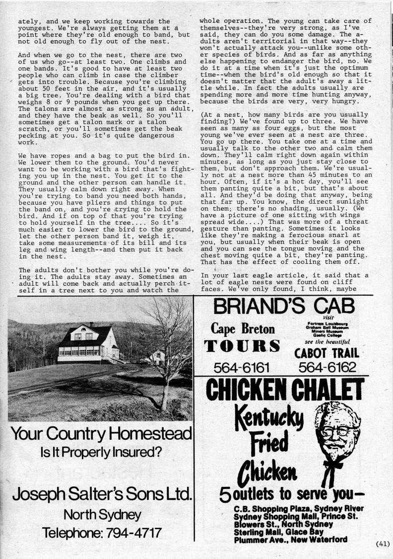 Published by Ronald Caplan on 1982/6/1 (431 reads)ately, and we keep working towards the youngest. We're always getting them at a point where they're old enough to band, but not old enough to fly out of the nest. And when we go to the nest, there are two of us who go--at least two. One climbs and one bands. It's good to have at least two people who can climb in case the climber gets into trouble. Because you're climbing about 50 feet in the air, and it's usually a big tree. You're dealing with a bird that weighs 8 or 9 pounds when you get up there. The talons are almost as strong as an adult, and they have the beak as well. So you'll sometimes get a talon mark or a talon scratch, or you'll sometimes get the beak pecking at you. So it's quite dangerous work. We have ropes and a bag to put the bird in. We lower them to the ground. You'd never want to be working with a bird that's fight? ing you up in the nest. You get it to the ground and the other person can handle it. They usually calm down right away. When you're trying to band you need both hands, because you have pliers and things to put the band on, and you're trying to hold the bird. And if on top of that you're trying to hold yourself in the tree.... So it's much easier to lower the bird to the ground, let the other person band it, weigh it, take some measurements of its bill and its leg and wing length--and then put it back in the nest. The adults don't bother you while you're do? ing it. The adults stay away. Sometimes an adult will come back and actually perch it? self in a tree next to you and watch the whole operation. The young can take care of themselves--they're very strong, as I've said, they can do you some damage. The a- dults aren't territorial in that way--they won't actually attack you--unlike some oth? er species of birds. And as far as anything else happening to endanger the bird, no. We do it at a time when it's just the optimum time--when the bird's old enough so that it doesn't matter that the adult's away a lit? tle while. In fact the adults usually are spending more and more time hunting anyway, because the birds are very, very hungry. (At a nest, how many birds are you usually finding?) We've found up to three. We have seen as many as four eggs, but the most young we've ever seen at a nest are three. You go up there. You take one at a time and usually talk to the other two and calm them down. They'll calm right down again within minutes, as long as you just stay close to them, but don't approach them. We're usual? ly not at a nest more than 45 minutes to an hour. Often, if it's a hot day, you'll see them panting quite a bit, but that's about all. And they'd be doing that anyway, being that far up. You know, the direct sunlight on them; there's no shading, usually. (We have a picture of one sitting with wings spread wide....) That was more of a threat gesture than panting. Sometimes it looks like they're making a ferocious snarl at you, but usually when their beak is open and you can see the tongue moving and the chest moving quite a bit, they're panting. That has the effect of cooling them off. In your last eagle article, it said that a lot of eagle nests were found on cliff faces. We've only found, I think, maybe Your Country Homestead Is It Properly Insured? Joseph Salter's Sons Ltd. North Sydney Telephone: 794-4717 BRIAND'S CAB visit Cape Breton TOURS 564-6161 see the beautiful CABOT TRAIL 564-6162 CHICKEN CHALET l'ntii'loy 5outlets to servelfou- C.B. Shopping Plaza, Sydney Riyer Sydney Sliopping Maii, Prince St. Blowers St., North Sydney Steriing Kiail, Qiace Bay Plummer Ave., New Waterford (41)