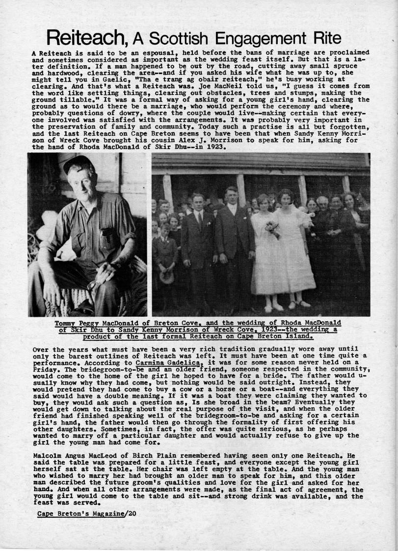 Reiteach, A Scottish Engagement Rite A Reiteach is said to be an espousal, held before the bans of marriage are proclaimed and sometimes considered as important as the wedding feast itself. But that is a la? ter definition. If a man happened to be out by the roadj cutting aivay small spruce and hardwood, clearing the area • and if you asked his wife what he was up to, she might tell you in Gaelic, "Tha e trang ag obair reiteach," he's busy working at clearing. And that's what a Reiteach was, Joe MacNeil told us, "I guess it comes from the word like settling things, clearing out obstacles, trees and stumps, making the ground tillable,** It was a formal way of asking for a young girl's hand, clearing the ground as to would there be a marriage, who would perform the ceremony and where, probably questions of dowry, where the couple would live • making certain that every? one involved was satisfied with the arrangements. It was probably very important in the preservation of family and community. Today such a practise is all but forgotten, and the last Reiteach on Cape Breton seems to have been that when Sandy Kenny Morri? son of Wreck Cove brought his cousin Alex J, Morrison to speak for him, asking for the hand of Rhoda MacDonald of Skir Dhu • in 1923, To] mmy Peggy MacDonald of Breton Cove, and the wedding of Rhoda MacDonald >f Skir Dhu to Sandy Kenny Morrison of Wreck Cove, 1923 • the wedding a "product of the last formal Reiteach on Cape Breton Island,"" Over the years what must have been a very rich tradition gradually wore away until only the barest outlines of Reiteach was left. It must have been at one time quite a performance. According to Carmina Gadelica. it was for some reason never held on a Friday, The bridegroom-to-be and an older friend, someone respected in the community, would come to the home of the girl he hoped to have for a bride. The father would u- sually know why they had come, but nothing would be said outright. Instead, they would pretend they had come to buy a cow or a horse or a boat • and everything they said would have a double meaning. If it was a boat they were claiming they wanted to buy, they would ask such a question as. Is she broad in the beam? Eventually they would get down to talking about the real purpose of the visit, and when the older friend had finished speaking well of the bridegroom-to-be and asking for a certain girl's hand, the father would then go through the formality of first offering his other daughters. Sometimesj in fact, the offer was quite serious, as he perhaps wanted to marry off a particular daughter and would actually refuse to give up the girl the young man had come for, Malcolm Angus MacLeod of Birch Plain remembered having seen only one Reiteach, He said the table was prepared for a little feast, and everyone except the young girl herself sat at the table. Her chair was left empty at the table. And the young man who wished to marry her had brought an older man to speak for him, and this older man described the future groom's qualities and love for the girl and asked for her hand. And when all other arrangements were made, as the final act of agreement, the young girl would come to the table and sit • and strong drink was available, and the feast was served. Cape Breton's Magazine/20