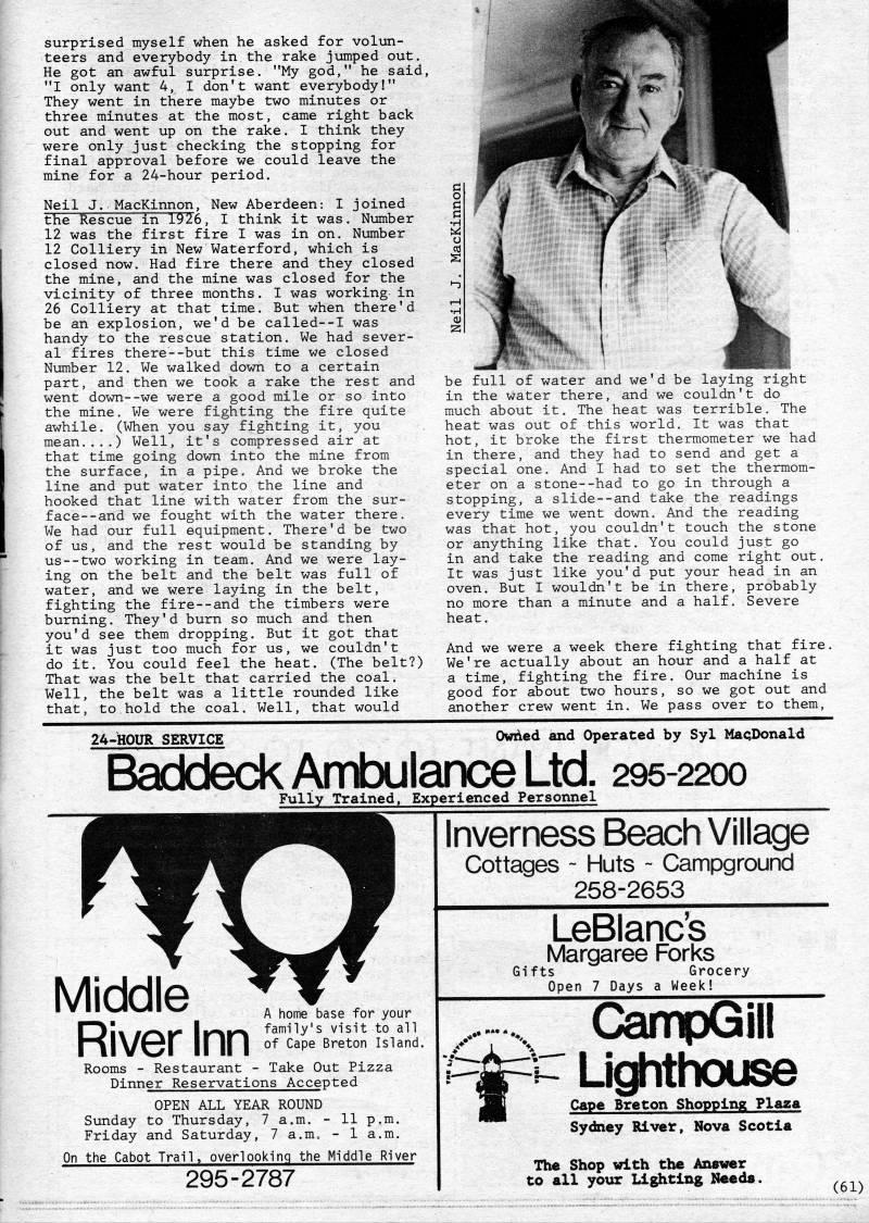 Published by Ronald Caplan on 1982/6/1 (203 reads)surprised myself when he asked for volun? teers and everybody in the rake jumped out. He got an awful surprise. "My god," he said, "I only want 4, I don't want everybody!" They went in there maybe two minutes or three minutes at the most, came right back out and went up on the rake. I think they were only just checking the stopping for final approval before we could leave the mine for a 24-hour period. Neil J. MacKinnon, New Aberdeen: I joined the Rescue in 1926, I think it was. Number 12 was the first fire I was in on. Number 12 Colliery in New Waterford, which is closed now. Had fire there and they closed the mine, and the mine was closed for the vicinity of three months. I was working in 26 Colliery at that time. But when there'd be an explosion, we'd be called--! was handy to the rescue station. We had sever? al fires there--but this time we closed Number 12. We walked down to a certain part, and then we took a rake the rest and went down--we were a good mile or so into the mine. We were fighting the fire quite awhile. (When you say fighting it, you mean,.,,) Well, it's compressed air at that time going down into the mine from the surface, in a pipe. And we broke the line and put water into the line and hooked that line with water from the sur? face- -and we fought with the water there. We had our full equipment. There'd be two of us, and the rest would be standing by us--two working in team. And we were lay? ing on the belt and the belt was full of water, and we were laying in the belt, fighting the fire--and the timbers were burning. They'd burn so much and then you'd see them dropping. But it got that it was just too much for us, we couldn't do it. You could feel the heat. (The belt?) That was the belt that carried the coal. Well, the belt was a little rounded like that, to hold the coal. Well, that would be full of water and we'd be laying right in the water there, and we couldn't do much about it. The heat was terrible. The heat was out of this world. It was that hot, it broke the first thermometer we had in there, and they had to send and get a special one. And I had to set the thermom? eter on a stone--had to go in through a stopping, a slide--and take the readings every time we went down. And the reading was that hot, you couldn't touch the stone or anything like that. You could just go in and take the reading and come right out. It was just like you'd put your head in an oven. But I wouldn't be in there, probably no more than a minute and a half. Severe heat. And we were a week there fighting that fire. We're actually about an hour and a half at a time, fighting the fire. Our machine is good for about two hours, so we got out and another crew went in. We pass over to them, 24->H0UR SERVICE Owned and Operated by Syl MaqDonald Baddeck Ambulance Ltd. 295-2200 Fully Trained, Experienced Personnel Middle River Inn A home base for your family's visit to all of Cape Breton Island. Rooms - Restaurant - Take Out Pizza Dinner Reservations Accepted OPEN ALL YEAR ROUND Sunday to Thursday, 7 a.m. - 11 p.m. Friday and Saturday, 7 a.mo - 1 a.m. On the Cabot Trail, overlooking the Middle River 295-2787 Inverness Beach Village Cottages - Huts - Campground 258-2653 LeBlanc's Margaree Forks Gifts Grocery Open 7 Days a Week! CampGill fc't Lighthouse jB Cape Breton Shopping Plaza Sydney Rlvel:, Nova Scotia The Shop with the Answer to all your Lighting Needs. (61)