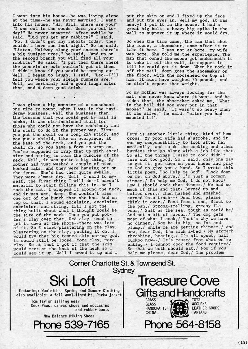Published by Ronald Caplan on 1982/8/1 (268 reads)I went into his house--he was living alone at the time--he was never married. I went into his house. "Hi, Bill, where are you?" "I was out in the woods. Were you out to? day?" He never answered. After awhile he said, "Did you get any rabbits?" I said, "No, I didn't get any rabbits today, they couldn't have run last night." So he said, "Listen. Halfway along your snares there's a big juniper tree," he said, "and up on the second branch you will find all your rabbits." He said, "I put them there where the weasels or owls wouldn't get at them. I didn't know if you would be coming out." Well, I began to laugh. I said, "Leo--I'll tell you where your sleigh runners are." Well, we certainly had a good laugh after that, and a damn good drink. I was given a big monster of a moosehead one time to mount, when I was in the taxi? dermy business. Well the business then, the lessons that you would get by mail in books, it was old-fashioned stuff for those who could not have the machinery and the stuff to do it the proper way. First you put the skull on a long 2x4 stick, and you put a shield, like an overpiece, at the base of the neck, and you put the skull on, so you have a form to wrap on. You're supposed to wrap that up with excel? sior and string to form the muscles of the neck. Well, it was quite a big thing. My mother had just washed a couple of nice hooked mats, and they were hanging out on the fence. She'd had them quite awhile. They were almost dry. Well, I said to my? self, the first thing I will do--I haven't material to start filling this in--so I took the mat. I wrapped it around the neck, and it was wet, damp. She wouldn't miss one out of the bunch that she had. And on top of that, I wound excelsior, excelsior, excelsior, and string, till I got the thing built about what I thought would be the size of the neck. Then you put pot? ter's clay over that. Red clay--used to get it down at the shore--there was lots of it. So I start plastering on the clay, plastering on the clay, putting it on. I would try that big tanned skin on--my god, it would still be loose. More clay, more clay. So at last I got it that the skin would meet at the back of the neck so I could sew it up. Well I sewed it up and I put the skin on and I fixed up the face and put the eyes in. Well my god, it was heavy! I put it in the house. I had a great big bolt, a heavy big spike in the wall to support it up where it would dry. So when the time came, the man that shot the moose, a shoemaker, came after it to take it home. I was not at home, my wife was home. She told me the experience. The man that owned the moose got underneath it to take it off the wall, to support it till he could get it down. When he took it off the nail, down goes the shoemaker on the floor, with the moosehead on top of him. It must have weighed 75 pounds, and he didn't expect that weight. So my mother was always looking for the mat, she never knew where it went. And be? sides that, the shoemaker asked me, "What in the hell did you ever put in that moose?" He said, "It wasn't so heavy when it was alive," he said, "after you had mounted it!". Here is another little thing, kind of hum? orous. My poor wife had a stroke, and it was my responsibility to look after her medically, and to do the cooking and other burdens that go along with a job like that. So all the things I used to cook didn't turn out too good. So I said, only one way to get it, get down on your knees and pray to God to give you a hand. So I wrote this little poem, "So Help Me God": "Look down on me, oh God above,/ I'm just a common sinner./ So help me God, I do not know/ How I should cook that dinner./ We had so much of this and that/ Burned up and boiled over,/ Then hashed and smashed, turned into trash--/ Dear God, please think it over./ Food from a can. Stuck to the pan,/ Strong-smelling, greasy fla? vour,/ Salt as the sea, tough as could be/ And not a bit of savour./ The dog gets most of what I cook,/ That's why we have no dinner./ Now he is big, so fat and plump,/ While we are getting thinner./ And now, dear God, I'm sick a-bed,/ My stomach throbbing, beating,/ I'm all upset, half cuckoo now--/ It's caused from what we're eating./ I cannot cook the food required/ So that we both should eat./ Now if you help me please, dear God,/ The problem Corner Charlotte St. & Townsend St. Ski Loft Sydney featuring: Woolrich - Spring and Summer Clothing also available: a fall wool-lined Mt. Parka jacket Tom Taylor sailing wear Deck Paws: canvas shoes and moccasins and rubber boots New Balance Hiking Shoes Phone 539-7165 Treasure Cove Gifts and Handcrafts TOYS WOCLENS LEATHER GOODS TARTANS Phone 564-8158 (15)