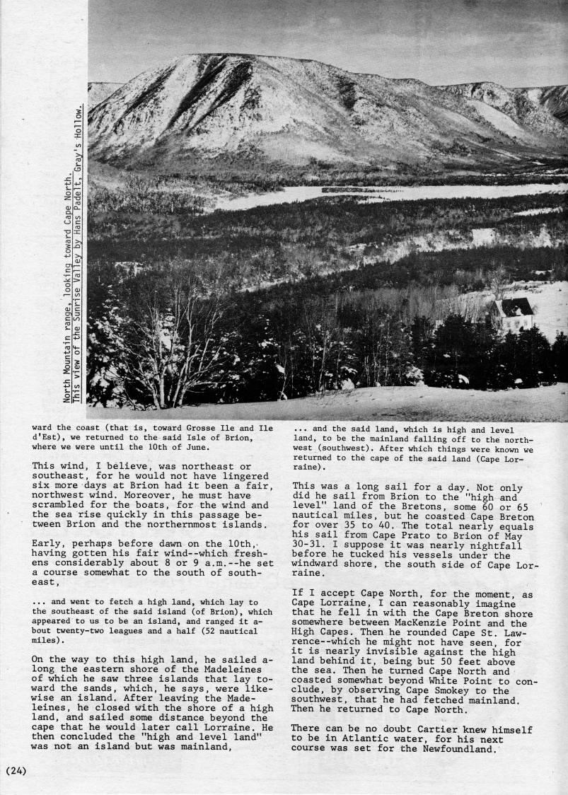 Published by Ronald Caplan on 1982/8/1 (268 reads)ward the coast (that is, toward Grosse lie and lie d'Est), we returned to the said Isle of Brion, where we were until the 10th of June. This wind, I believe, was northeast or southeast, for he would not have lingered six more days at Brion had it been a fair, northwest wind. Moreover, he must have scrambled for the boats, for the wind and the sea rise quickly in this passage be? tween Brion and the northernmost islands. Early, perhaps before dawn on the 10th, having gotten his fair wind--which fresh? ens considerably about 8 or 9 a.m.--he set a course somewhat to the south of south? east, ... and went to fetch a high land, which lay to the southeast of the said Island (of Brion), which appeared to us to be an island, and ranged it a- bout twenty-two leagues and a half (52 nautical miles). On the way to this high land, he sailed a- long the eastern shore of the Madeleines of which he saw three islands that lay to? ward the sands, which, he says, were like? wise an island. After leaving the Made? leines, he closed with the shore of a high land, and sailed some distance beyond the cape that he would later call Lorraine. He then concluded the "high and level land" was not an island but was mainland. -'''m'bc. ... and the said land, which is high and level land, to be the mainland falling off to the north? west (southwest). After which things were known we returned to the cape of the said land (Cape Lor? raine) . This was a long sail for a day. Not only did he sail from Brion to the "high and level" land of the Bretons, some 60 or 65 nautical miles, but he coasted Cape Breton for over 35 to 40. The total nearly equals his sail from Cape Prato to Brion of May 30-31. I suppose it was nearly nightfall before he tucked his vessels under the windward shore, the south side of Cape Lor? raine . If I accept Cape North, for the moment, as Cape Lorraine, I can reasonably imagine that he fell in with the Cape Breton shore somewhere between MacKenzie Point and the High Capes. Then he rounded Cape St. Law? rence- -which he might not have seen, for it is nearly invisible against the high land behind it, being but 50 feet above the sea. Then he turned Cape North and coasted somewhat beyond White Point to con? clude, by observing Cape Smokey to the southwest, that he had fetched mainland. Then he returned to Cape North. There can be no doubt Cartier knew himself to be in Atlantic water, for his next course was set for the Newfoundland. (24)