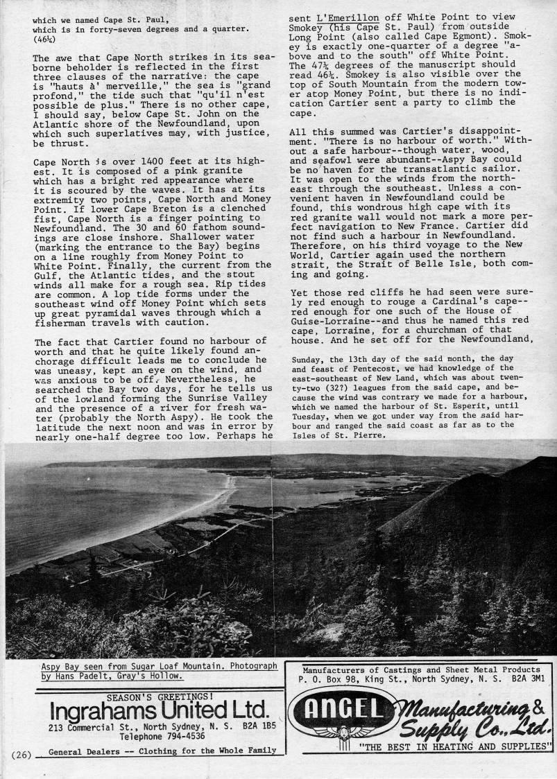 Published by Ronald Caplan on 1982/8/1 (280 reads)which we named Cape St. Paul, which is in forty-seven degrees and a quarter. (46i2;) The awe that Cape North strikes in its sea? borne beholder is reflected in the first three clauses of the narrative: the cape is "hauts a' merveille," the sea is "grand profond," the tide such that "qu'il n'est possible de plus." There is no other cape, I should say, below Cape St. John on the Atlantic shore of the Newfoundland, upon which such superlatives may, with justice, be thrust. Cape North 5 6 over 1400 feet at its high? est. It is composed of a pink granite which has a bright red appearance where it is scoured by the waves. It has at its extremity two points, Cape North and Money Point. If lower Cape Breton is a clenched fist. Cape North is a finger pointing to Newfoundland. The 30 and 60 fathom sound? ings are close inshore. Shallower water (marking the entrance to the Bay) begins on a line roughly from Money Point to White Point. Finally, the current from the Gulf, the Atlantic tides, and the stout winds all make for a rough sea. Rip tides are common. A lop tide forms under the southeast wind off Money Point which sets up great pyramidal waves through which a fisherman travels with caution. The fact that Cartier found no harbour of worth and that he quite likely found an? chorage difficult leads me to conclude he was uneasy, kept an eye on the wind, and was anxious to be off.- Nevertheless, he searched the Bay two days, for he tells us of the lowland forming the Sunrise Valley and the presence of a river for fresh wa? ter (probably the North Aspy). He took the latitude the next noon and was in error by nearly one-half degree too low. Perhaps he sent L'Emerilion off White Point to view Smokey (his Cape St. Paul) from outside Long Point (also called Cape Egmont). Smok? ey is exactly one-quarter of a degree "a- bove and to the south" off White Point. The 47% degrees of the manuscript should read 46%. Smokey is also visible over the top of South Mountain from the modern tow? er atop Money Point, but there is no indi? cation Cartier sent a party to climb the cape. All this summed was Cartier's disappoint? ment. "There is no harbour of worth." With? out a safe harbour--though water, wood, and seafowl were abundant--Aspy Bay could be no haven for the transatlantic sailor. It was open to the winds from the north? east through the southeast. Unless a con? venient haven in Newfoundland could be found, this wondrous high cape with its red granite wall would not mark a more per? fect navigation to New France. Cartier did not find such a harbour in Newfoundland. Therefore, on his third voyage to the New World, Cartier again used the northern strait, the Strait of Belle Isle, both com? ing and going. Yet those red cliffs he had seen were sure? ly red enough to rouge a Cardinal's cape-- red enough for one such of the House of Guise-Lorraine--and thus he named this red cape, Lorraine, for a churchman of that house. And he set off for the Newfoundland, Sunday, the 13th day of the said month, the day and feast of Pentecost, we had knowledge of the east-southeast of New Land, which was about twen? ty-two (32?) leagues from the said cape, and be? cause the wind was contrary we made for a harbour, which we named the harbour of St. Esperit, until Tuesday, when we got under way from the said har? bour and ranged the said coast as far as to the Isles of St. Pierre. Aspy Bay seen from Sugar Loaf Mountain. Photograph by Hans Padelt, Gray's Hollow. SEASON'S GREETINGS! Ingrahams United Ltd. 213 Commercial St., North Sydney, N. S. B2A 185 Telephone 794-4536 (26) General Dealers • Clothing for the Whole Family Manufacturers of Castings and Sheet Metal Products P. 0. Box 98, King St., North Sydney, N. S. B2A 3M1 nnGEL "THE BEST IN HEATING AND SUPPLIES '