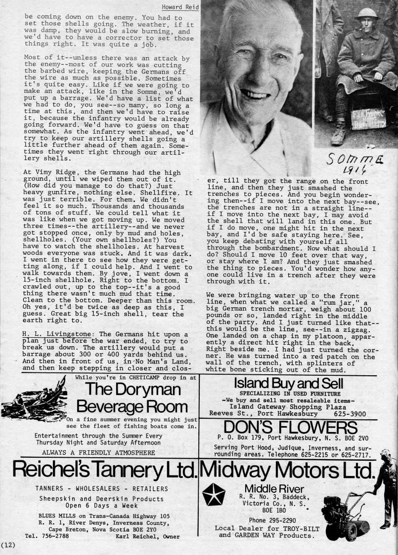 Published by Ronald Caplan on 1983/6/1 (394 reads)Howard Re be coming down on the enemy. You had to set those shells going. The weather, if i was damp, they would be slow burning, and we'd have to have a corrector to set thos things right. It was quite a job. Most of it--unless there was an attack by the enemy--most of our work was cutting the barbed wire, keeping the Germans off the wire as much as possible. .Sometimes it's quite easy. Like if we were going to make an attack, like in the Somme, we'd put up a barrage. We'd have a list of what we had to do, you see--so many, so long a time at this, and then we'd have to raise it, because the infantry would be already going forward. We'd have to guess on that somewhat. As the infantry went ahead, we'd try to keep our artillery shells going a little further ahead of them again. Some? times they went right through our artil? lery shells. At Vimy Ridge, the Germans had the high ground, until we wiped them out of it. (How did you manage to do that?) Just heavy gunfire, nothing else. Shellfire. It was just terrible. For them. We didn't feel it so much. Thousands and thousands of tons of stuff. We could tell what it was like when we got moving up. We moved three times--the artillery--and we never got stopped once, only by mud and holes, shellholes. (Your own shellholes?) You have to watch the shellholes. At harvest woods everyone was stuck. And it was dark. I went in there to see how they were get? ting along, if I could help. And I went to walk towards them. By jove, I went down a 15-inch shellhole. Right to the bottom. I crawled out, up to the top--it's a good thing there wasn't much mud that time. Clean to the bottom. Deeper than this room. Oh yes, it'd be twice as deep as this, I guess. Great big 15-inch shell, tear the earth right to. H. L. Livingstone: The Germans hit upon a plan just before the war ended, to try to break us down. The artillery would put a barrage about 300 or 400 yards behind us. And then in front of us, in'No Man's Land, and then keep stepping in closer and clos- While you're in CHETICAMP drop in at The Doryman Beverage Room 'On a fine summer evening you might just see the fleet of fishing boats come in. Entertainment through the Summer Every Thursday Night and Saturday Afternoon ALWAYS A FRIENDLY ATMOSPHERE Reichel'sTannery Ltd. TANNERS - WHOLESALERS - RETAILERS Sheepskin and Deerskin Products Open 6 Days a Week BLUES MILLS on Trans-Canada Highway 105 R. R. 1, River Denys, Inverness County, Cape Breton, Nova Scotia BOE 2Y0 Tel. 756-2788 Karl Reichel, Owner er, till they got the range on the front line, and then they just smashed the trenches to pieces. And you begin wonder? ing then--if I move into the next bay--see, the trenches are not in a straight line-- if I move into the next bay, I may avoid the shell that will land in this one. But if I do move, one might hit in the next bay, and I'd be safe staying here. See, you keep debating with yourself all through the bombardment. Now what should I do? Should I move 10 feet over that way, or stay where I am? And they just smashed the thing to pieces. You'd wonder how any? one could live in a trench after they were through with it. We were bringing water up to the front line, when what we called a "ram jar," a big German trench mortar, weigh about 100 pounds or so, landed right in the middle of the party. And I just turned like that-- this would be the line, see--in a zigzag. One landed on a chap in my platoon, appar? ently a direct hit right in the back. Right beside me. I had just turned the cor? ner. He was turned into a red patch on the wall of the trench, with splinters of white bone sticking out of the mud. Island Buy and Sell SPECIALIZING IN USED FURNITURE -We buy and sell most resaleable items- Island Gateway Shopping Plaza Reeves St., Port Hawkesbury 625-3900 DON'S FLOWERS p. 0. Box 179, Port Hawkesbury, N. S. BOE 2V0 Serving Port Hood, Judique, Inverness, and sur- rounding areas. Telephone 625-2215 or 625-2717. Midway Motors Ltd ' Middle River R. R. No. 3, Baddeck, Victoria Co., N. S. BOE IBO Phone 295-2290 Local Dealer for TROY-BILT and GARDEN WAY Products. (12)