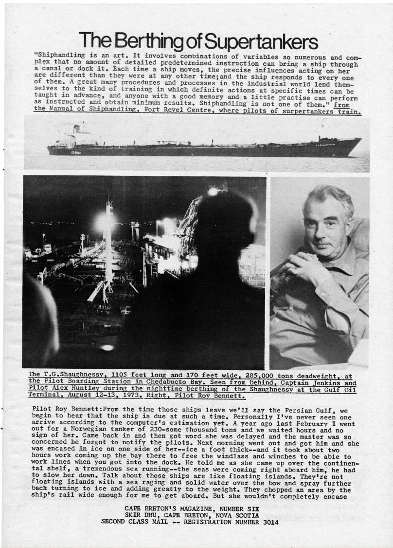Published by Ronald Caplan on 1973/12/1 (4401 reads)The Berthing of Supertankers "Shiphandling is an art. It involves combinations of variables so numerous and com? plex that no amount of detailed predetermined instruction can bring a ship through a canal or dock it. Each time a ship moves, the precise influences actii' on her are different than they were at any other time;and the ship responds to every one of thera. A great many procedures and processes in the industrial world lend them? selves to the kind of training in which definite actions at specific times can be taught in advance, and anyone with a good memory and a little practise can perform as instructed and obtain minimUin results. Shiphandling is not one of them." from the Manual of Shiphandling, Port Revel Centre, where pilots of surpertankers train. The T.G.Shaughnessy, 1105 feet long and 170 feet wide. 285.000 tons deadweight, at the Pilot Boarding Station in Chedabucto Bay. Seen from behind. Captain Jenkins and Pilot Alex Huntley during the nighttime berthing of the Shaughnessy at the Gulf Oil Terminal, August 12-13. 1973. Right, Pilot Roy Bennett. Pilot Roy Bennett:From the time those ships leave we'll say the Persian Gulf, we begin to hear that the ship is due at such a time. Personally I've never seen one arrive according to the computer's estimation yet. A year ago last February I went out for a Norwegian tanker of 230-some thousand tons and we waited hours and no sign of her. Came back in and then got word she was delayed and the master was so concerned he forgot to notify the pilots. Next morning went out and got him and she was encased in ice on one side of her • ice a foot thick • and it took about two hours work coming up the bay there to free the windlass and winches to be able to work lines when you got into the dock. Ke told me as she came up over the continen? tal shelf, a tremendous sea running • the seas were coming right aboard hira, he had to slow her down. Talk about those ships are like floating islands. They're not floating islands with a sea raging and solid water over the bow and spray further back turning to ice and adding greatly to the weight. They chopped an area by the ship's rail wide enough for me to get aboard. But she wouldn't completely encase CAPB BRETON'S MAGAZINE, NUMBER SIX SKIR DHU, CAPB BRETON, NOVA SCOTIA SECOND CLASS MAIL • REGISTRATION NUMBER 3014