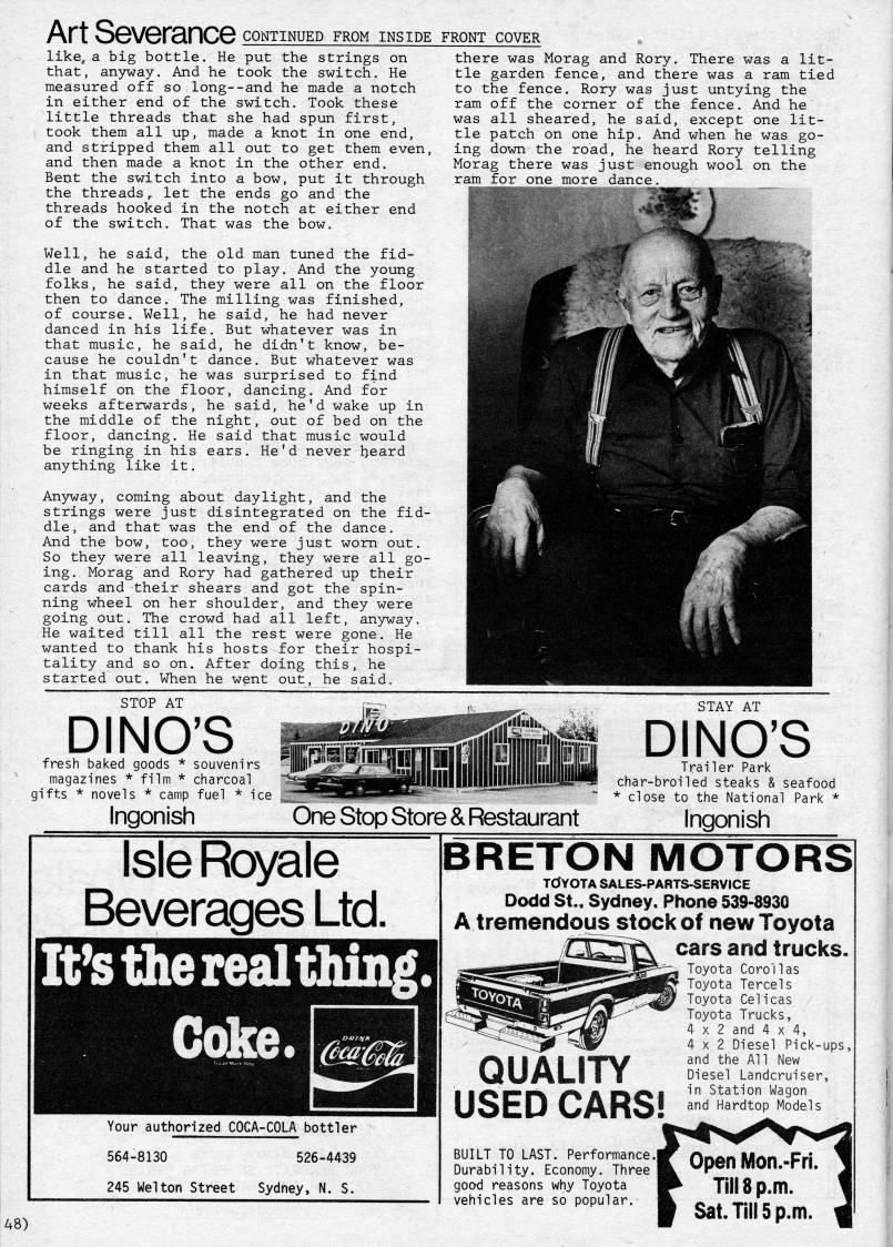 Published by Ronald Caplan on 1983/6/1 (305 reads)Art Severance CONTINUED FROM INSIDE FRONT COVER like, a big bottle. He put the strings on that, anyway. And he took the switch. He measured off so long--and he made a notch in either end of the switch. Took these little threads that she had spun first, took them all up, made a knot in one end, and stripped them all out to get them even, and then made a knot in the other end. Bent the switch into a bow, put it through the threads ' let the ends go and the threads hooked in the notch at either end of the switch. That was the bow. Well, he said, the old man tuned the fid? dle and he started to play. And the young folks, he said, they were all on the floor then to dance. The milling was finished, of course. Well, he said, he had never danced in his life. But whatever was in that music, he said, he didn't know, be? cause he couldn't dance. But whatever was in that music, he was surprised to find himself on the floor, dancing. And for weeks afterwards, he said, he'd wake up in the middle of the night, out of bed on the floor, dancing. He said that music would be ringing in his ears. He'd never heard anything like it. Anyway, coming about daylight, and the strings were just disintegrated on the fid? dle , and that was the end of the dance. And the bow, too, they were just worn out. So they were all leaving, they were all go? ing. Morag and Rory had gathered up their cards and their shears and got the spin? ning wheel on her shoulder, and they were going out. The crowd had all left, anyway. He waited till all the rest were gone. He wanted to thank his hosts for their hospi? tality and so on. After doing this, he started out. When he went out, he said. there was Morag and Rory. There was a lit? tle garden fence, and there was a ram tied to the fence. Rory was just untying the ram off the comer of the fence. And he was all sheared, he said, except one lit? tle patch on one hip. And when he was go? ing down the road, he heard Rory telling Morag there was just enough wool on the ram for one mOi~e Jance. STOP AT DINO'S fresh baked goods * souvenirs magazines * film * charcoal gifts ?? ' ?? - - • • ?? novels charcoal camp fuel * ice Ingonish One Stop Store & Restaurant DINO'S Trailer Park char-broiled steaks & seafood * close to the National Park * Ingonish IsleRoyale Beverages Ltd. It's tiie real thing. ,'& Coke. Your authorized COCA-COLA bottler 564-8130 526-4439 245 Welton Street Sydney, N. S. BRETON MOTORS TdYOTA SALES-PARTS-SERVICE Dodd St.. Sydney. Rhone 539-8930 A tremendous stock of new Toyota cars and trucks. Toyota Corollas Toyota Tercels Toyota Celicas Toyota Trucks, 4 X 2 and 4 X 4, 4x2 Diesel Pick-ups. and the All New Diesel Landcruiser, in Station Wagon and Hardtop Models QUALITY USED CARS! BUILT TO LAST. Performance.! Durability. Economy. Three] good reasons why Toyota vehicles are so popular. 48) Open Mon.-Fri. Till 8 p.m. Sat. Till 5 p.m.