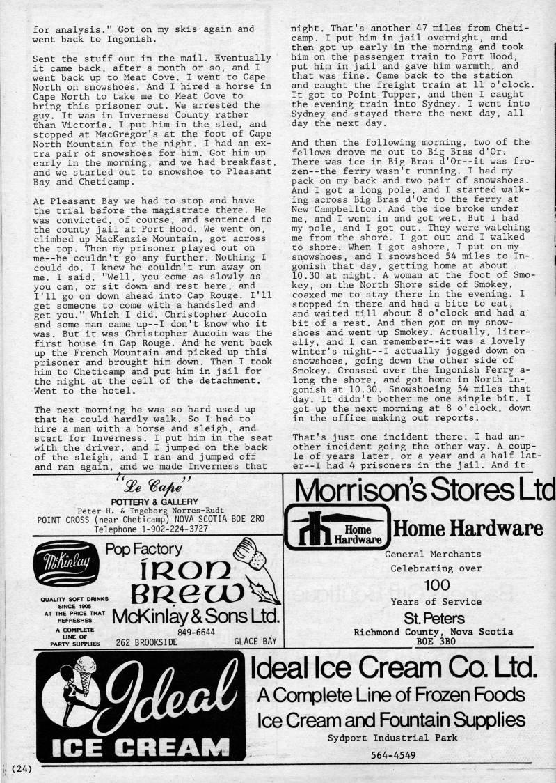 for analysis." Got on my skis again and went back to Ingonish. Sent the stuff out in the mail. Eventually it came back, after a month or so, and I went back up to Meat Cove. I went to Cape North on snowshoes. And I hired a horse in Cape North to take me to Meat Cove to bring this prisoner out. We arrested the guy. It was in Inverness County rather than Victoria. I put him in the sled, and stopped at MacGregor's at the foot of Cape North Mountain for the night. I had an ex? tra pair of snowshoes for him. Got him up early in the morning, and we had breakfast, and we started out to snowshoe to Pleasant Bay and Cheticamp. At Pleasant Bay we had to stop and have the trial before the magistrate there. He was convicted, of course, and sentenced to the county jail at Port Hood. We went on, climbed up MacKenzie Mountain, got across the top. Then my prisoner played out on me--he couldn't go any further. Nothing I could do. I knew he couldn't run away on me. I said, "Well, you come as slowly as you can, or sit down and rest here, and I'll go on down ahead into Cap Rouge. I'll get someone to come with a handsled and get you." Which I did. Christopher Aucoin and some man came up--I don't know who it was. But it was Christopher Aucoin was the first house in Cap Rouge. And he went back up the French Mountain and picked up this prisoner and brought him down. Then I took him to Cheticamp and put him in jail for the night at the cell of the detachment. Went to the hotel. The next morning he was so hard used up that he could hardly walk. So I had to hire a man with a horse and sleigh, and start for Inverness. I put him in the seat with the driver, and I jumped on the back of the sleigh, and I ran and jumped off and ran again, and we made Inverness that -r. night. That's another 47 miles from Cheti? camp. I put him in jail overnight, and then got up early in the morning and took him on the passenger train to Port Hood, put him in jail and gave him warmth, and that was fine. Came back to the station and caught the freight train at 11 o'clock. It got to Point Tupper, and then I caught the evening train into Sydney. I went into Sydney and stayed there the next day, all day the next day. And then the following morning, two of the fellows drove me out to Big Bras d'Or. There was ice in Big Bras d'Or--it was fro? zen- -the ferry wasn't running. I had my pack on my back and two pair of snowshoes. And I got a long pole, and I started walk? ing across Big Bras d'Or to the ferry at New Campbellton. And the ice broke under me, and I went in and got wet. But I had my pole, and I got out. They were watching me from the shore. I got out and I walked to shore. When I got ashore, I put on my snowshoes, and I snowshoed 54 miles to In? gonish that day, getting home at about 10.30 at night. A woman at the foot of Smo? key, on the North Shore side of Smokey, coaxed me to stay there in the evening. I stopped in there and had a bite to eat, and waited till about 8 o'clock and had a bit of a rest. And then got on my snow- shoes and went up Smokey. Actually, liter? ally, and I can remember--it was a lovely winter's night--I actually jogged down on snowshoes, going down the other side of Smokey. Crossed over the Ingonish Ferry a- long the shore, and got home in North In? gonish at 10.30. Snowshoeing 54 miles that day. It didn't bother me one single bit. I got up the next morning at 8 o'clock, down in the office making out reports. That's just one incident there. I had an? other incident going the other way. A coup? le of years later, or a year and a half lat- er--I had 4 prisoners in the jail. And it 'e "'a/ie POTTERY & GALLERY Peter H. & Ingeborg Norres-Rudt POINT CROSS (near Cheticamp) NOVA SCOTIA BOE 2R0 Telephone 1-902-224-3727 QUALITY SOFT DfflNKS SINCE 1905 AT THE PRICE THAT REFRESHES Pop Factory iRor? McKinlay&SonsLtd.; A COMPLETE UNE OF PARTY SUPPUES 262 BROOKS IDE 849-6644 GLACE BAY Morrison's Stores Ltd Home Hardware General Merchants Celebrating over 100 Years of Service StPeters Richmond County, Nova Scotia BOE 3B0 Ideal Ice Cream Co. Ltd. A Complete Line of Frozen Foods Ice Cream and Fountain Supplies Sydport Industrial Park 564-4549 (24)