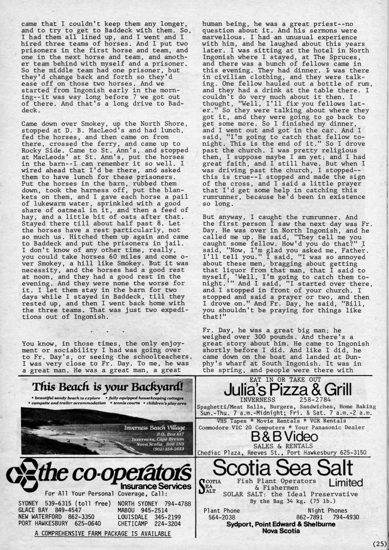 came that I couldn't keep them any longer, and to try to get to Baddeck with them. So, I had them all lined up, and I went and I hired three teams of horses. And I put two prisoners in the first horse and team, and one in the next horse and team, and anoth? er team behind with myself and a prisoner. So the middle team had one prisoner, but they'd change back and forth so they'd ease off on those two horses. And we started from Ingonish early in the morn? ing- -it was way long before 7 we got out of there. And that's a long drive to Bad- deck. Came down over Smokey, up the North Shore, stopped at D. B. MacLeod's and had lunch, fed the horses, and then came on from there, crossed the ferry, and came up to Rocky Side. Came to St. Ann's, and stopped at MacLeods' at St. Ann's, put the horses in the barn--I can remember it so well. I wired ahead that I'd be there, and asked them to have lunch for these prisoners. Put the horses in the barn, rubbed them down, took the harness off, put the blan? kets on them, and I gave each horse a pail of lukewarm water, sprinkled with a good share of oatmeal in it, and then a feed of hay, and a little bit of oats after that. Stayed there till about half past 8. Let the horses have a rest particularly, not so much us. Hitched them up again and came to Baddeck and put the prisoners in jail. I don't know of any other time, really, you could take horses 60 miles and come o- ver Smokey, a hill like Smokey. But it was necessity, and the horses had a good rest at noon, and they had a good rest in the evening. And they were none the worse for it. I let them stay in the barn for two days while I stayed in Baddeck, till they rested up, and then I went back home with the three teams. That was just two expedi? tions out of Ingonish. You know, in those times, the only enjoy? ment or sociability I had was going over to Fr. Day's, or seeing the schoolteachers. I was very close to Fr. Day. To me, he was a great man. He was a great man, a great human being, he was a great priest--no question about it. And his sermons were marvellous. I had an unusual experience with him, and he laughed about this years later. I was sitting at the hotel in North Ingonish where I stayed, at The Spruces, and there was a bunch of fellows came in this evening. They had dinner. I- was there in civilian clothing, and they were talk? ing. One fellow hauled out a bottle of riom, and they had a drink at the table there. I couldn't do very much about it then. I thought, "Well, I'll fix-you fellows lat? er." So they were talking about where they got it, and they were going to go back to get some more. So I finished my dinner, and I went out and got in the car. And I said, "I'm going to catch that fellow to? night. This is the end of it." So I drove past the church. I was pretty religious then, I suppose maybe I am yet; and I had great faith, and I still have. But when I was driving past the church, I stopped-- this is true--I stopped and made the sign of the cross, and I said a little prayer that I'd get some help in catching this j rumrunner, because he'd been in existence ' so long. j But anyway, I caught the rumrunner. And , the first person I saw the next day was Fr. I Day. He was over in North Ingonish, and he I called me up. He said, "They tell me you I caught some fellow. How'd you do that?" I j said, "Now, I'm glad you asked me, Father. I'll tell you." I said, "I was so annoyed | about these men, bragging about getting that liquor from that man, that I said to myself, 'Well, I'm going to catch them to? night.'" And I said, "I started over there, and I stopped in front of your church. I stopped and said a prayer or two, and then I drove on." And Fr. Day, he said, "Bill, you shouldn't be praying for things like that!" Fr. Day, he was a great big man; he weighed over 300 pounds. And there's a great story about him. He came to Ingonish shortly before I did. And like I did, he came down on the boat and landed at Dun? phy 's wharf at South Ingonish. It was in the spring, and people were there with Tftjs Beack is your BackyarcQ • beautiful sandy beach to explore • fully equipped housekeeping cottajics * campsite and trailer accommodation * tennis courts ?? children's play area C'thd cooperMot' f' Insurance Services '' For All Your Personal Coverage, Call: SYDNEY 539-6315 (toll free) GLACE BAY 849-4547 NEW WATERFORD 862-3350 PORT HAWKESBURY 625-0640 NORTH SYDNEY 794-4788 MABOU 945-2514 LOUISDALE 345-2199 CHETICAMP 224-3204 A COMPREHENSIVE FARM PACKAGE IS AVAILABLE EAT IN OR TAKE OUT Julia's Pizza & Grill INVERNESS 258-2784 Spaghetti/Meat Balls, Burgers, Sandwiches, Home Baking Sun.-Thu. 7 a.m.-Midnight; Fri. & Sat. 7 a.m.-2 a.m. VHS Tapes * Movie Rentals * VCR Rentals Commodore VIC 20 Computers * Your Panasonic Dealer B&B; Video SALES & RENTALS Chediac Plaza, Reeves St., Port Hawkesbury 625-3150 Scotia Sea Salt COTIA EA ALT Fish Plant Operators I imitGCl & Fishermen SOLAR SALT: the Ideal Preservative By the Bag 34 kg. (75 lb.) Plant Phone Night Phones 564-2038 862-7891 794-4930 Sydport, Point Edward & Shelburne Nova Scotia (25)