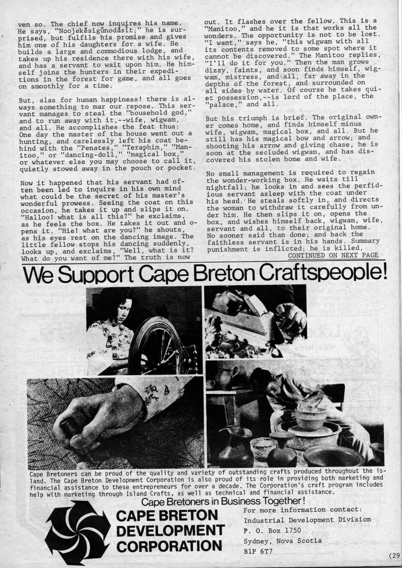 Published by Ronald Caplan on 1983/8/1 (292 reads)ven so. The chief now inquires his name. He says, "Noojekesigunodasit;" he is sur? prised, but fulfils his promise and gives him one of his daughters for a wife. He builds a large and commodious lodge, and takes up his residence there with his wife, and has a servant to wait upon him. He him? self joins the hunters in their expedi? tions in the forest for game, and all goes on smoothly for a time. But, alas for human happiness! there is al? ways something to mar our repose. This ser? vant manages to steal the "household god," and to run away with it,--wife, wigwam, and all. He accomplishes the feat thus: One day the master of the house went out a hunting, and carelessly left his coat be? hind with the "Penates," "Teraphim," "Man? itoo," or "dancing-doll," "magical box," or whatever else you may choose to call it, quietly stowed away in the pouch or pocket. Now it happened that his servant had of? ten been led to inquire in his own mind what could be the secret of his master's wonderful prowess. Seeing the coat on this occasion, he takes it up and slips it on. "Halloo! what is all this?" he exclaims, as he feels the box. He takes it out and o- pens it. "Hie! what are you?" he shouts, as his eyes rest on the dancing image. The little fellow stops his dancing suddenly, looks up, and exclaims, "Well, what is it? What do you want of me?" The truth is now out. It flashes over the fellow. This is a "Manitoo," and he it is that works all the wonders. The opportunity is not to be lost. "I want," says he, "this wigwam with all its contents removed to some spot where it cannot be discovered." The Manitoo replies, "I'll do it for you." Then the man grows dizzy, faints, and soon finds himself, wig? wam, mistress, and all, far away in the depths of the forest, and surrounded on all sides by water. Of course he takes qui? et possession,--is lord of the place, the "palace," and all. But his triumph is brief. The original own? er comes home, and finds himself minus wife, wigwam, magical box, and all. But he still has his magical bow and arrow; and shooting his arrow and giving chase, he is soon at the secluded wigwam, and has dis? covered his stolen home and wife. No small management is required to regain the wonder-working box. He waits till nightfall; he looks in and sees the perfid? ious servant asleep with the coat under his head. He steals softly in, and directs the woman to withdraw it carefully from un? der him. He then slips it on, opens the box, and wishes himself back, wigwam, wife, servant and all, to their original home. No sooner said than done; and back the faithless servant is in his hands. Summary punishment is inflicted; he is killed, CONTINUED ON NEXT PAGE Vfe Support Cape Breton Craftspeople! Cape Bretoners can be proud of the quality and variety of outstanding crafts produced throughout the is? land. The Cape Breton Development Corporation is also proud of its role in providing both marketing and financial assistance to these entrepreneurs for over a decade. The Corporation's craft program includes help with marketing through Island Crafts, as well as technical and financial assistance. Cape Bretoners in Business Together! ' AnJC IPDCT''M '?' more information contact: DEVELOPMENT CORPORATION Industrial Development Division P. 0. Box 1750 Sydney, Nova Scotia BIP 6T7 (29