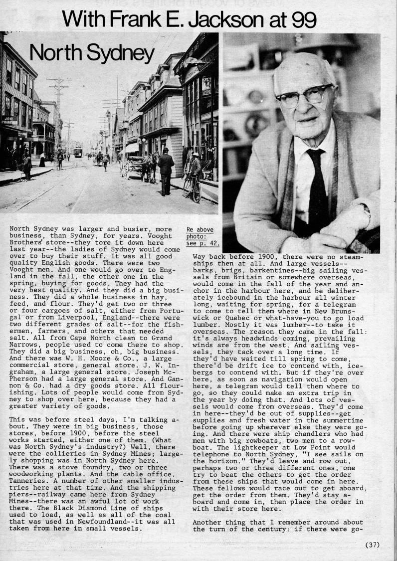 Published by Ronald Caplan on 1983/8/1 (348 reads)With Frank E. Jackson at 99 North Sydney North Sydney was larger and busier, more business, than Sydney, for years. Vooght Brotjhers' store--they tore it down here last year--the ladies of Sydney would come over to buy their stuff. It was all good quality English goods. There were two Vooght men. And one would go over to Eng? land in the fall, the other one in the spring, buying for goods. They had the very best quality. And they did a big busi? ness. They did a whole business in hay, feed, and flour. They'd get two or three or four cargoes of salt, either from Portu? gal or from Liverpool, England--there were two different grades of salt--for the fish? ermen, farmers, and others that needed salt. All from Cape North clean to Grand Narrows, people used to come there to shop. They did a big business, oh, big business. And there was W. H. Moore & Co., a large commercial store, general store. J. W. In? graham, a large general store. Joseph Mc- Pherson had a large general store. And Gan? non & Co. had a dry goods store. All flour? ishing. Lots of people would come from Syd? ney to shop over here, because they had a greater variety of goods. This was before steel days, I'm talking a- bout. They were in big business, those stores, before 1900, before the steel works started, either one of them. (What was North Sydney's industry?) Well, there were the collieries in Sydney Mines; large? ly shopping was in North Sydney here. There was a stove foundry, two or three woodworking plants. And the cable office. Tanneries. A number of other smaller indus? tries here at that time. And the shipping piers--railway came here from Sydney Mines--there was an awful lot of work there. The Black Diamond Line of ships used to load, as well as all of the coal that was used in Newfoundland--it was all taken from here in small vessels. Way back before 1900, there were no steam? ships then at all. And large vessels-- barks, brigs, barkentines--big sailing ves? sels from Britain or somewhere overseas, would come in the fall of the year and an? chor in the harbour here, and be deliber? ately icebound in the harbour all winter long, waiting for spring, for a telegram to come to tell them where in New Bruns? wick or Quebec or what-have-you to go load lumber. Mostly it was lumber--to take it overseas. The reason they came in the fall: it's always headwinds coming, prevailing winds are from the westo And sailing ves? sels, they tack over a long time. If they'd have waited till spring to come, there'd be drift ice to contend with, ice? bergs to contend with. But if they're over here, as soon as navigation would open here, a telegram would tell them where to go, so they could make an extra trip in the year by doing that. And lots of ves? sels would come from overseas. They'd come in here--they'd be out of supplies--get supplies and fresh water in the sijmmertime before going up wherever else they were go? ing , And there were ship chandlers who had men with big rowboats, two men to a row- boat. The lightkeeper at Low Point would telephone to North Sydney, "I see sails on the horizon." They'd leave and row out, perhaps two or three different ones, one try to beat the others to get the order from these ships that would come in here. These fellows would race out to get aboard, get the order from them. They'd stay a- board and come in, then place the order in with their store here. Another thing that I remember around about the turn of the century: if there were go- (37)