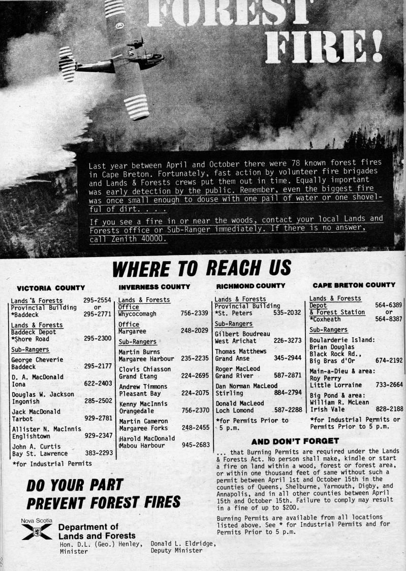 Published by Ronald Caplan on 1983/8/1 (415 reads)WHERE TO REACH US VICTORIA COUNTY INVERNESS COUNTY Lands *& Forests Provincial Building Baddeck Lands & Forests Baddeck Depot Shore Road Sub-Ranqers George Cheverie Baddeck D. A. MacDonald lona Douglas W. Jackson Ingonish Jack MacDonald Tarbot Allister N. Maclnnis Englishtown John A. Curtis Bay St. Lawrence 295-2554 or 295-2771 295-2300 295-2177 622-2403 285-2502 929-2781 929-2347 383-2293 *for Industrial Permits Lands & Forests Office Whycocomagh Office Margaree Sub-Rangers Martin Burns Margaree Harbour Clovis Chiasson Grand Etang Andrew Timmons Pleasant Bay Kenny Maclnnis Orangedale Martin Cameron Margaree Forks [Harold MacDonald (Mabou Harbour 756-2339 248-2029 235-2235 224-2695 224-2075 756-2370 248-2455 945-2683 RICHINOND COUNTY Lands & Forests Provincial Building *St. Peters 535-2032 DO YOUR PART PREVENT FOREST FIRES Nova Scotia 'pj'' Department of Lands and Forests Hon. D.L. (Geo.) Henley, Minister H Sub-Rangers Gilbert Boudreau West Arichat 226-3273 Thomas Matthews Grand Anse 345-2944 Roger MacLeod Grand River 587-2871 Dan Norman MacLeod Stirling 884-2794 Donald MacLeod Loch Lomond 587-2288 *for Permits Prior to ' 5 p.m. AND DON'T FORGET ... that Burning Permits are required under the Lands & Forests Act. No person shall make, kindle or start a fire on land within a wood, forest or forest area, or within one thousand feet of same without such a permit between April 1st and October 15th in the counties of Queens, Shelburne, Yarmouth, Digby, and Annapolis, and in all other counties between April 15th and October 15th. Failure to comply may result in a fine of up to $200. Burning Permits are available from all locations listed above. See * for Industrial Permits and for Permits Prior to 5 p.m. CAPE BRETON COUNTY Lands & Forests Depot 564-6389 & Forest Station or Coxheath 564-8387 Sub-Rangers Boularderie Island: Brian Douglas Black Rock Rd., Big Bras d'Or 674-2192 Main-a-Dieu & area: Roy Perry Little Lorraine 733-2664 Big Pond & area: William R. McLean Irish Vale 828-2188] for Industrial Permits or J Permits Prior to 5 p.m. ] Donald L. Eldridge, Deputy Minister