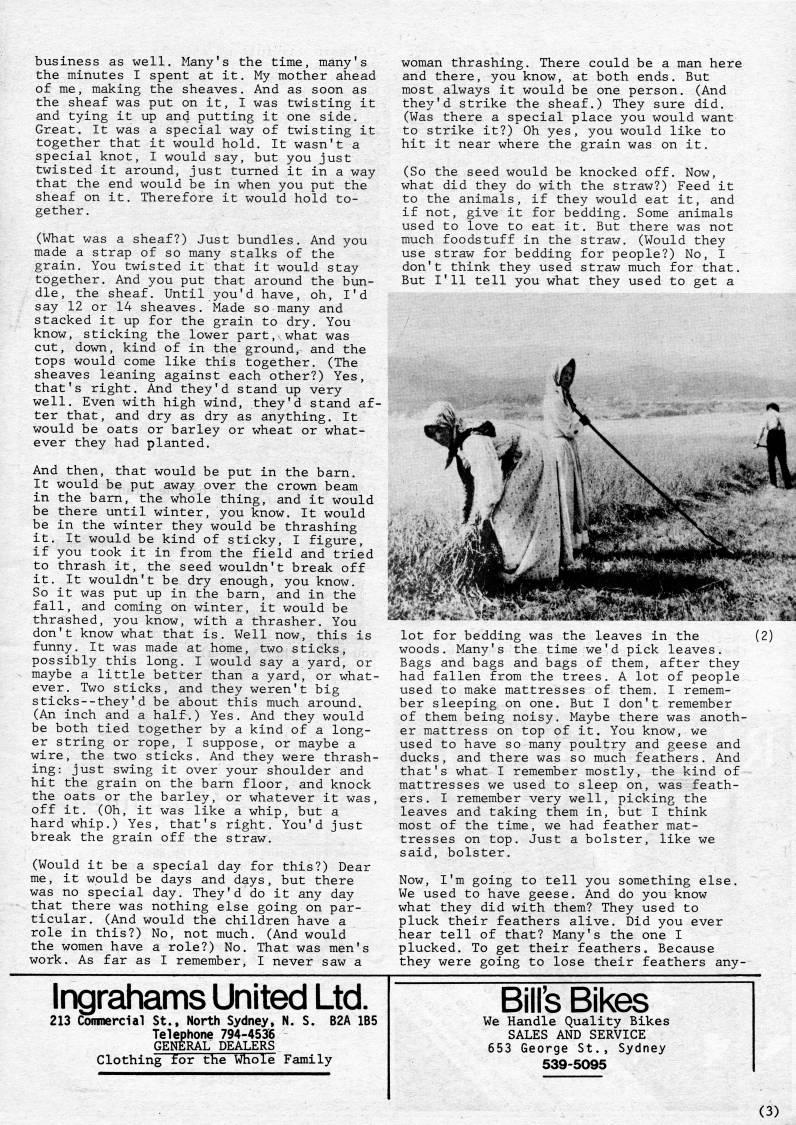 Published by Ronald Caplan on 1983/12/1 (513 reads)business as well. Many's the time, many's the minutes I spent at it. My mother ahead of me, making the sheaves. And as soon as the sheaf was put on it, I was twisting it and tying it up and putting it one side. Great. It was a special way of twisting it together that it would hold. It wasn't a special knot, I would say, but you just twisted it around, just turned it in a way that the end would be in when you put the sheaf on it. Therefore it would hold to? gether. (What was a sheaf?) Just bundles. And you made a strap of so many stalks of the grain. You twisted it that it would stay together. And you put that around the bun? dle, the sheaf. Until you'd have, oh, I'd say 12 or 14 sheaves. Made so many and stacked it up for the grain to dry. You know, sticking the lower part, what was cut, down, kind of in the ground, and the tops would come like this together. (The sheaves leaning against each other?) Yes, that's right. And they'd stand up very well. Even with high wind, they'd stand af? ter that, and dry as dry as anything. It would be oats or barley or wheat or what? ever they had planted. And then, that would be put in the barn. It would be put away over the crown beam in the barn, the whole thing, and it would be there until winter, you know. It would be in the winter they would be thrashing it. It would be kind of sticky, I figure, if you took it in from the field and tried to thrash it, the seed wouldn't break off it. It wouldn't be dry enough, you know. So it was put up in the barn, and in the fall, and coming on winter, it would be thrashed, you know, with a thrasher. You don't know what that is. Well now, this is funny. It was made at home, two sticks, possibly this long. I would say a yard, or maybe a little better than a yard, or what? ever. Two sticks, and they weren't big sticks--they'd be about this much around. (An inch and a half.) Yes. And they would be both tied together by a kind of a long? er string or rope, I suppose, or maybe a wire, the two sticks. And they were thrash? ing: just swing it over your shoulder and hit the grain on the barn floor, and knock the oats or the barley, or whatever it was, off it. (Oh, it was like a whip, but a hard whip.) Yes, that's right. You'd just break the grain off the straw. (Would it be a special day for this?) Dear me, it would be days and days, but there was no special day. They'd do it any day that there was nothing else going on par? ticular. (And would the children have a role in this?) No, not much. (And would the women have a role?) No. That was men's work. As far as I remember, I never saw a woman thrashing. There could be a man here and there, you know, at both ends. But most always it would be one person. (And they'd strike the sheaf.) They sure did. (Was there a special place you would want to strike it?) Oh yes, you would like to hit it near where the grain was on it. (So the seed would be knocked off. Now, what did they do with the straw?) Feed it to the animals, if they would eat it, and if not, give it for bedding. Some animals used to love to eat it. But there was not much foodstuff in the straw. (Would they use straw for bedding for people?) No, I don't think they used straw much for that. But I'll tell you what they used to get a lot for bedding was the leaves in the woods. Many's the time we'd pick leaves. Bags and bags and bags of them, after they had fallen from the trees. A lot of people used to make mattresses of them. I remem? ber sleeping on one. But I don't remember of them being noisy. Maybe there was anoth? er mattress on top of it. You know, we used to have so many poultry and geese and ducks, and there was so much feathers. And that's what I remember mostly, the kind of mattresses we used to sleep on, was feath? ers. I remember very well, picking the leaves and taking them in, but I think most of the time, we had feather mat? tresses on top. Just a bolster, like we said, bolster. Now, I'm going to tell you something else. We used to have geese. And do you know what they did with them? They used to pluck their feathers alive. Did you ever hear tell of that? Many's the one I plucked. To get their feathers. Because they were going to lose their feathers any- (2) Ingrahams United Ltd. 213 Conmercial St., North Sydney, N. S. B2A 1B5 Telephone 794-4536 GENERAL' DEALERS Clothing for the Whole Family Bill's Bikes We Handle Quality Bikes SALES AND SERVICE 653 George St., Sydney 539-5095 (3)