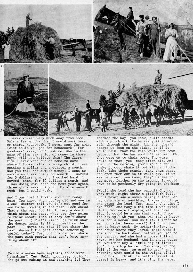 Published by Ronald Caplan on 1983/12/1 (351 reads)I never worked very much away from home. Only a few months that I would work here or there. Housework. I never went far away. (What could you get for housework?) For goodness' sake, don't ask me. Who in the name of time saw a lot of money in those days? Will you believe this? The first time I ever went out of home to work, where I looked after a young child, I was getting a dollar and a quarter a month. Now you talk about much money! I went to work when I was doing housework, I worked for 5 dollars a month. I worked hard. I worked, then, for 10 dollars a month, and I was doing work that the next year again, three girls were doing it. My size wasn't much, but I could work. And I was just thinking about it today here. You know, when you're old and you're alone, doctors tell you it's not good for you to be looking in the past. Look ahead. That's the way. But if old people don't think about the past, what are they going to think about? (And if they don't share the past....) That's right. (I think what the doctor means is if you dwell on the past....) Maybe so. (But if you share the past, doesn't the past become something useful today?) Yes, but how can you share the past with people that don't know any? thing about it? (Would a woman have anything to do with haymaking?) Yes. Well, goodness, couldn't she go out raking it and stacking it? They stacked the hay, you know, built stacks with a pitchfork, to be ready if it would rain through the night. And then they'd scrape it down on the sides, so if it would rain, that the rain would run down better, that the hay wouldn't get wet. Oh, they were up to their work. The women could do that, yes, they often did. And then in the morning, you'd go out and shake it out, shake it out with a pitch? fork. Take those stacks, take them apart and open them out so it would dry. If it was very wet, you know, they'd shake it out more, further on the ground. It would have to be perfectly dry going in the bam. (Would she load the hay wagon?) Oh, not very much. Might throw a pitchfork full. But I never saw a woman making a load, of hay or grain or anything. A woman could go and tramp the load. Yes, many's the time I did that, and many's the time I was tired of it. You were tramping all the time. (But it would be a man that would throw the hay up.) Oh yes, that was rather heavy- work for a woman, wouldn't it? (Didn't wo? men do rather heavy work?) A lot of them can do heavy work. My mother-in-law, at the house where they lived, there were 3 steps to the back door, before you got to the pantry. And she had a house full of boys, and her husband. And in those years you wouldn't buy a little bag of flour; you'd buy a big barrel. You know, in the fall of the year, we used to get 4 and 5 barrels. What would be the weight of it? 90 pounds, I think, is half a barrel. A barrel is heavy, and it's big. She never (5)