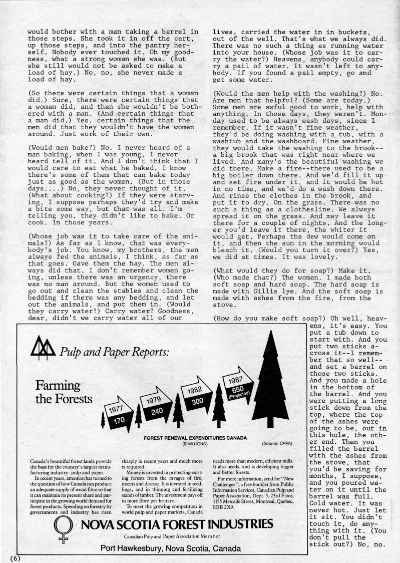 Published by Ronald Caplan on 1983/12/1 (380 reads)would bother with a man taking a barrel in those steps. She took it in off the cart, up those steps, and into the pantry her? self. Nobody ever touched it. Oh my good? ness, what a strong woman she was. (But she still would not be asked to make a load of hay.) No, no, she never made a load of hay. (So there were certain things that a woman did.) Sure, there were certain things that a woman did, and then she wouldn't be both? ered with a man. (And certain things that a man did.) Yes, certain things that the men did that they wouldn't have the women around. Just work of their own. (Would men bake?) No. I never heard of a man baking, when I was young, I never heard tell of it. And I don't think that I would care to eat what he baked. I know there's some of them that can bake today just as good as the women. (But in those days....) No, they never thought of it. (What about cooking?) If they were starv? ing, I suppose perhaps they'd try and make a bite some way, but that was all. I'm telling you, they didn't like to bake. Or cook. In those years. (Whose job was it to take care of the ani? mals?) As far as I know, that was every? body's job. You know, my brothers, the men always fed the animals, I think, as far as that goes. Gave them the hay. The men al? ways did that. I don't remember women go? ing, unless there was an urgency, there was no man around. But the women used to go out and clean the stables and clean the bedding if there was any bedding, and let out the animals, and put them in. (Would they carry water?) Carry water? Goodness, dear, didn't we carry water all of our ' Pulp and Paper Reports: Farming the Forests Canada's bountiful forest lands provide the base for the country's largest manu? facturing industry: pulp and paper. In recent years, attention has turned to the question of how Canada can produce an adequate supply of wood fibre so that it can maintain its present share and par? ticipate in the growing world demand for forest products. Spending on forestry by governments and industry has risen sharply in recent years and much more is required. Money is invested in protecting exist? ing forests from the ravages of fire, insects and disease. It is invested in seed? lings, and in thinning and fertilizing stands of timber. The investment pays off in more fibre per hectare. To meet the growing competition in world pulp and paper markets, Canada NOVA SCOTIA FOREST INDUSTRIES Canadian Pulp and Paper Association Me m b er Port Hawkesbury, Nova Scotia, Canada lives, carried the water in in buckets, out of the well. That's what we always did. There was no such a thing as running water into your house. (Whose job was it to car? ry the water?) Heavens, anybody could car? ry a pail of water. It wasn't left to any? body. If you found a pail empty, go and get some water. (Would the men help with the washing?) No. Are men that helpful? (Some are today.) Some men are awful good to work, help with anything. In those days, they weren't. Mon? day used to be always wash days, since I remember. If it wasn't fine weather, they'd be doing washing with a tub, with a washtub and the washboard. Fine weather, they would take the washing to the brook-- a big brook that was right near where we lived. And many's the beautiful washing we did there. Make a fire--there used to be a big boiler down there. And we'd fill it up and set fire under it, and it would be hot in no time, and we'd do a wash down there. And rinse the clothes in the brook, and put it to dry. On the grass. There was no such a thing as a clothesline. We always spread it on the grass. And may leave it there for a couple of nights. And the long? er you'd leave it there, the whiter it would get. Perhaps the dew would come on it, and then the sun in the morning would bleach it. (Would you turn it over?) Yes, we did at times. It was lovely. (What would they do for soap?) Make it. (Who made that?) The women. I made both soft soap and hard soap. The hard soap is made with Gillis lye. And the soft soap is made with ashes from the fire, from the stove. (How do you make soft soap?) Oh well, heav? ens, it's easy. You put a tub down to start with. And you put two sticks a- cross it--I remem? ber that so well-- and set a barrel on those two sticks. And you made a hole in the bottom of the barrel. And you were putting a long stick down from the top, where the top of the ashes were going to be, out in this hole, the oth? er end. Then you filled the barrel with the ashes from the stove, that you'd be saving for months, I suppose, and you poured wa? ter on it until the barrel was full. Cold water. It was never hot. Just let it sit. You didn't touch it, do any? thing with it. (You don't pull the stick out?) No, no. FOREST RENEWAL EXPENDITURES CANADA ($ MILLIONS) (Source: CPPA) needs more than modern, efficient mills. It also needs, and is developing bigger and better forests. For more information, send for "New Challenges", a free booklet from Pubhc Information Services, Canadian Pulp and Paper Association, Dept. 5,23rd Floor, 1155 Metcalfe Street, Montreal, Quebec, H3B 2X9. (6)
