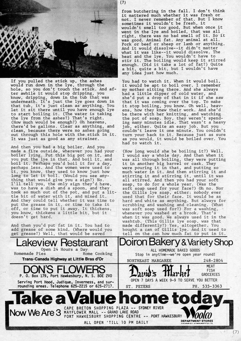 Published by Ronald Caplan on 1983/12/1 (423 reads)If you pulled the stick up, the ashes would run down in the lye, through the hole, so you don't touch the stick. And af? ter awhile it would stop dripping, you know, dripping, down in the tub that was underneath. It's just the lye goes down in that tub, it's just clean as'anything. You let it sit there until you have enough lye to start boiling it. (The water is taking the lye from the ashes?) That's right. (How much would be enough?) Oh heavens, there'd be gallons. Clear as anything, and clean, because there were no ashes going out through this hole with the stick in it. It was just as good as any strainer. And then you had a big boiler. And you made a fire outside, wherever you had your boiler lying. Put this big pot on it, and you put the lye in that. And boil it, and boil it. Perhaps you'd boil it for a day, perhaps less. And the women were used to it, you know, they used to know just how long to let it boil. (Would you see any? thing that would give you a sign?) No. I'll tell you, the only sign they'd have, was to have a dish and a spoon, and they took so much out of the pot, and put a lit? tle bit of water with it, and mixed it. And they could tell whether it was time to put the grease in it, or time to take it off, or time to put it away. It thickens, you know, thickens a little bit, but it doesn't get hard. And then you'd put fat in it. You had to add grease of some kind. (Where would you get grease?) Well, that would be saved (7) from butchering in the fall. I don't think it mattered much whether it was fresh or not. I never remember of that. But I know sometimes it wouldn't be fresh, it wouldn't smell too good. But when once it went in the lye and boiled, that was all right, there was no bad smell of it. So it was good. Animal fat. Any animal at all. Pork or beef or sheep or lamb or anything. And it would dissolve--it didn't matter what it was like--it would dissolve. The heat and the lye. You wouldn't have to stir it. The boiling would keep it stirred enough. (Did it take a lot of fat?) Quite a bit, quite a bit, but I wouldn't have any idea just how much. You had to watch it. When it would boil, it would be apt to boil over. I remember my mother sitting there. And she always had a little dipper of cold water, and she'd put a drop of that in it if she saw that it was coming over the top. To make it stop boiling, you know. Oh well, heav? ens, how they knew their work. And she'd be there with her knitting, and watching the pot of soap. Boy, they weren't spend? ing many minutes idle. That wasn't a heavy job, either. Quite an easy job. But you couldn't leave it one minute. You couldn't turn your back to it. Because just as sure as you would, it would be boiled over. You had to watch it. (How long would she be boiling it?) Well, I would say a whole day. And then when it was all through boiling, they were putting it in another big barrel or cask. They were pouring it in that, and putting so much water in it. And then stirring it and stirring it and stirring it, until it was all stirred. And then you had your soft soap, to do for a whole year. (Was the soft soap used for your face?) Oh no. Nor the Gillis lye soap, either; nobody ever used that for their face. It would be as hard and white as anything. But always for scrubbing and washing and cleaning. (What was soft soap used for?) For a washing, whenever you washed at a brook. That's when it was good. We always used it in the washtub. (This Gillis lye soap, was that made differently?) Yes, altogether. You bought a can of Gillis lye. And it used to tell on the can how much fat to put in it. Lakeview Restaurant Open 24 Hours Homemade Pies Day Home Cooking Trans-Canada Highway at Little Bras d'Or Doiron Bakery & Variety Shop ALL HOMEMADE BAKED GOODS Stop in anytime • we're open year round! NORTHEAST MARGAREE 248-2804 DON'S FLOWERS p. 0. Box 179, Port Hawkesbury, N. S. BOE 2V0 Serving Port Haod, Judique, Inverness' and sur? rounding areas. Telephone 625-2215 or 625-2717. Jimk %cM MEAT FISH GROCERIES OPEN 7 DAYS A WEEK 9-9 TO SERVE YOU BETTER ST. PETERS PH. 535-3363 I Take a Value home today- ,., - ' CAPE BRETON SHOPPING PLAZA -- SYDNEY RIVER -'A MBBt I Now We ArG 3 Mayflower mall - grand lake road mmnn/rn I I MV'vv vvv/r-i'w pQp' HAWKESBURY SHOPPING CENTRE -- PORT HAWKESBURY WJUUIW I ALL OPEN 'TILL 10 PM DAILY P5r,!yj?*'iLTi.TPc'f.! [