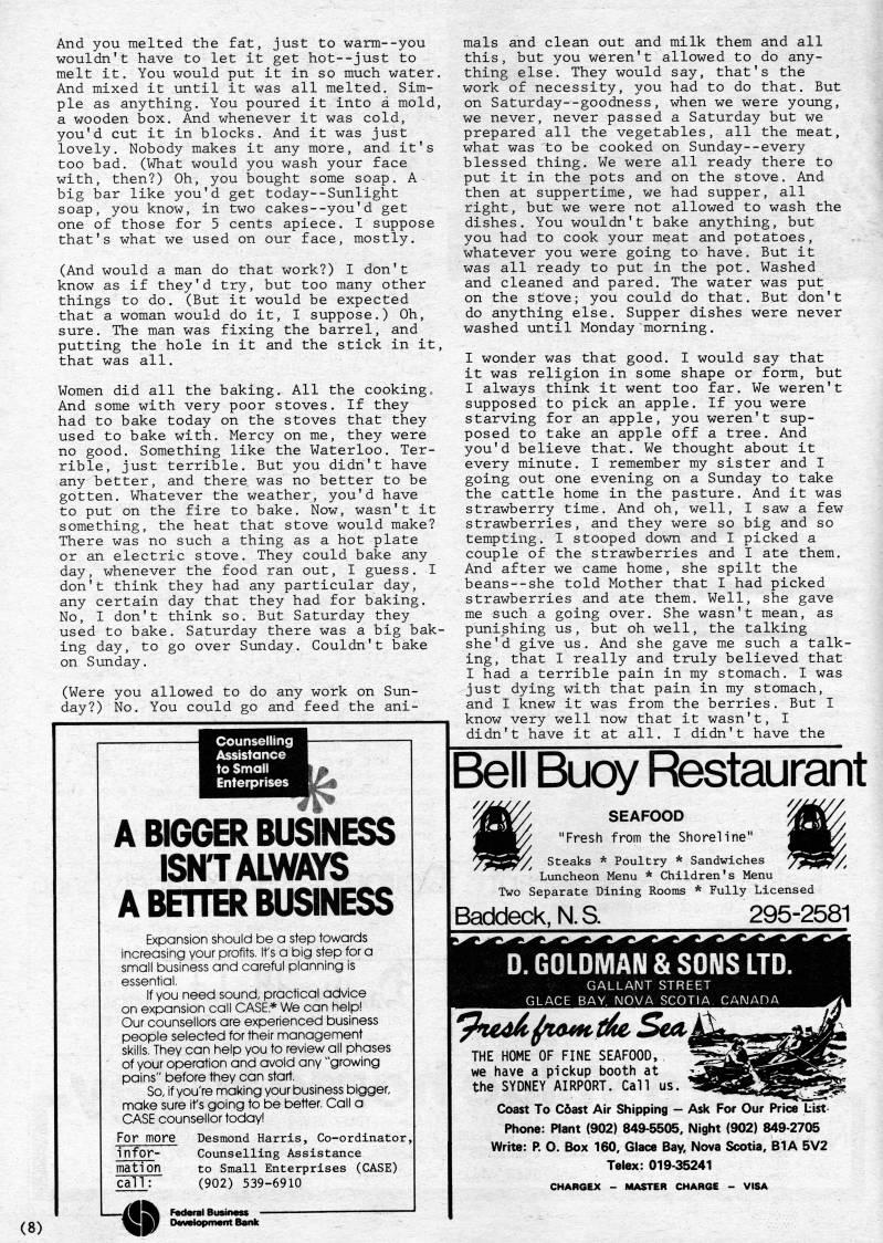 Published by Ronald Caplan on 1983/12/1 (357 reads)And you melted the fat, just to warm--you wouldn't have to let it get hot--just to melt it. You would put it in so much water. And mixed it until it was all melted. Sim? ple as anything. You poured it into a mold, a wooden box. And whenever it was cold, you'd cut it in blocks. And it was just lovely. Nobody makes it any more, and it's too bad. (What would you wash your face with, then?) Oh, you bought some soap. A big bar like you'd get today--Sunlight soap, you know, in two cakes--you'd get one of those for 5 cents apiece. I suppose that's what we used on our face, mostly. (And would a man do that work?) I don't know as if they'd try, but too many other things to do. (But it would be expected that a woman would do it, I suppose.) Oh, sure. The man was fixing the barrel, and putting the hole in it and the stick in it, that was all. Women did all the baking. All the cooking • And some with very poor stoves. If they had to bake today on the stoves that they used to bake with. Mercy on me, they were no good. Something like the Waterloo. Ter? rible, just terrible. But you didn't have any better, and there was no better to be gotten. Whatever the weather, you'd have to put on the fire to bake. Now, wasn't it something, the heat that stove would make? There was no such a thing as a hot plate or an electric stove. They could bake any day, whenever the food ran out, I guess. I don't think they had any particular day, any certain day that they had for baking. No, I don't think so. But Saturday they used to bake. Saturday there was a big bak? ing day, to go over Sunday. Couldn't bake on Sunday. (Were you allowed to do any work on Sun? day?) No. You could go and feed the ani- Counselling Assistance to Small Enterprises A BIGGER BUSINESS ISN'T ALWAYS A BETTER BUSINESS Expansion should be a step towards increasing your profits. It's a big step for a small business and careful planning is essential. If you need sound, practical advice on expansion call CASE* We can help! Our counsellors are experienced business people selected for their managennent skills. They can help you to review all phases of your operation and avoid any "growing pains" before they can start. So, if you're making your business bigger, make sure ifs going to be better. Call a CASE counsellor today! For more Desmond Harris, Co-ordinator, infor- Counselling Assistance mation to Small Enterprises (CASE) call: (902) 539-6910 mals and clean out and milk them and all this, but you weren't allowed to do any? thing else. They would say, that's the work of necessity, you had to do that. But on Saturday--goodness, when we were young, we never, never passed a Saturday but we prepared all the vegetables, all the meat, what was to be cooked on Sunday--every blessed thing. We were all ready there to put it in the pots and on the stove. And then at suppertime, we had supper, all right, but we were not allowed to wash the dishes. You wouldn't bake anything, but you had to cook your meat and potatoes, whatever you were going to have. But it was all ready to put in the pot. Washed and cleaned and pared. The water was put on the stove; you could do that. But don't do anything else. Supper dishes were never washed until Monday morning. I wonder was that good. I would say that it was religion in some shape or form, but I always think it went too far. We weren't supposed to pick an apple. If you were starving for an apple, you weren't sup? posed to take an apple off a tree. And you'd believe that. We thought about it every minute. I remember my sister and I going out one evening on a Sunday to take the cattle home in the pasture. And it was strawberry time. And oh, well, I saw a few strawberries, and they were so big and so tempting. I stooped down and I picked a couple of the strawberries and I ate them. And after we came home, she spilt the beans--she told Mother that I had picked strawberries and ate them. Well, she gave me such a going over. She wasn't mean, as punishing us, but oh well, the talking she'd give us. And she gave me such a talk? ing, that I really and truly believed that I had a terrible pain in my stomach. I was just dying with that pain in my stomach, and I knew it was from the berries. But I know very well now that it wasn't, I didn't have it at all. I didn't have the Bell Buoy Restaurant SEAFOOD ' "Fresh from the Shoreline" ' Steaks * Poultry * Sandwiches Luncheon Menu * Children's Menu Two Separate Dining Rooms * Fully Licensed Baddeck, N.S. 295-2581 (8) OavBtopment Bank THE HOME OF FINE SEAFOOD, we have a pickup booth at the SYDNEY AIRPORT. Call us. Coast To Cdast Air Shipping - Ask For Our Price Hist Phone: Plant (902) 849-5505, Night (902) 849-2705 Write: P. O. Box 160, Glace Bay, Nova Scotia, B1A 5V2 Telex: 019-35241 CHARGEX - MASTER CHARGE - VISA