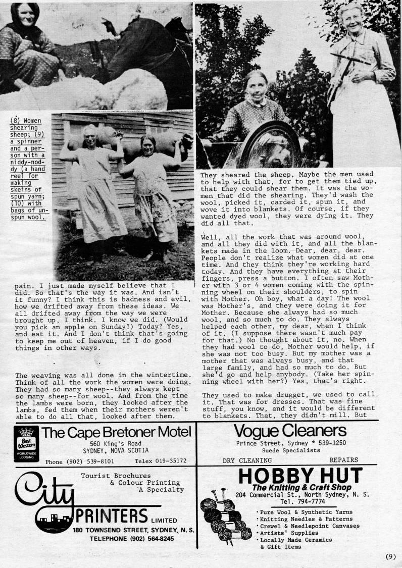 Published by Ronald Caplan on 1983/12/1 (366 reads)the men used them tied up, spun yarn; (lo" ?? ?? pain. I just made myself believe that I did. So that's the way it was. And isn't it funny? I think this is badness and evil, how we drifted away from these ideas. We all drifted away from the way we were brought up, I think. I know we did. (Would you pick an apple on Sunday?) Today? Yes, and eat it. And I don't think that's going to keep me out of heaven, if I do good things in other ways. The weaving was all done in the wintertime. Think of all the work the women were doing. They had so many sheep--they always kept so many sheep--for wool. And from the time the lambs were born, they looked after the lambs, fed them when their mothers weren't able to do all that, looked after them. They sheared the sheep, Maybe to help with that, for to get that they could shear them. It was the wo men that did the shearing. They'd wash the wool, picked it, carded it, spun it, and wove it into blankets. Of course, if they wanted dyed wool, they were dying it. They did all that. Well, all the work that was around wool, and all they did with it, and all the blan? kets made in the loom. Dear, dear, dear. People don't realize what women did at one time. And they think they're working hard today. And they have everything at their fingers, press a button. I often saw Moth? er with 3 or 4 women coming with the spin? ning wheel on their shoulders, to spin with Mother. Oh boy, what a day! The wool was Mother's, and they were doing it for Mother. Because she always had so much wool, and so much to do. They always helped each other, my dear, when I think of it. (I suppose there wasn't much pay for that.) No thought about it, no. When they had wool to do. Mother would help, if she was not too busy. But my mother was a mother that was always busy, and that large family, and had so much to do. But she'd go and help anybody. (Take her spin? ning wheel with her?) Yes, that's right. They used to make drugget, we used to call it. That was for dresses. That was fine stuff, you know, and it would be different to blankets. That, they didn't mill. But The (3ape Bretoner Motel 560 King's Road SYDNEY, NOVA SCOTIA Phone (902) 539-8101 Telex 019-35172 Vogue Cleaners Prince Street, Sydney * 539-1250 Suede Specialists DRY CLEANING REPAIRS Tourist Brochures & Colour Printing A Specialty PRINTERS 180 TOWNSEND STREET, SYDNEY, N. S. TELEPHONE (902) 564-8245 HOBBY HUT The Knitting' Craft Shop 204 Commercial St., North Sydney, N. S. Tel. 794-7774 • Pure Wool & Synthetic Yams ? Knitting Needles & Patterns • Crewel & Needlepoint Canvases • Artists' Supplies • Locally Made Ceramics & Gift Items (9)