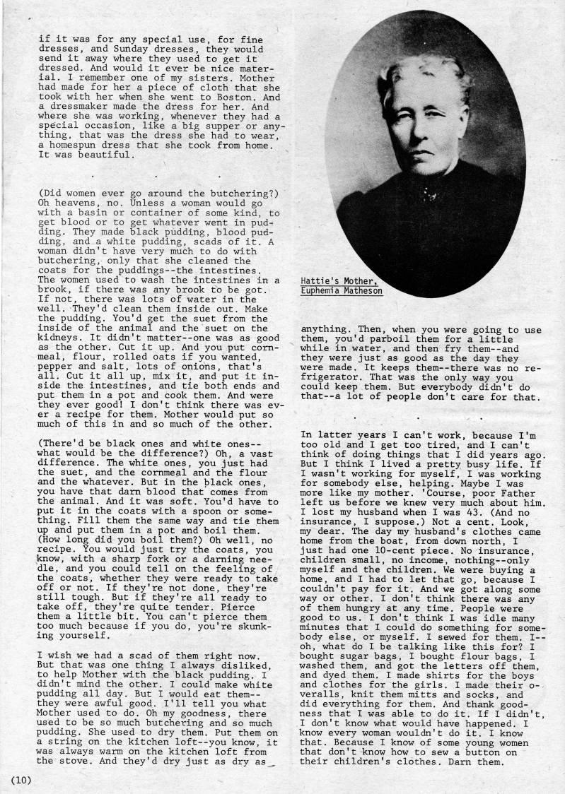 if it was for any special use, for fine dresses, and Sunday dresses, they would send it away where they used to get it dressed. And would it ever be nice mater? ial. I remember one of my sisters. Mother had made for her a piece of cloth that she took with her when she went to Boston. And a dressmaker made the dress for her. And where she was working, whenever they had a special occasion, like a big supper or any? thing, that was the dress she had to wear, a homespun dress that she took from home. It was beautiful. (Did women ever go around the butchering?) Oh heavens, no. Unless a woman would go with a basin or container of some kind, to get blood or to get whatever went in pud? ding. They made black pudding, blood pud? ding, and a white pudding, scads of it. A woman didn't have very much to do with butchering, only that she cleaned the coats for the puddings--the intestines. The women used to wash the intestines in a brook, if there was any brook to be got. If not, there was lots of water in the well. They'd clean them inside out. Make the pudding. You'd get the suet from the inside of the animal and the suet on the kidneys. It didn't matter--one was as good as the other. Cut it up. And you put corn- meal, flour, rolled oats if you wanted, pepper and salt, lots of onions, that's all. Cut it all up, mix it, and put it in? side the intestines, and tie both ends and put them in a pot and cook them. And were they ever good! I don't think there was ev? er a recipe for them. Mother would put so much of this in and so much of the other. (There'd be black ones and white ones-- what would be the difference?) Oh, a vast difference. The white ones, you just had the suet, and the cornmeal and the flour and the whatever. But in the black ones, you have that dam blood that comes from the animal. And it was soft. You'd have to put it in the coats with a spoon or some? thing. Fill them the same way and tie them up and put them in a pot and boil them. (How long did you boil them?) Oh well, no recipe. You would just try the coats, you know, with a sharp fork or a darning nee? dle, and you could tell on the feeling of the coats, whether they were ready to take off or not. If they're not done, they're still tough. But if they're all ready to take off, they're quite tender. Pierce them a little bit. You can't pierce them too much because if you do, you're skunk? ing yourself. I wish we had a scad of them right now. But that was one thing I always disliked, to help Mother with the black pudding. I didn't mind the other. I could make white pudding all day. But I would eat them-- they were awful good. I'll tell you what Mother used to do. Oh my goodness, there used to be so much butchering and so much pudding. She used to dry them. Put them on a string on the kitchen loft--you know, it was always warm on the kitchen loft from the stove. And they'd dry just as dry as__ Hattie's Mother, Euphemia Matheson anything. Then, when you were going to use them, you'd parboil them for a little while in water, and then fry them--and they were just as good as the day they were made. It keeps them--there was no re? frigerator. That was the only way you could keep them. But everybody didn't do that--a lot of people don't care for that. In latter years I can't work, because I'm too old and I get too tired, and I can't think of doing things that I did years ago. But I think I lived a pretty busy life. If I wasn't working for myself, I was working for somebody else, helping. Maybe I was more like my mother. 'Course, poor Father left us before we knew very much about him. I lost my husband when I was 43. (And no insurance, I suppose.) Not a cent. Look, my dear. The day my husband's clothes came home from the boat, from down north, I just had one 10-cent piece. No insurance, children small, no income, nothing--only myself and the children. We were buying a home, and I had to let that go, because I couldn't pay for it. And we got along some way or other. I don't think there was any of them hungry at any time. People were good to us. I don't think I was idle many minutes that I could do something for some? body else, or myself. I sewed for them. I-- oh, what do I be talking like this for? I bought sugar bags, I bought flour bags, I washed them, and got the letters off them, and dyed them. I made shirts for the boys and clothes for the girls. I made their o-. veralls, knit them mitts and socks, and did everything for them. And thank good? ness that I was able to do it. If I didn't, I don't know what would have happened. I know every woman wouldn't do it. I know that. Because I know of some young women that don't know how to sew a button on their children's clothes. Darn them. (10)