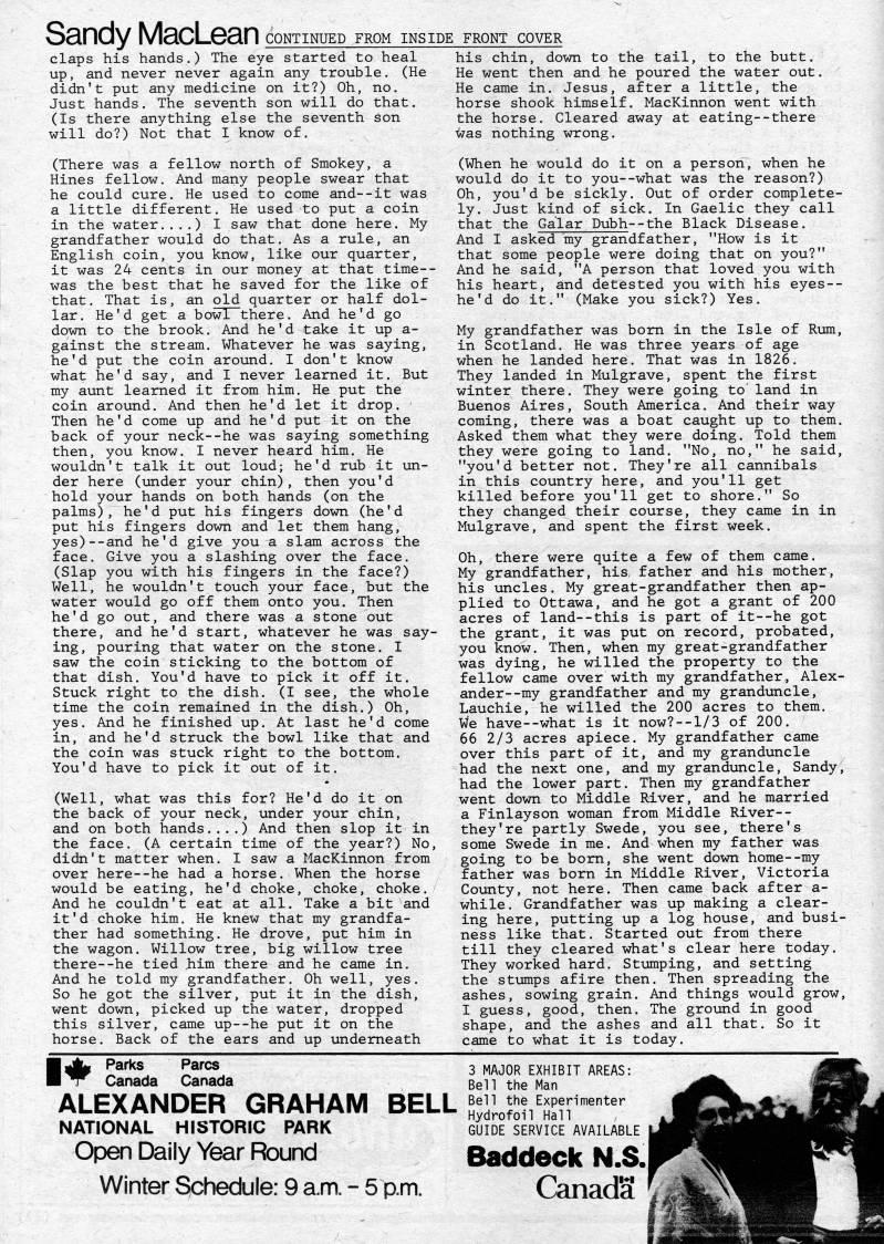 Published by Ronald Caplan on 1983/12/1 (396 reads)Sandy MacLean CONTINUED FROM INSIDE FRONT COVER claps his hands.) The eye started to heal up, and never never again any trouble. (He didn't put any medicine on it?) Oh, no. Just hands. The seventh son will do that. (Is there anything else the seventh son will do?) Not that I know of. (There was a fellow north of Smokey, a Mines fellow. And many people swear that he could cure. He used to come and--it was a little different. He used to put a coin in the water....) I saw that done here. My grandfather would do that. As a rule, an English coin, you know, like our quarter, it was 24 cents in our money at that time-- was the best that he saved for the like of that. That is, an old quarter or half dol? lar. He'd get a bowl there. And he'd go down to the brook. And he'd take it up a- gainst the stream. Whatever he was saying, he'd put the coin around. I don't know what he'd say, and I never learned it. But my aunt learned it from him. He put the coin around. And then he'd let it drop. Then he'd come up and he'd put it on the back of your neck--he was saying something then, you know. I never heard him. He wouldn't talk it out loud; he'd rub it un? der here (under your chin), then you'd hold your hands on both hands (on the palms), he'd put his fingers down (he'd put his fingers down and let them hang, yes)--and he'd give you a slam across the face. Give you a slashing over the face. (Slap you with his fingers in the face?) Well, he wouldn't touch your face, but the water would go off them onto you. Then he'd go out, and there was a stone out there, and he'd start, whatever he was say? ing, pouring that water on the stone. I saw the coin sticking to the bottom of that dish. You'd have to pick it off it. Stuck right to the dish. (I see, the whole time the coin remained in the dish.) Oh, yes. And he finished up. At last he'd come in, and he'd struck the bowl like that and the coin was stuck right to the bottom. You'd have to pick it out of it. (Well, what was this for? He'd do it on the back of your neck, under your chin, and on both hands....) And then slop it in the face. (A certain time of the year?) No, didn't matter when. I saw a MacKinnon from over here--he had a horse. When the horse would be eating, he'd choke, choke, choke. And he couldn't eat at all. Take a bit and it'd choke him. He knew that my grandfa? ther had something. He drove, put him in the wagon. Willow tree, big willow tree there--he tied him there and he came in. And he told my grandfather. Oh well, yes. So he got the silver, put it in the dish, went down, picked up the water, dropped this silver, came up--he put it on the horse. Back of the ears and up underneath his chin, down to the tail, to the butt. He went then and he poured the water out. He came in. Jesus, after a little, the horse shook himself. MacKinnon went with the horse. Cleared away at eating--there was nothing wrong. (When he would do it on a person, when he would do it to you--what was the reason?) Oh, you'd be sickly. Out of order complete? ly. Just kind of sick. In Gaelic they call that the Galar Dubh--the Black Disease. And I asked my grandfather, "How is it that some people were doing that on you?" And he said, "A person that loved you with his heart, and detested you with his eyes-- he'd do it." (Make you sick?) Yes. My grandfather was bom in the Isle of Rum, in Scotland. He was three years of age when he landed here. That was in 1826. They landed in Mulgrave, spent the first winter there. They were going to land in Buenos Aires, South America. And their way coming, there was a boat caught up to them. Asked them what they were doing. Told them they were going to land. "No, no," he said, "you'd better not. They're all cannibals in this country here, and you'll get killed before you'll get to shore." So they changed their course, they came in in Mulgrave, and spent the first week. Oh, there were quite a few of them came. My grandfather, his father and his mother, his uncles. My great-grandfather then ap? plied to Ottawa, and he got a grant of 200 acres of land--this is part of it--he got the grant, it was put on record, probated, you know. Then, when my great-grandfather was dying, he willed the property to the fellow came over with my grandfather, Alex? ander- -my grandfather and my granduncle, Lauchie, he willed the 200 acres to them. We have--what is it now?--1/3 of 200. 66 2/3 acres apiece. My grandfather came over this part of it, and my granduncle had the next one, and my granduncle, Sandy, had the lower part. Then my grandfather went down to Middle River, and he married a Finlayson woman from Middle River-- they're partly Swede, you see, there's some Swede in me. And when my father was going to be bom, she went down home--my father was born in Middle River, Victoria County, not here. Then came back after a- while. Grandfather was up making a clear? ing here, putting up a log house, and busi? ness like that. Started out from there till they cleared what's clear here today. They worked hard. Stxamping, and setting the stumps afire then. Then spreading the ashes, sowing grain. And things would grow, I guess, good, then. The ground in good shape, and the ashes and all that. So it came to what it is today. MJjM Parks ?? T' Canada Pares Canada ALEXANDER GRAHAM BELL NATIONAL HISTORIC PARK Open Daily Year Round Winter Schedule: 9 am. - 5 p.m. 3 MAJOR EXHIBIT AREAS: Bell the Man Bell the Experimenter Hydrofoil Hall GUIDE SERVICE AVAILABLE Baddeck N.S. Canada