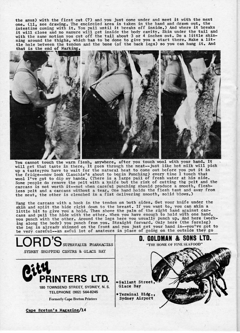 Published by Ronald Caplan on 1973/12/1 (846 reads)the anus) with the first cut (7) and you just come under and meet it with the next one. (11, see drawing. The encircled area is taken in the hand and drawn out, the intestine coming with it. You pull until it breaks off inside.) And where it breaks it will close and no manure will get inside the body cavity. Skin under the tail and with the same motion you cut off the tail about 3 or 4 inches out. Do a little skin? ning around the thighs, which has to be done to give you a start there. Make a lit? tle hole between the tendon and the bone (of the back legs) so you can hang it. And that is the end of Marking. You cannot touch the warm flesh, anywhere, after you touch wool with your hand. It will get that taste in there. It goes through the meat • just like hot milk will pick up a taste;y6u have to wait for the natural heat to come out before you put it in the fridge • now look (Lauchie's about to begin Punching) every time I touch that wool I've got to dip my hands. (There is a large pail of fresh water at his side. Some people do remove the pelt with a knife but the risk of cutting the pelt and the carcass is not worth it • not when careful punching should produce a smooth, flesh- less pelt and a carcass '''ithout a tear. One hand holds the flesh taut and away from the meat, the other is clenched in a fist delivering smooth, solid blows.) Hang the carcass with a hook in the tendon on both sides. Get your knife under the skin and split the hide right down to the breast. If you want to, you can skin a little bit to give you a hold. Then shove the palm of the right hand against car? cass and pull the hide with the other. When you have enough to hold with one hand, you punch with the other. Around the legs here you usually punch up. And here (work? ing along the body) you punch from you. Straight forward. Only here (the foreleg) the leg is already skinned on the front and you just get your hand in • you've got to be very careful • an a 'rful lot of amateurs in place of going on the outside they go LORD'S. 'SUPERVALUE PHARMACIES SYDNEY SHOPPING CENTRE & GLACE BAY • k PRINTERS LTD. 180 TOWNSEND STREET, SYDNEY, N.S. TELEPHONE (902) 564-8245 Formerly Cape Breton Printers Cape Breton's Maga2ine/14 D. GOLDMAN & SONS LTD. "THt: HOME OF FLNE SEAFOOD" • Gallant Street, Glace Bay • Terminal Bldg Sydney Airport