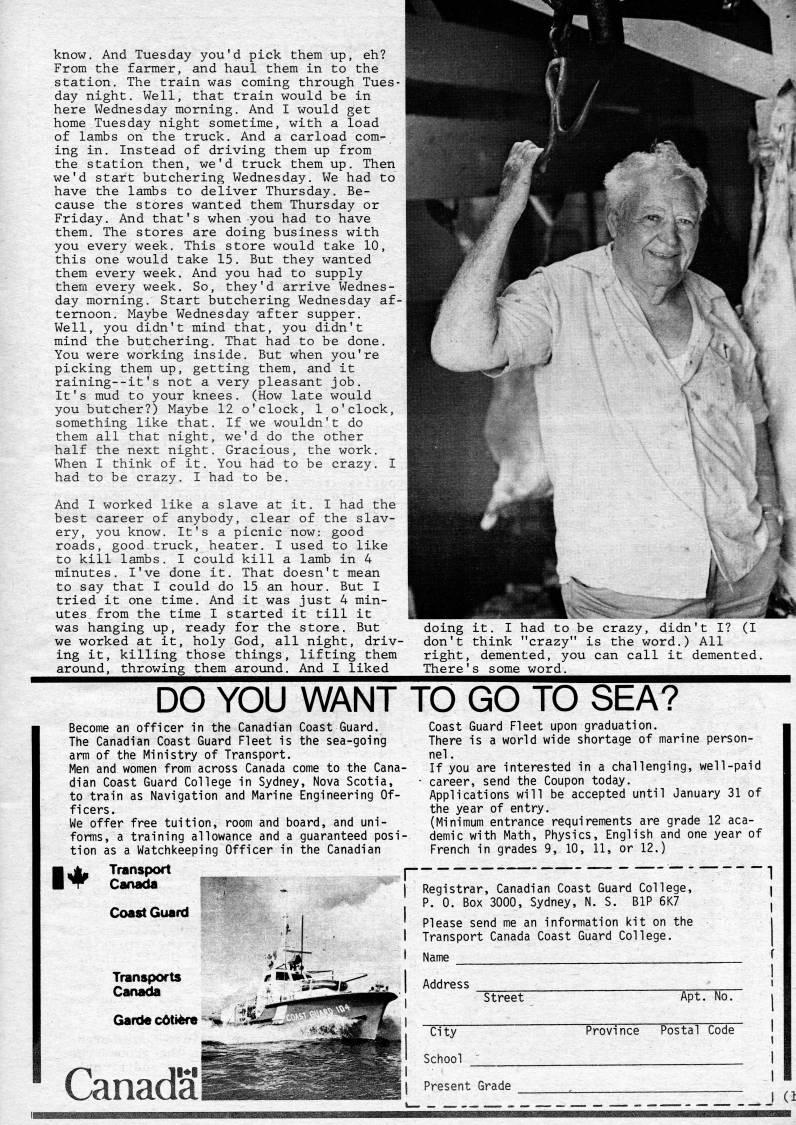 Published by Ronald Caplan on 1984/6/1 (305 reads)know. And Tuesday you'd pick them up, eh? From the farmer, and haul them in to the station. The train was coming through Tues? day night. Well, that train would be in here Wednesday morning. And I would get home Tuesday night sometime, with a load of lambs on the truck. And a carload com? ing in. Instead of driving them up from the station then, we'd truck them up. Then we'd start butchering Wednesday. We had to have the lambs to deliver Thursday. Be? cause the stores wanted them Thursday or Friday. And that's when you had to have them. The stores are doing business with you every week. This store would take 10, this one would take 15. But they wanted them every week. And you had to supply them every week. So, they'd arrive Wednes? day morning. Start butchering Wednesday af? ternoon. Maybe Wednesday 'after supper. Well, you didn't mind that, you didn't mind the butchering. That had to be done. You were working inside. But when you're picking them up, getting them, and it raining--it's not a very pleasant job. It's mud to your knees. (How late would you butcher?) Maybe 12 o'clock, 1 o'clock, something like that. If we wouldn't do them all that night, we'd do the other half the next night. Gracious, the work. When I think of it. You had to be crazy. I had to be crazy. I had to be. And I worked like a slave at it. I had the best career of anybody, clear of the slav? ery, you know. It's a picnic now: good roads, good truck, heater. I used to like to kill lambs, I could kill a lamb in 4 minutes, I've done it. That doesn't mean to say that I could do 15 an hour. But I tried it one time. And it was just 4 min? utes from the time I started it till it was hanging up, ready for the store. But we worked at it, holy God, all night, driv? ing it, killing those things, lifting them around, throwing them around. And I liked doing it. I don't think right There had to be "crazy" i demented, you some word. crazy, didn't I? (I s the word,) All can call it demented. DO YOU WANT TO GO TO SEA? Become an officer in the Canadian Coast Guard. The Canadian Coast Guard Fleet is the sea-going arm of the Ministry of Transport. Men and women from across Canada come to the Cana? dian Coast Guard College in Sydney, Nova Scotia, to train as Navigation and Marine Engineering Of? ficers. We offer free tuition, room and board, and uni? forms, a training allowance and a guaranteed posi? tion as a Watchkeeping Officer in the Canadian Transport r Canada • "' Coast Guard Transports CaruKla 1' Garde c6ti'fa Canada Coast Guard Fleet upon graduation. There is a world wide shortage of marine person? nel. If you are interested in a challenging, well-paid career, send the Coupon today. Applications will be accepted until January 31 of the year of entry. (Minimum entrance requirements are grade 12 aca? demic with Math, Physics, English and one year of French in grades 9, 10, 11, or 12.) Registrar, Canadian Coast Guard College, P. 0. Box 3000, Sydney, N. S. BIP 6K7 Please send me an information kit on the Transport Canada Coast Guard College. Name Address Street City School Province Apt. No. Postal Code Present Grade I (1