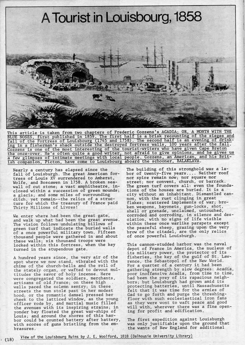 Published by Ronald Caplan on 1984/6/1 (597 reads)A Tourist in Louisbourg, 1858 This article is taken from two chapters of Frederic Cozzens's ACADIA; OR, A MONTH WITH THE BLUE NOSES, first published in 1859. The first half is a brisk recounting of the sieges and fall of the Fortress of Louisbourg (1745 and 1758). The second half is an evening of drinlc' ing in a fisherman's shack outside the destroyed fortress walls, 100 years after the fallT Cozzens is one of the most interesting of the tourist-writers who have given Cape Breton the once--over. He's often quite a good writer, not afraid to give opinions, and he gives us a few glimpses of intimate meetings with local people. Cozzens, an American, and his Brit? ish companion. Picton, have come to Louisbourg aboard the schooner, BALAKLAVA. Nearly a century has elapsed since the fall of Louisburgh. The great American for? tress of Louis XV surrendered to Amherst, Wolfe, and Boscawen in 1758. A broken sea? wall of cut stone; a vast amphitheatre, in? closed within a succession of green mounds; a glacis; and some miles of surrounding ditch, yet remain--the relics of a struc? ture for which the treasury of France paid Thirty Millions of Livres! We enter where had been the great gate, and walk up what had been the great avenue. The vision follows undulating billows of green turf that indicate the buried walls of a once powerful military town. Fifteen thousand people were gathered in and about these walls; six thousand troops were locked within this fortress, when the key turned in the stupendous gate. A hundred years since, the very air of the spot where we now stand, vibrated with the chime of the church-bells and the roll of the stately organ, or wafted to devout mul? titudes the savor of holy incense. Here were congregated the soldiers, merchants, artisans of old France; on these high walls paced the solemn sentry; in these streets the nun stole past in her modest hood; or the romantic damsel pressed her cheek to the latticed window, as the young officer rode by, and martial music filled the avenues with its inspiring strains; in yonder bay floated the great war-ships of Louis; and around the shores of this har? bor could be counted battery after battery, with scores of guns bristling from the em? brasures . The building of this stronghold was- a la? bor of twenty-five years.... Neither roof nor spire remain now; nor square nor street; nor convent, church, or barrack. The green turf covers all: even the founda? tions of the houses are buried. It is a city without an inhabitant. Dismantled can? non, with the rust clinging in great flakes; scattered implements of war; bro? ken weapons , bayonets, gun-locks, shot, shell or grenade, unclaimed, untouched, corroded and corroding, in silence and des? olation, with no signs of life visible within these once warlike parapets except the peaceful sheep, grazing upon the very brow of the citadel, are the only relics of once powerful Louisburgh. This cannon-studded harbor was the naval depot of France in America, the nucleus of its military power, the protector of its fisheries, the key of the gulf of St, Law? rence, the Sebastopol of the New World. For a quarter of a century it had been gathering strength by slow degrees: Acadia, poor inoffensive Acadia, from time to time, had been the prey of its rapacious neigh? bors; but Louisburgh had grown amid its protecting batteries, until Massachusetts felt that it was time for the armies of Gad to go forth and purge the threshing- floor with such ecclesiastical iron fans as they were wont to waft peace and good will with, wherever there was a fine open? ing for profit and edification. The first expedition against Louisburgh was only justifiable upon the ground that the wants of New England for additional (18) View of the Louisbourg Ruins by J. E. Woolford, 1818 (Dalhousie University Library)