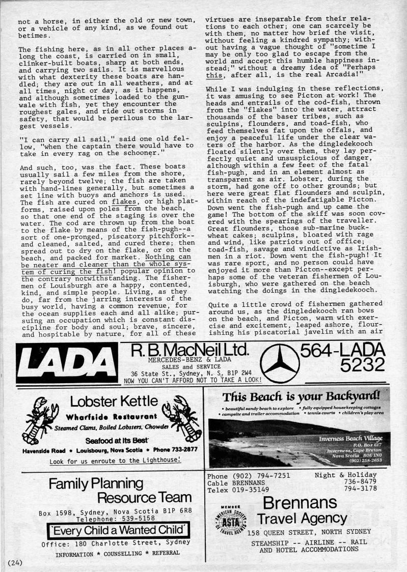 Published by Ronald Caplan on 1984/6/1 (334 reads)not a horse, in either the old or new town, or a vehicle of any kind, as we found out betimes. The fishing here, as in all other places a- long the coast, is carried on in small, clinker-built boats, sharp at both ends, and carrying two sails. It is marvellous with what dexterity these boats are han? dled; they are out in all weathers, and at all times, night or day, as it happens, and although sometimes loaded to the gun? wale with fish, yet they encounter the roughest gales, and ride out storms in safety, that would be perilous to the lar? gest vessels. "I can carry all sail," said one old fel? low, "when the captain there would have to take in every rag on the schooner." And such, too, was the fact. These boats usually sail a few miles from the shore, rarely beyond twelve; the fish are taken with hand-lines generally, but sometimes a set line with buoys and anchors is used. The fish are cured on flakes, or high plat? forms, raised upon poles from the beach, so that one end of the staging is over the water. The cod are thrown up from the boat to the flake by means of the fish-pugh--a sort of one-pronged, piscatory pitchfork-- and cleaned, salted, and cured there; then spread out to dry on the flake, or on the beach, and packed for market. Nothing can be neater and cleaner than the whole sys' tem of curing the fish! popular opinion to the contrary notwithstanding. The fisher? men of Louisburgh are a happy, contented, kind, and simple people. Living, as they do, far from the jarring interests of the busy world, having a common revenue, for the ocean supplies each and all alike; pur? suing an occupation which is constant dis? cipline for body and soul; brave, sincere, and hospitable by nature, for all of these virtues are inseparable from their rela? tions to each other; one can scarcely be with them, no matter how brief the visit, without feeling a kindred sympathy; with? out having a vague thought of "sometime I may be only too glad to escape from the world and accept this humble happiness in? stead;" without a dreamy idea of "Perhaps this, after all, is the real Arcadia!" While I was indulging in these reflections, it was amusing to see Picton at work! The heads and entrails of the cod-fish, thrown from the "flakes" into the water, attract thousands of the baser tribes, such as sculpins, flounders, and toad-fish, who feed themselves fat upon the offals, and enjoy a peaceful life under the clear wa? ters of the harbor. As the dingledekooch floated silently over them, they lay per? fectly quiet and unsuspicious of danger, although within a few feet of the fatal fish-pugh, and in an element almost as transparent as air. Lobster, during the storm, had gone off to other grounds; but here were great flat flounders and sculpin, within reach of the indefatigable Picton. Down went the fish-pugh and up came the game! The bottom of the skiff was soon cov? ered with the spearings of the traveller. Great flounders, those sub-marine buck? wheat cakes; sculpins, bloated with rage and wind, like patriots out of office; toad-fish, savage and vindictive as Irish? men in a riot. Down went the fish-pugh! It was rare sport, and no person could have enjoyed it more than Picton--except per? haps some of the veteran fishermen of Lou? isburgh, who were gathered on the beach watching the doings in the dingledekooch. Quite a little crowd of fishermen gathered around us, as the dingledekooch ran bows on the beach, and Picton, warm with exer? cise and excitement, leaped ashore, flour? ishing his piscatorial javelin with an air R.B. MacNeil Ltd. MERCEDES-BENZ & LADA SALES and SERVICE 36 State St., Sydney, N. S'. BIP 2W4 NOW YOU CAN'T AFFORD NOT TO TAKE A LOOK 564-LADA 5232 Lobster Kettle WhQfftid* R??tourqnl Steamed Ckuns, Boiled Lobsters, Choy'dei Seafood at Its Best' Road • Louisbourg. Nova Scotia * Phona 733>2877 Look for us enroute to the Lighthouse! Tfus Beach isyom Backyardl • beautiful sandy beach to explore * fiilly equipped housekeeping cottages • t'mpsite and trailer accommodation • tenniscourts • children's play area Family Planning Resource Team Box 1598, Sydney, Nova Scotia BIP 6R8 Telephone: 539-5158 I Every Child a Wanted Child' | Office: 180 Charlotte Street, Sydney INFORMATION * COUNSELLING * REFERRAL Phone (902) 794- Cable BRENNANS Telex 019-35149 7251 Night & Holiday 736-8479 794-3178 Brennans C'l Travel Agency 'mi'' 158 QUEEN STREET, NORTH SYDNEY STEAMSHIP -- AIRLINE -- RAIL AND HOTEL ACCOMMODATIONS (24)