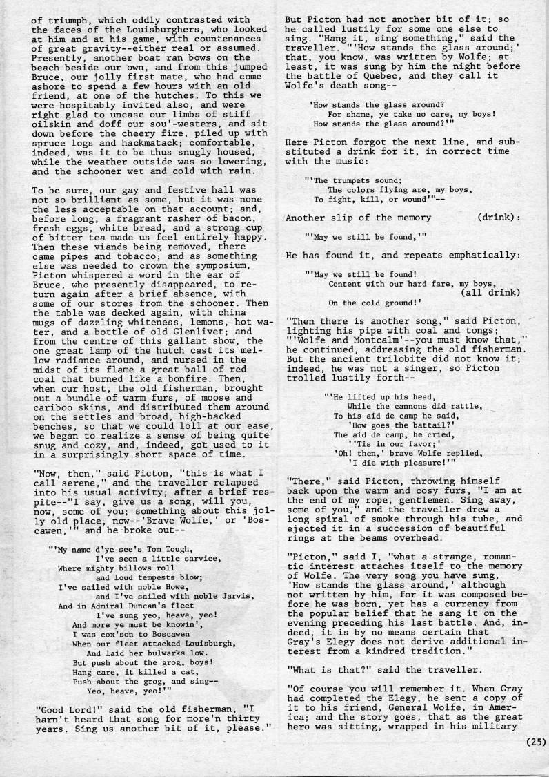 Published by Ronald Caplan on 1984/6/1 (263 reads)of triumph, which oddly contrasted with the faces of the Louisburghers, who looked at him and at his game, with countenances of great gravity--either real or assumed. Presently, another boat ran bows on the beach beside our own, and from this jumped Bruce, our jolly first mate, who had come ashore to spend a few hours with an old friend, at one of the hutches. To this we were hospitably invited also, and were right glad to uncase our limbs of stiff oilskin and doff our sou'-westers, and sit down before the cheery fire, piled up with spruce logs and hackmatack; comfortable, indeed, was it to be thus snugly housed, while the weather outside was so lowering, and the schooner wet and cold with rain. To be sure, our gay and festive hall was not so brilliant as some, but it was none the less acceptable on that account; and, before long, a fragrant rasher of bacon, fresh eggs, white bread, and a strong cup of bitter tea made us feel entirely happy. Then these viands being removed, there came pipes and tobacco; and as something else was needed to crown the s3niiposium, Picton whispered a word in the ear of Bruce, who presently disappeared, to re? turn again after a brief absence, with some of our stores from the schooner. Then the table was decked again, with china mugs of dazzling whiteness, lemons, hot wa? ter, and a bottle of old Glenlivet; and from the centre of this gallant show, the one great lamp of the hutch cast its mel? low radiance around, and nursed in the midst of its flame a great ball of red coal that burned like a bonfire. Then, when our host, the old fisherman, brought out a bundle of warm furs, of moose and cariboo skins, and distributed them around on the settles and broad, high-backed benches, so that we could loll at our ease, we began to realize a sense of being quite snug and cozy, and, indeed, got used to it in a surprisingly short space of time. "Now, then," said Picton, "this is what I call serene," and the traveller relapsed into his usual activity; after a brief res- pite--"I say, give us a song, will you, now, some of you; something about this jol? ly old place, now--'Brave Wolfe,' or 'Bos? cawen,'" and he broke out-- '"My name d'ye see's Tom Tough, I've seen a little sarvice. Where mighty billows roll and loud tempests blow; I've sailed with noble Howe, and I've sailed with noble Jarvis, And in Admiral Duncan's fleet I've sung yeo, heave, yeo! And more ye must be knowin', I was cox'son to Boscawen When our fleet attacked Louisburgh, And laid her bulwarks low. But push about the grog, boys! Hang care, it killed a cat. Push about the grog, and sing • Yeo, heave, yeo!'" "Good Lord!" said the old fisherman, "I harn't heard that song for more'n thirty years. Sing us another bit of it, please." But Picton had not another bit of it; so he called lustily for some one else to sing. "Hang it, sing something," said the traveller. "'How stands the glass around;' that, you know, was written by Wolfe; at least, it was sung by him the night before the battle of Quebec, and they call it Wolfe's death song-- 'How stands the glass around? For shame, ye take no care, my boys! How stands the glass around?'" Here Picton forgot the next line, and sub? stituted a drink for it, in correct time with the music: "'The trumpets sound; The colors flying are, my boys. To fight, kill, or wound'" • Another slip of the memory (drink): "'May we still be found,'" He has found it, and repeats emphatically: "'May we still be found! Content with our hard fare, On the cold ground!' my boys, (all drink) "Then there is another song," said Picton, lighting his pipe, with coal and tongs; '"Wolfe and Montcalm'--you must know that," he continued, addressing the old fisherman. But the ancient trilobite did not know it; indeed, he was not a singer, so Picton trolled lustily forth-- "'He lifted up his head. While the cannons did rattle. To his aid de camp he said, 'How goes the battail?' The aid de camp, he cried, ''Tis in our favor;' 'Oh! then,' brave Wolfe replied, 'I die with pleasure!'" "There," said Picton, throwing himself back upon the warm and cosy furs, "I am at the end of my rope, gentlemen. Sing away, some of you," and the traveller drew a long spiral of smoke through his tube, and ejected it in a succession of beautiful rings at the beams overhead. "Picton," said I, "what a strange, roman? tic interest attaches itself to the memory of Wolfe. The very song you have sung, 'How stands the glass around,' although not written by him, for it was composed be? fore he was born, yet has a currency from the popular belief that he sang it on the evening preceding his last battle. And, in? deed, it is by no means certain that Gray's Elegy does not derive additional in? terest from a kindred tradition." "What is that?" said the traveller. "Of course you will remember it. When Gray had completed the Elegy, he sent a copy of it to his friend. General Wolfe, in Amer? ica; and the story goes, that as the great hero was sitting, wrapped in his military (25)