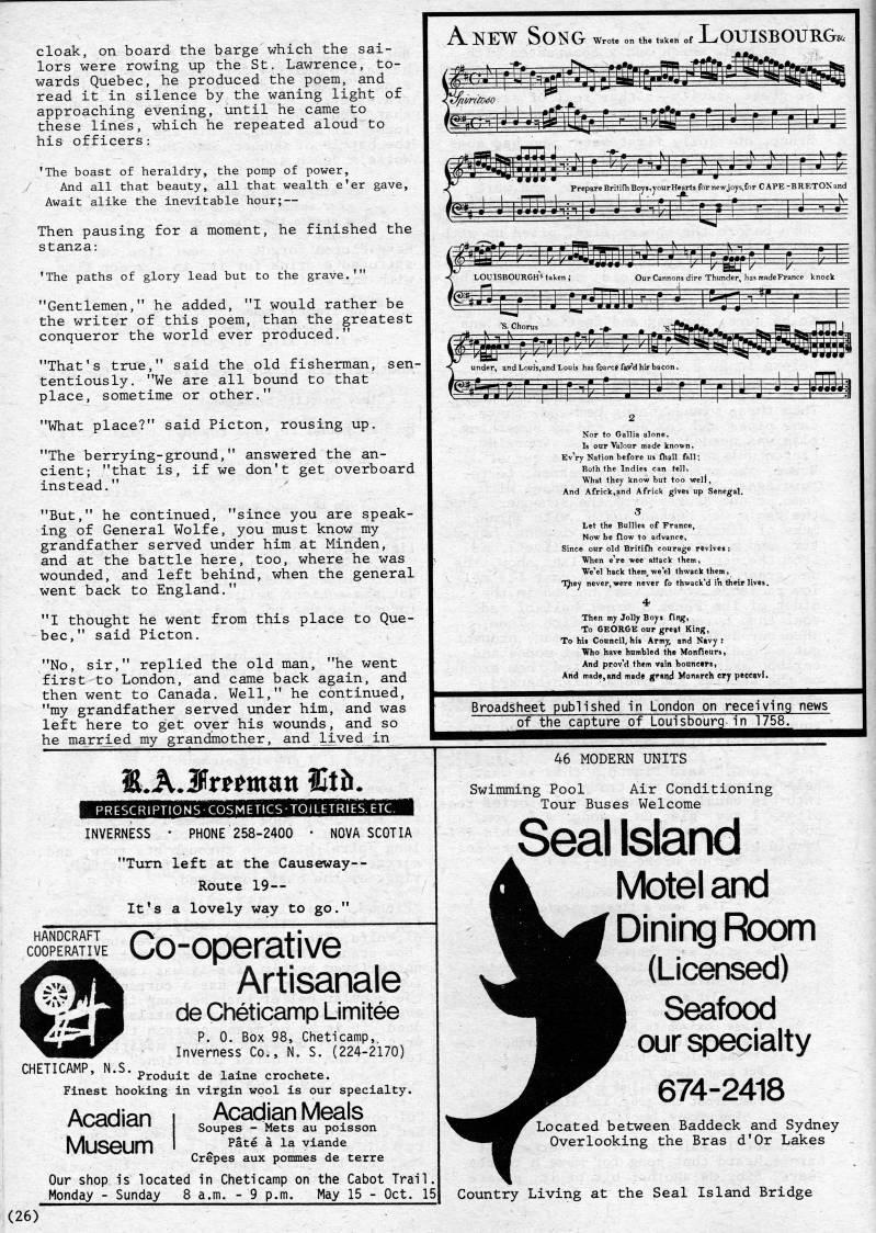 Published by Ronald Caplan on 1984/6/1 (269 reads)cloak, on board the barge which the sai? lors were rowing up the St. Lawrence, to? wards Quebec, he produced the poem, and read it in silence by the waning light of approaching evening, until he came to these lines, which he repeated aloud to his officers: 'The boast of heraldry, the pomp of power. And all that beauty, all that wealth e'er gave, Await alike the inevitable hour; • Then pausing for a moment, he finished the stanza: 'The paths of glory lead but to the grave.'" "Gentlemen," he added, "I would rather be the writer of this poem, than the greatest conqueror the world ever produced." "That's true," said the old fisherman, sen? tentious ly. "We are all bound to that place, sometime or other." "What place?" said Picton, rousing up. "The berrying-ground," answered the an? cient; "that is, if we don't get overboard instead." "But," he continued, "since you are speak? ing of General Wolfe, you must know my grandfather served under him at Minden, and at the battle here, too, where he was wounded, and left behind, when the general went back to England." "I thought he went from this place to Que? bec," said Picton. "No, sir," replied the old man, "he went first to London, and came back again, and then went to Canada. Well," he continued, "my grandfather served under him, and was left here to get over his wounds, and so he maj:rj.ed my granctoiother, and lived in A:NEW Song wrote o • the taken of LOUISBOURGs. Nor to Gallia alone, Is our Valour made known, Ev'ry Nation before us fhall fall; Both the Indies can tell, "What they know but too -wrell. And Africk,and Africk gives up Senegal. Let the Bullies of France, Now be flo-w to advance. Since our old Britifh courage revives ; ??When e're -wee attack them, We'el hack them, we'el thwack them, TJiey never, were never fo thwackM in tlieii Then my Jolly Boys ting. To GEORGE our gre??t King, To hii Conneil.his Army' and Navy ; Who have hnmbled the Monfieurs, And prov'd them vain bouncers, And made, and made gf*rd Monarch ery peeegvi. Broadstteet published in London on receiving news of the capture of Louisbourg.in 1758. ??ililiti8nitJMiW*Hiltil4>'ttMHtii